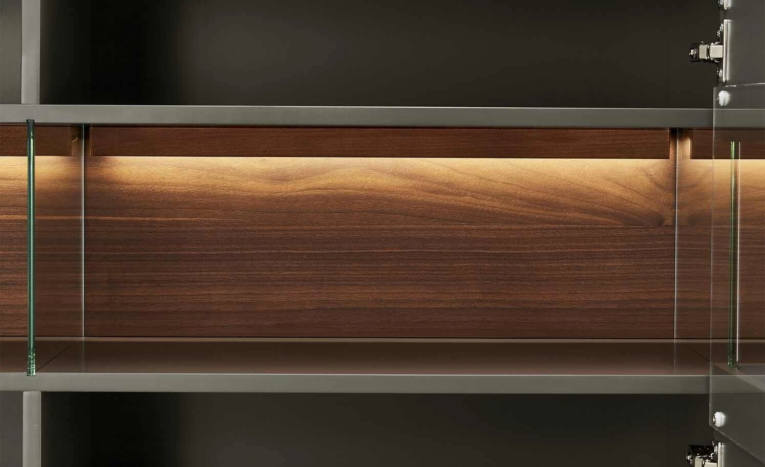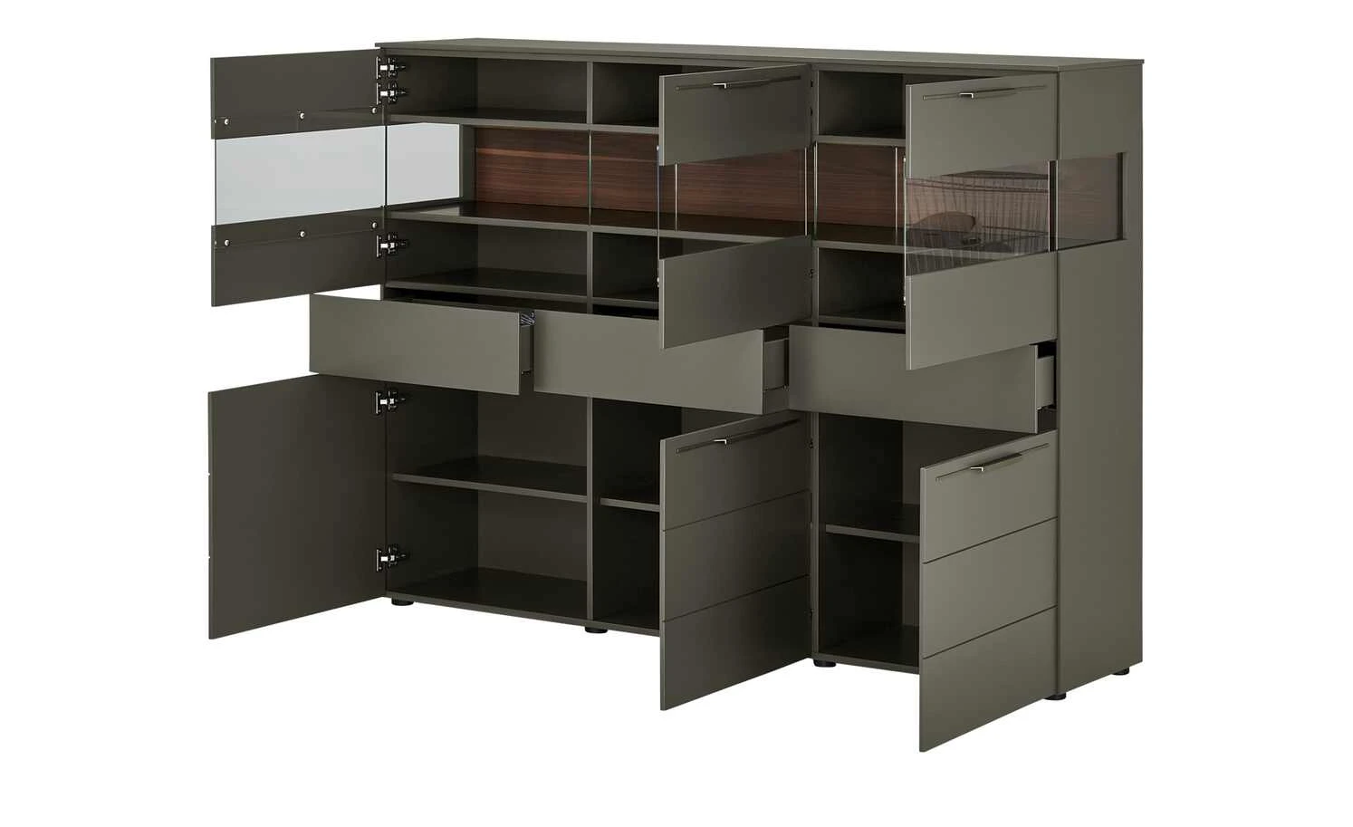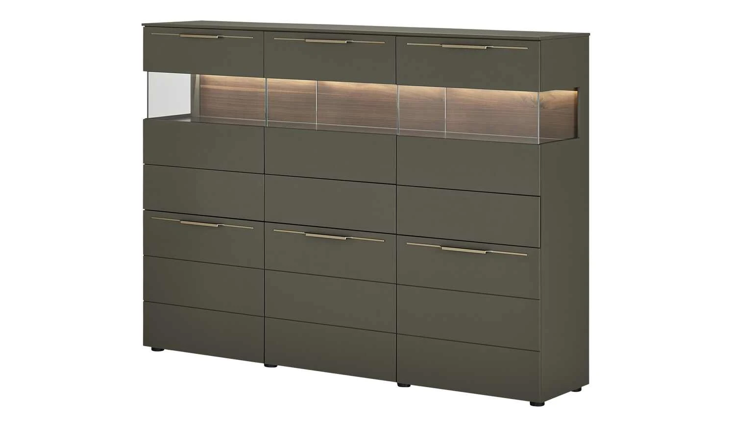 - Mehr zur Ausführung: 3 Holztüren und 3 Türen mit Glaseinsatz, Korpus mit Seitenverglasung