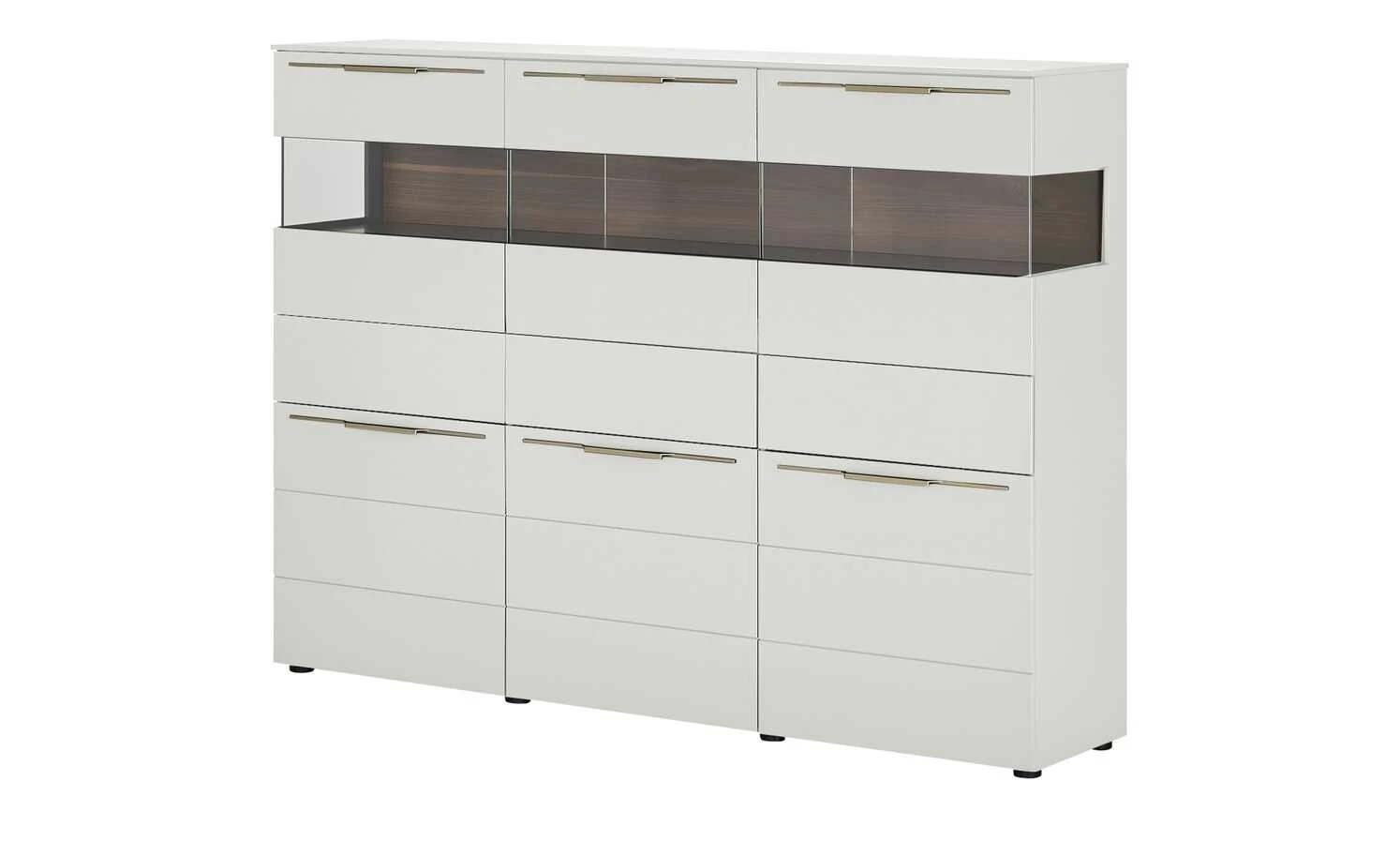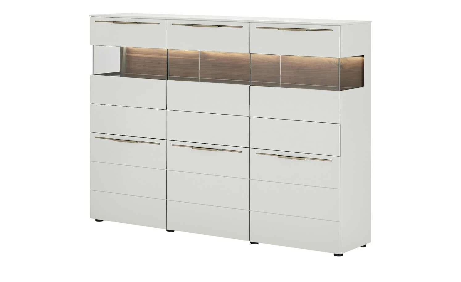 - Mehr zur Ausführung: 3 Holztüren und 3 Türen mit Glaseinsatz, Korpus mit Seitenverglasung