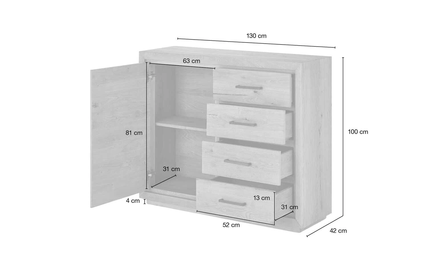 Stauraum für Wohnzimmer oder Essbereich, den bietet die Kommode Black Coast One von Gray & Jones. Links steht Ihnen eine Tür mit zwei Fächern dahinter zur Verfügung. Rechts hat die Kommode vier geräumige Schubladen. Dank der Soft-Close-Funktion schließen Tür und Schubladen langsam und leise. Black Coast ist mit Eichenholz furniert und zusätzlich lackiert worden. Für einen guten Stand ist der Sockel aus massiver Eiche gefertigt worden. Das Holz zeichnet sich durch seine Qualität und ausgeprägte Maserung aus.
