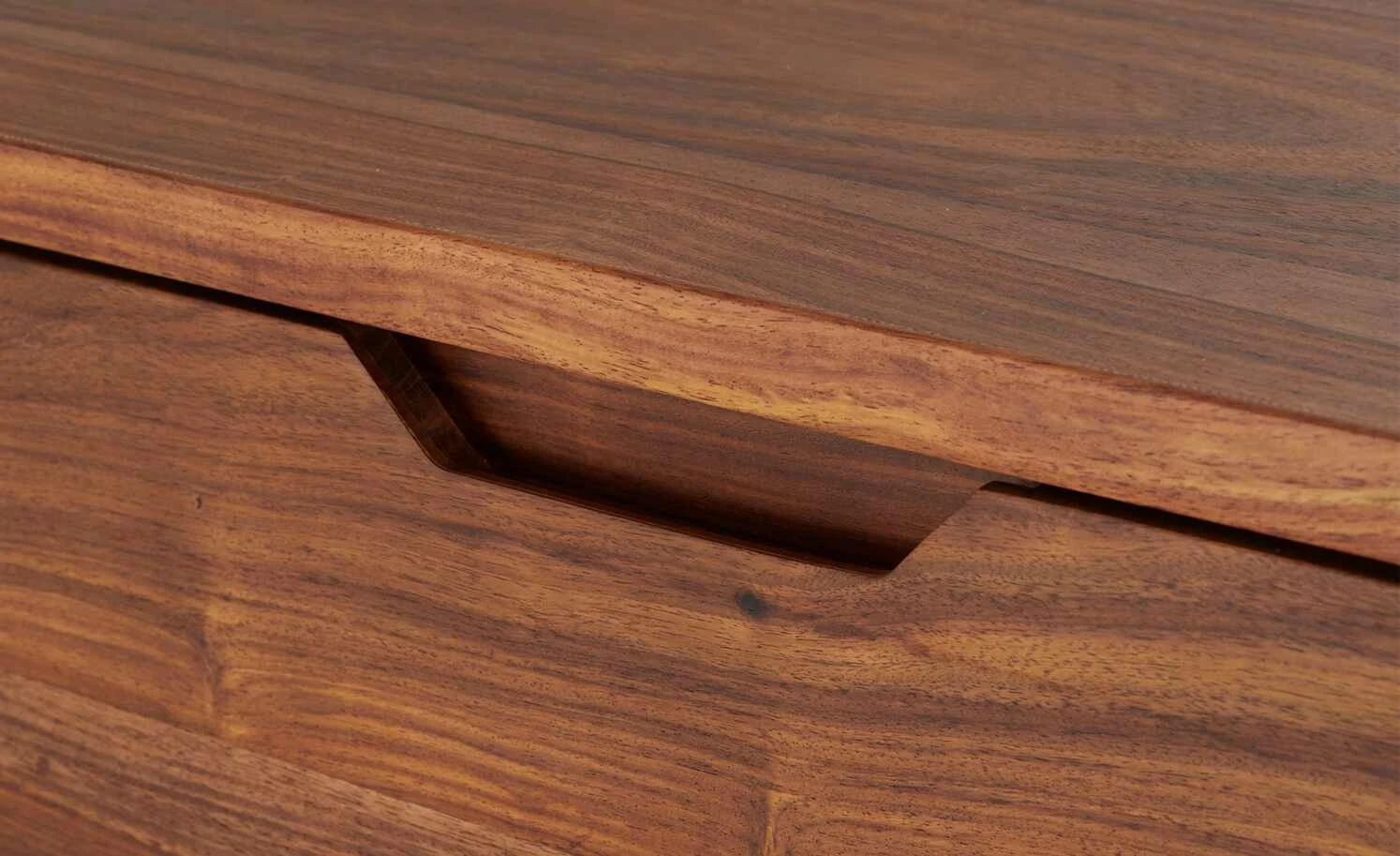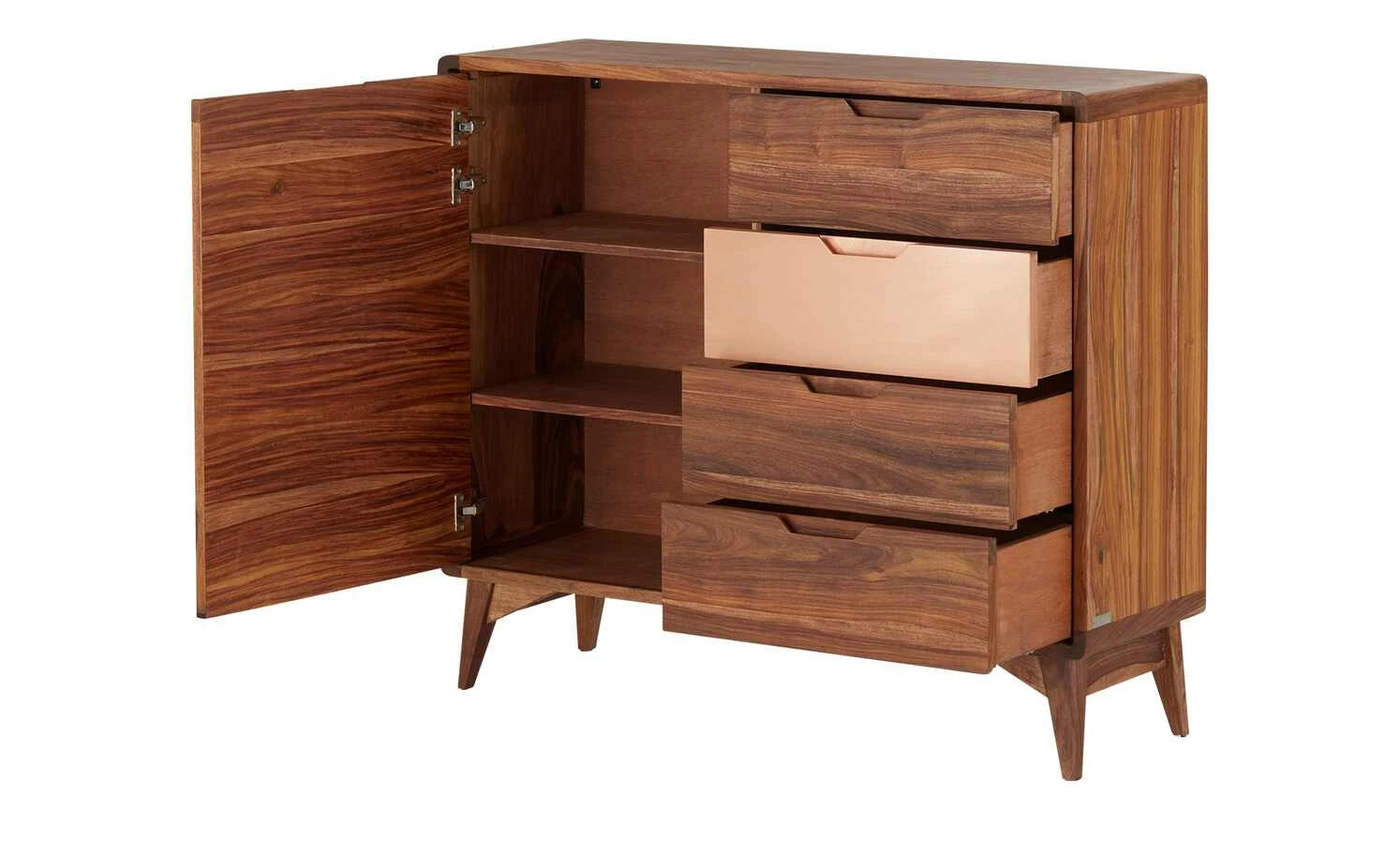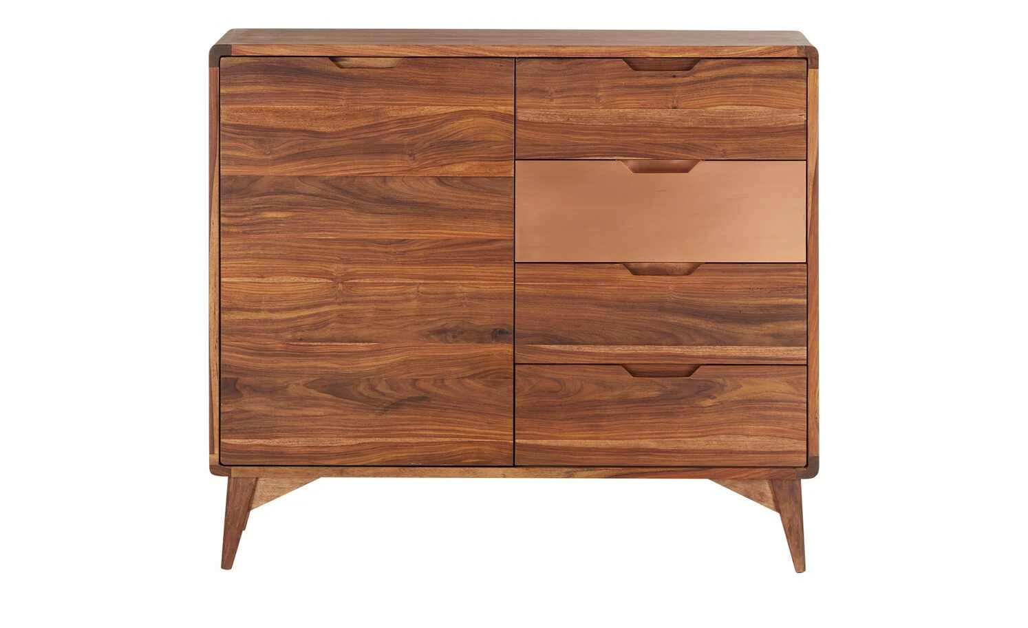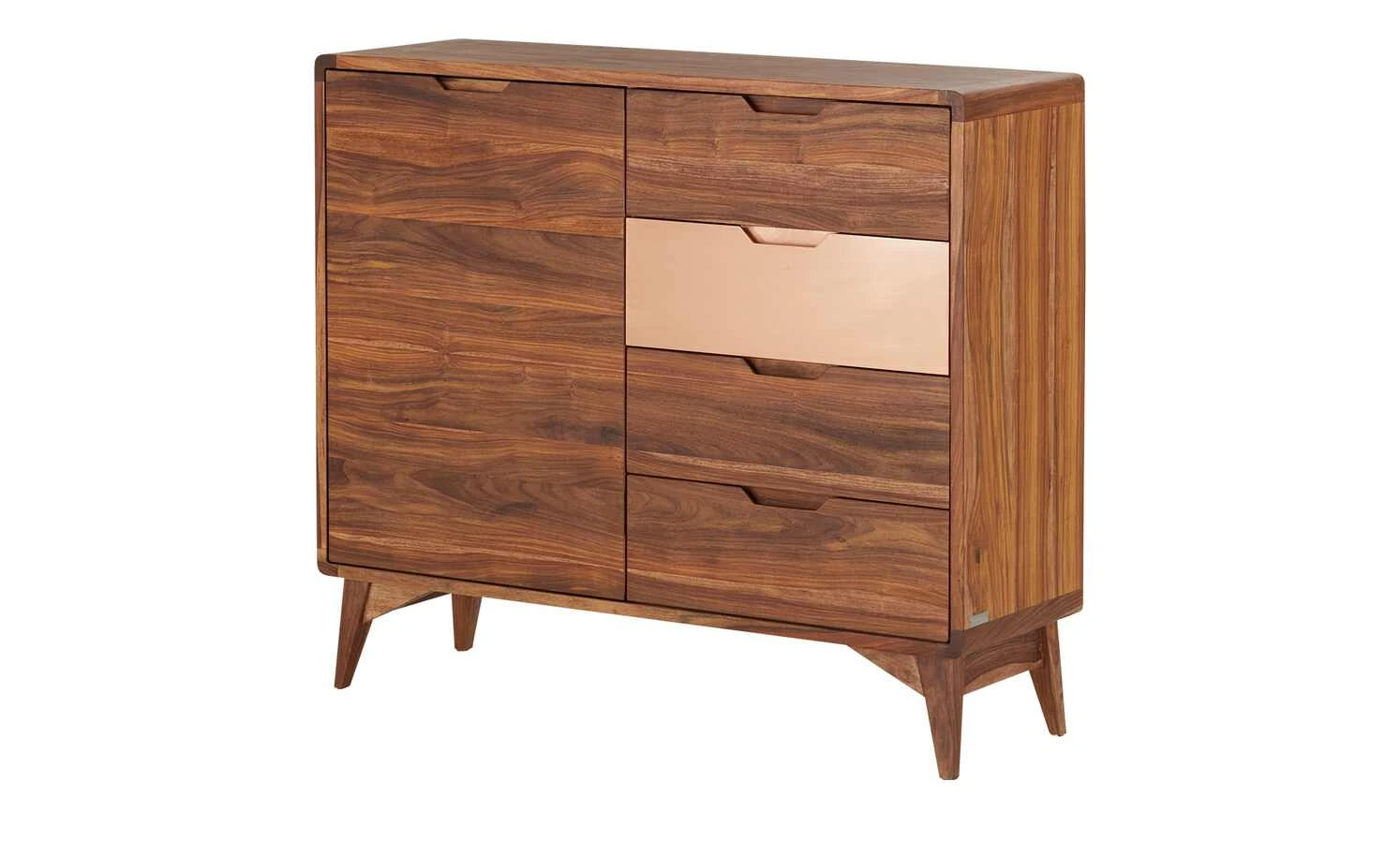 - Mehr zum Material: Front und Korpus Sheesham furniert, Lackbeschichtung Natur / 1 Schubkastenfront mit Kupfer handbeschlagen, lackiert