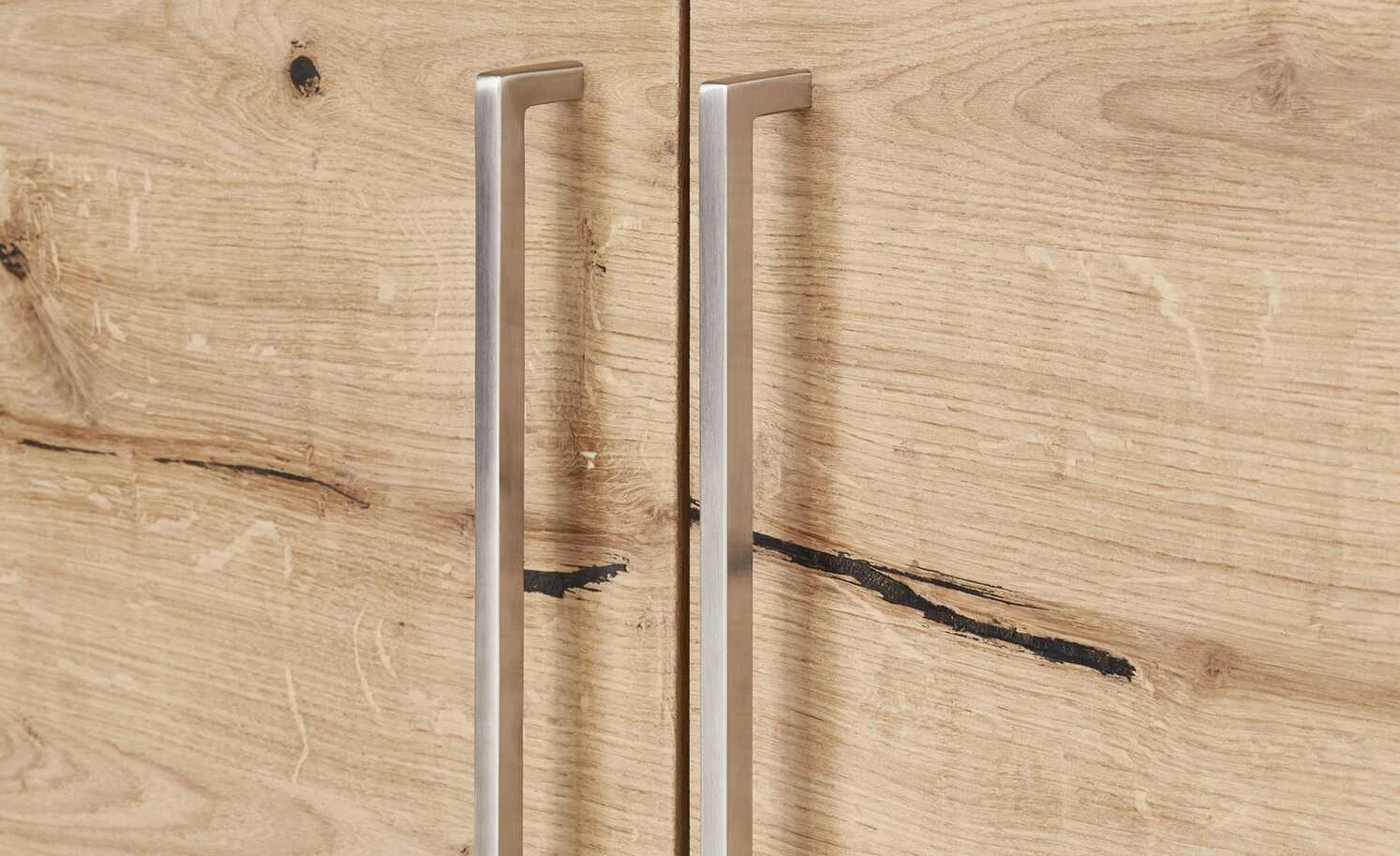 Natürlich und skandinavisch-modern wirkt das Sideboard Cap Ferrat One von der Marke Gray & Jones. Front und Korpus sind hochwertig furniert, für die Füße ist Massivholz verwendet worden. Das Eichenholz hat eine attraktive Maserung mit Asteinschlüssen als Eyecatcher. Die natürlichen Risse wurden schwarz verfüllt. Damit sie voll zur Geltung kommen, ist auf eine zusätzliche Oberflächenbehandlung verzichtet worden. Einziger Akzent: gebürstete Metallgriffe. Cap Ferrat One ist links mit zwei Türen und rechts mit drei Schubladen ausgestattet. Sie haben eine Soft-Close-Funktion und schließen geräuscharm.