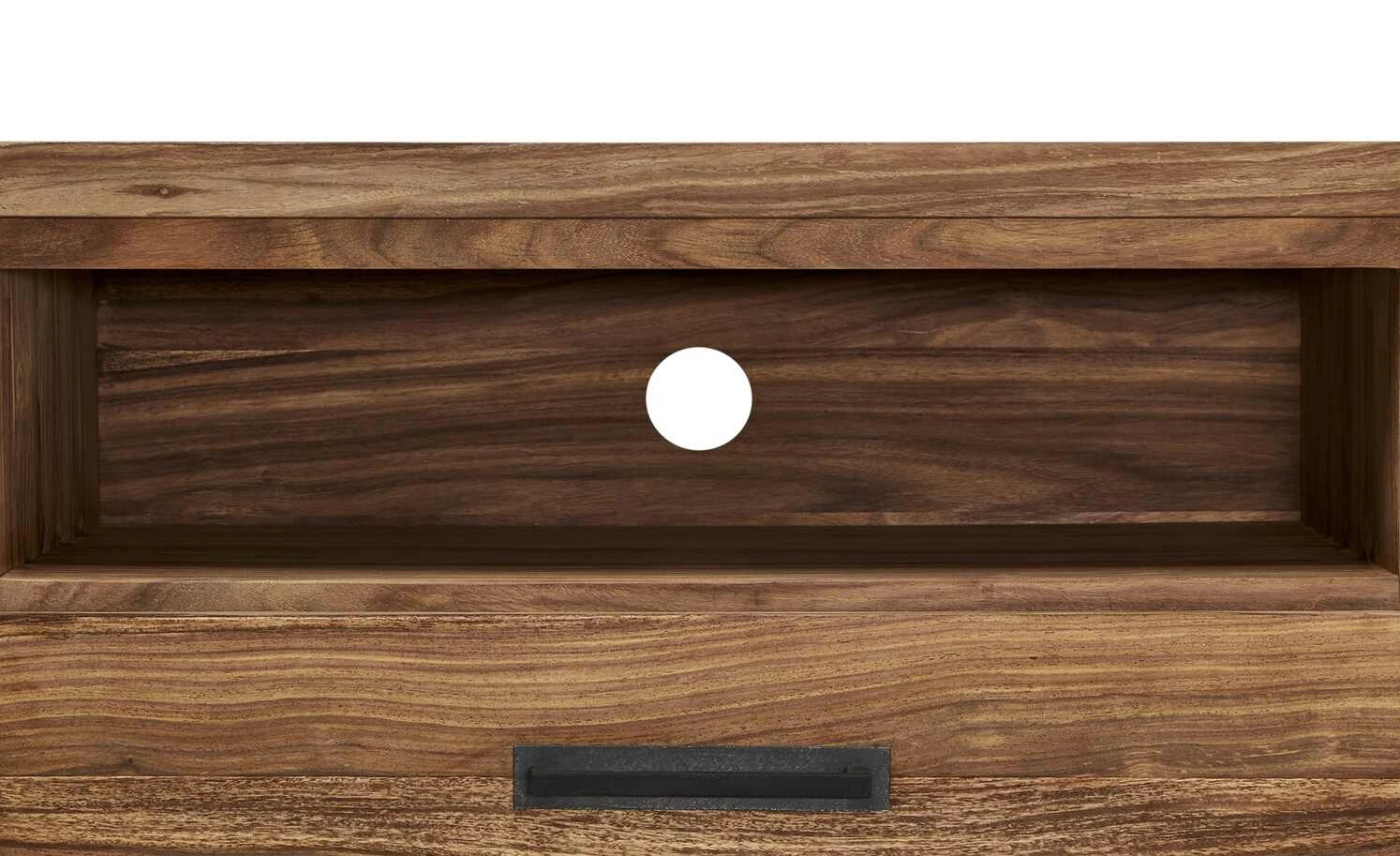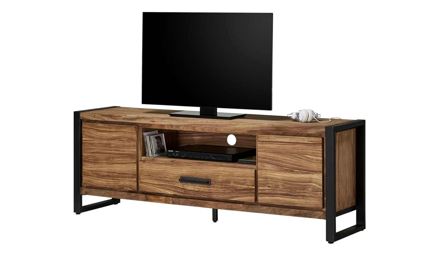 Setzen Sie Ihren Fernseher in Szene – und zwar auf dem TV-Lowboard Tierra Fuego One von Gray & Jones. Es hat einen angesagten Industrial-Look. Front und Korpus sind mit Sheesham furniert. Diese Holzart aus Indien zeichnet sich durch ihre auffällige Maserung aus. Als Kontrast zum natürlichen Flair ist das Gestell aus schwarzem Eisen gefertigt, was den Factory-Style zur Geltung bringt. Mittig hat das Lowboard ein Gerätefach mit einem Kabeldurchlass in der Rückwand. Für Stauraum ist auch gesorgt: Tierra Fuego One verfügt über zwei Türen mit Push-to-Open und eine Schublade mit Soft-Close-Ausstattung für leises Schließen.