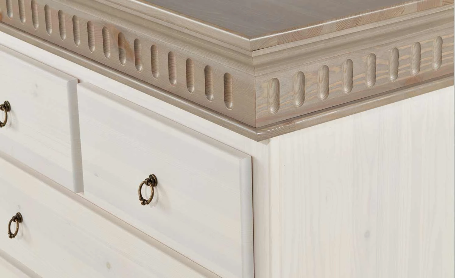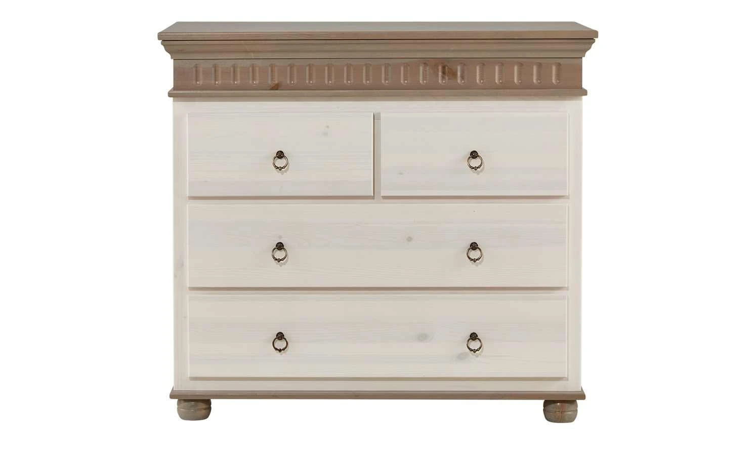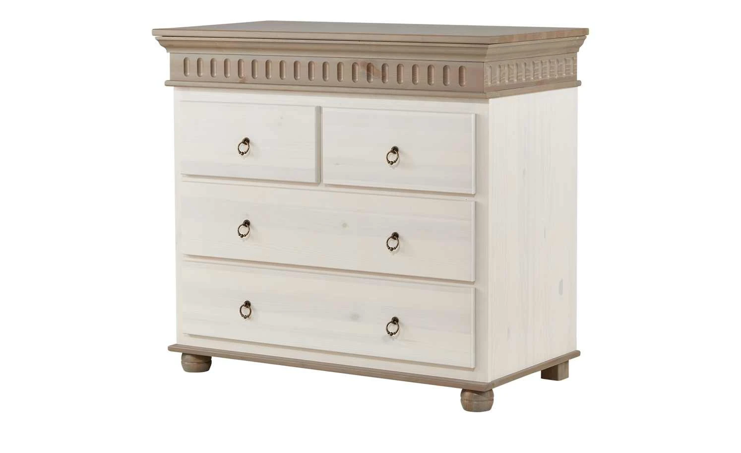 Die Kommode Bornholm hat einen nostalgischen Landhausstil. Bornholm wurde in zwei Farbtönen gestaltet: Korpus und Front sind weiß gewachst. Die Ober- und die Bodenplatte mit Füßen setzen sich in lavafarbener Kiefer ab. Sie sind lackiert. Bornholm besteht komplett aus massiver Kiefer – und ist dadurch stabil, robust und langlebig. Der natürliche Holz-Look schimmert durch Wachs und Lack hindurch. Die Kommode hat vier Schubladen, die jeweils mit runden Zug-Griffen im Used-Look ausgestattet sind.