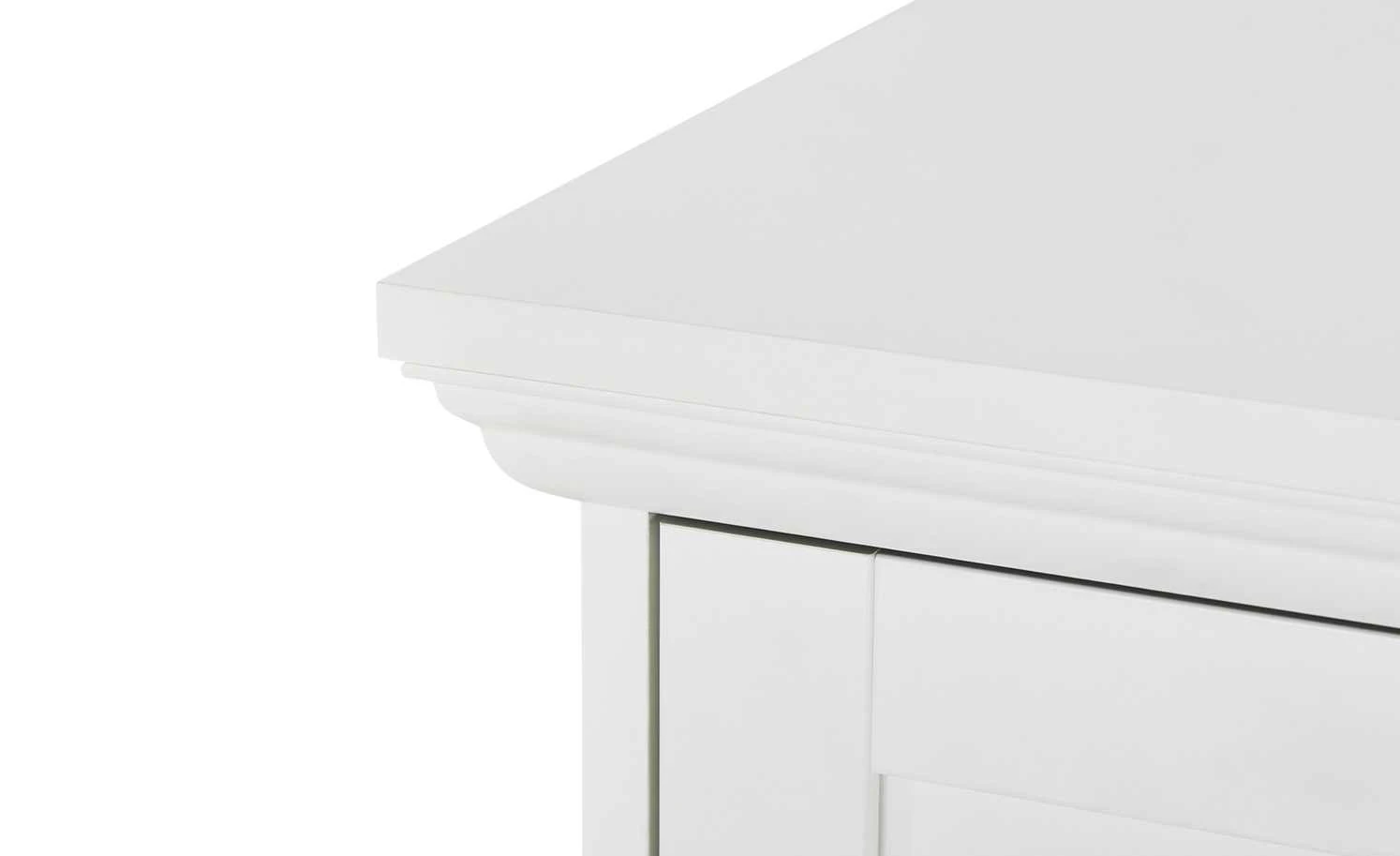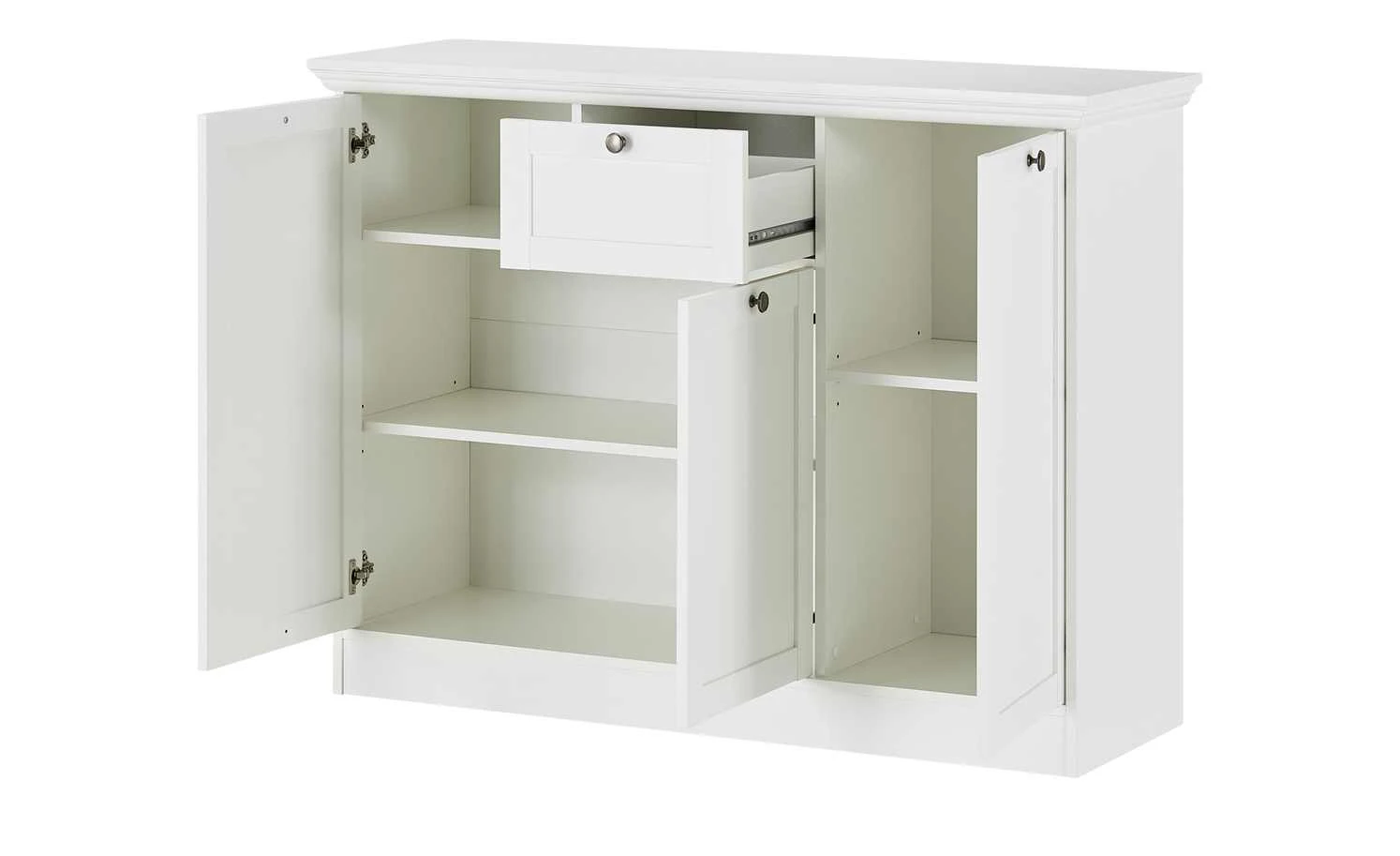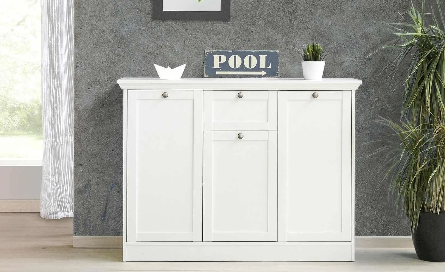 Die Kommode Laurito punktet mit ihrem hübschen Landhauscharme, der reduziert und elegant wirkt. Die feinen Linien werden mit einem strahlenden Weißton kombiniert. Metallgriffe im Vintagedesign setzen punktuelle Akzente – und sind natürlich auch praktisch. Laurito verfügt nämlich über drei Türen. Dahinter finden Sie fünfgeräumige Fächer mit höhenverstellbaren Einlegeböden. Zusätzlich steht Ihnen eine Schublade zur Verfügung. Die Oberflächen sind beschichtet, was sie strapazierfähig und pflegeleicht macht.