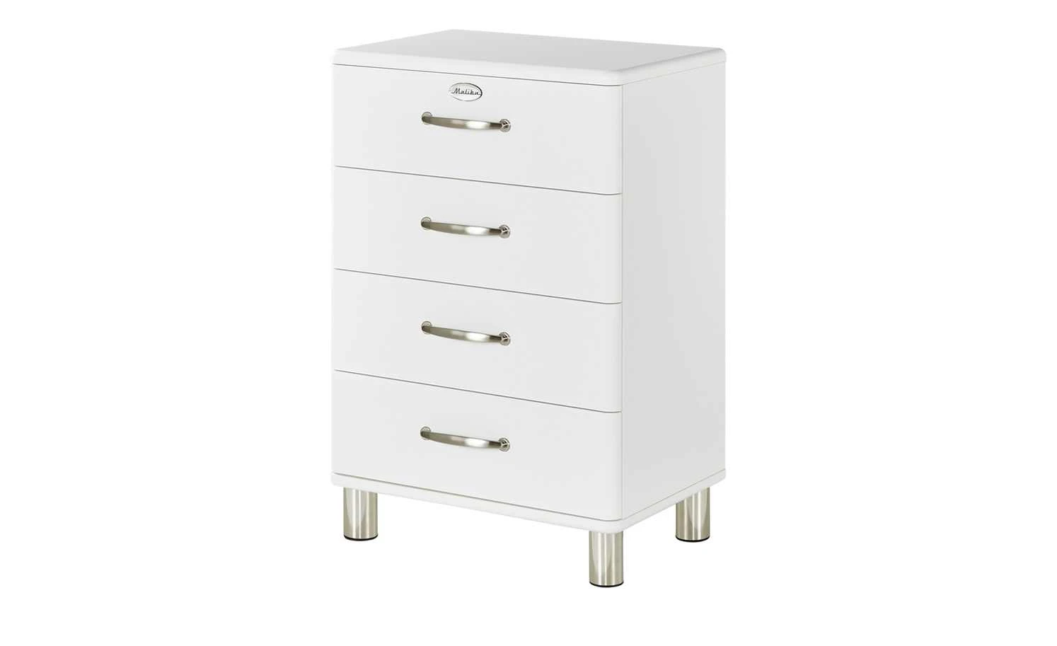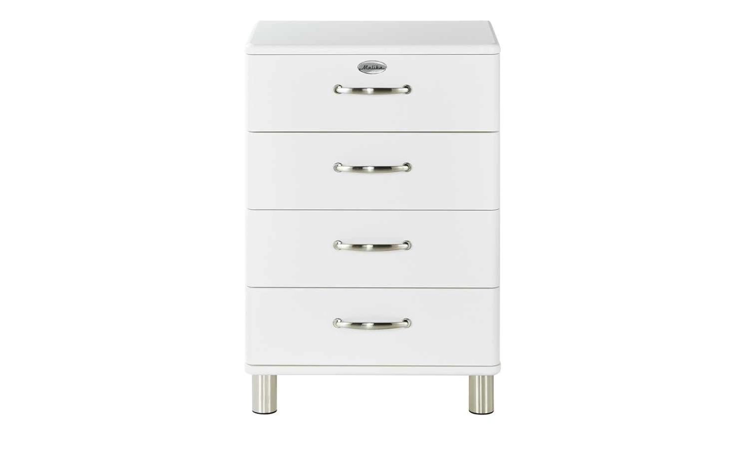Modernität und Retrodesign im Fifties-Style vereinen sich in der Kommode Malibu. Die Kommode ist matt lackiert und fällt durch ihre coole Farbgebung auf. Die Griffe und zylindrischen Füße aus Metall setzen kontrastreiche und moderne Akzente. Ob in Wohnbereich, Büro oder Jugendzimmer – diese Kommode ist mit ihren vier Schubfächern ein absolutes Highlight.