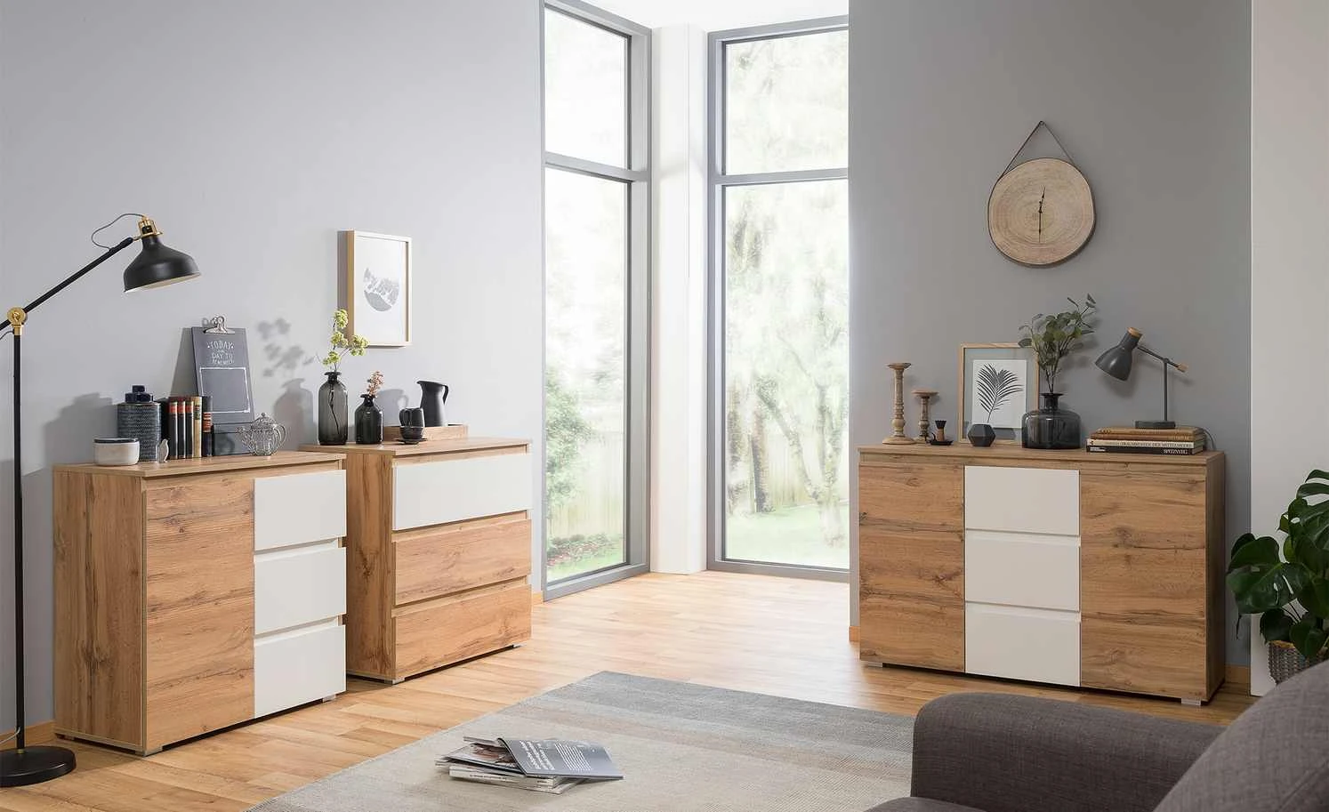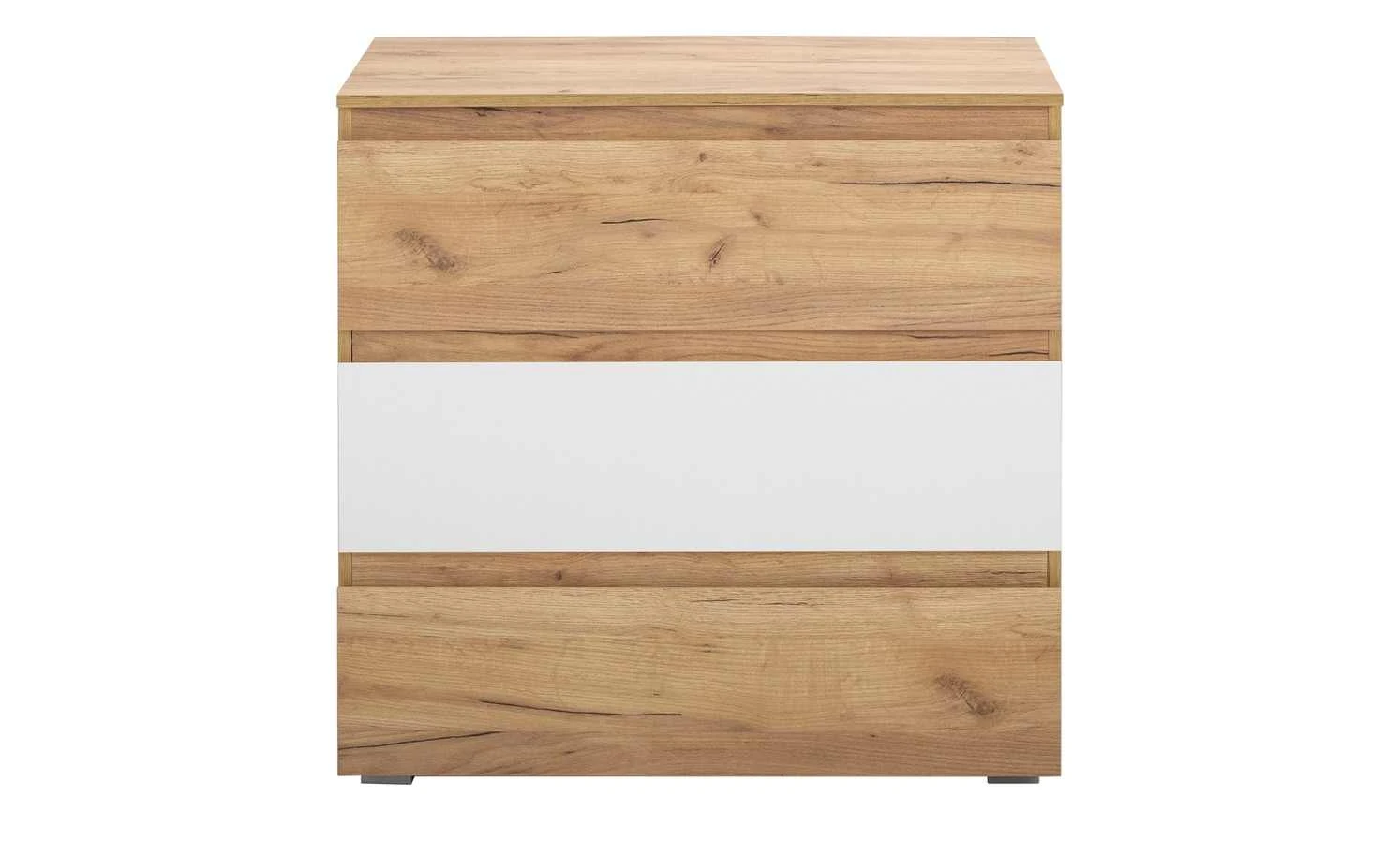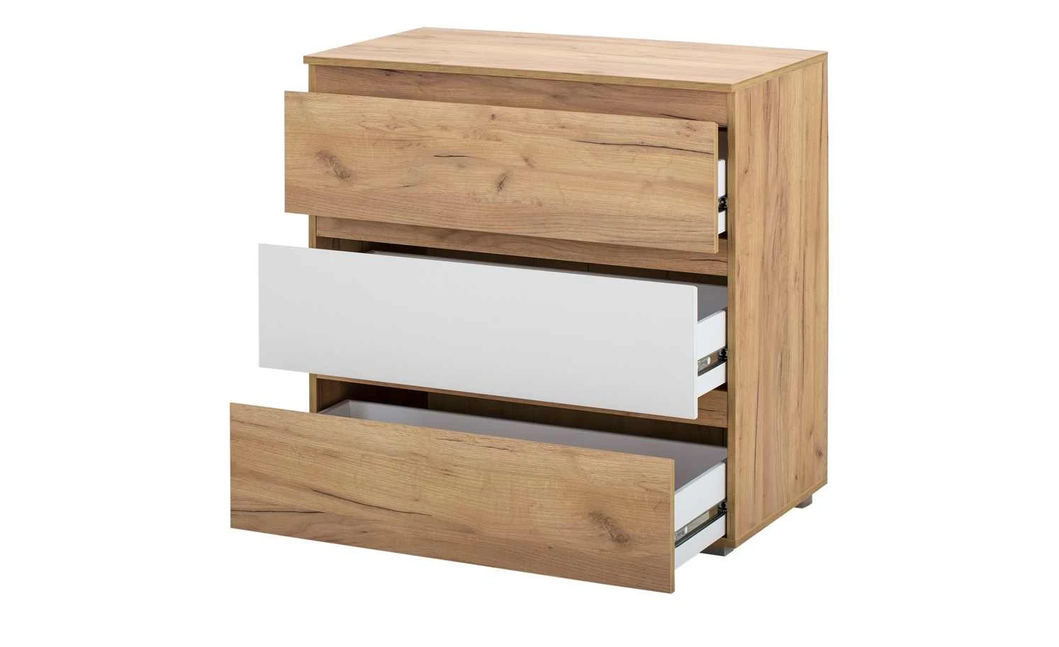 Ob im Wohnraum, Schlafzimmer oder Essbereich – die Kommode Tarent bietet praktischen Stauraum. Sie verfügt über drei geräumige Schubladen, die sich über die gesamte Breite der Kommode erstrecken. Tarent hat ein wohnlich-warmes Dekor in Honigeiche (Nachbildung), das sehr natürlich wirkt. Der obere Schubkasten setzt sich in Weiß ab. Die Kommode wirkt frisch und modern – und fügt sich gut in vorhandene Einrichtungen ein.