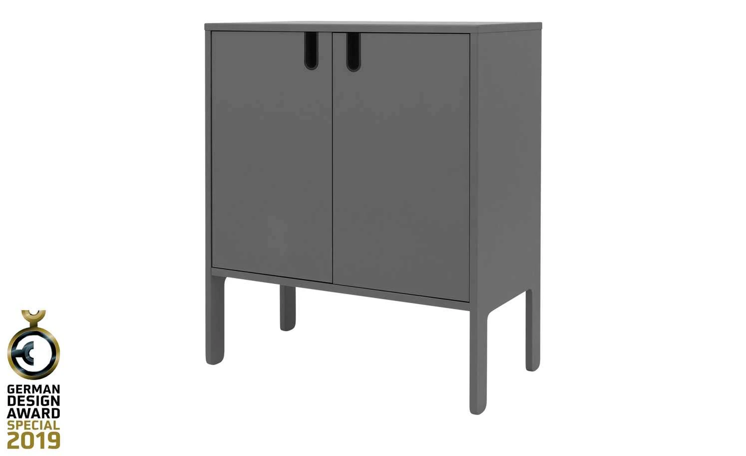 Die Kommode Uno ist ein Eyecatcher für jeden Raum. Nicht ohne Grund ist sie mit dem German Design Award 2019 ausgezeichnet worden. Passend zur Form ist auch die Farbe gewählt. Der lackierte Grauton hat ein mattes Finish, das die Farbe wunderbar zur Geltung bringt. Uno ist mit zwei Türen ausgestattet, die Dank Soft-Close leise schließen. Im Kommodeninneren befinden sich zwei geräumige Fächer.