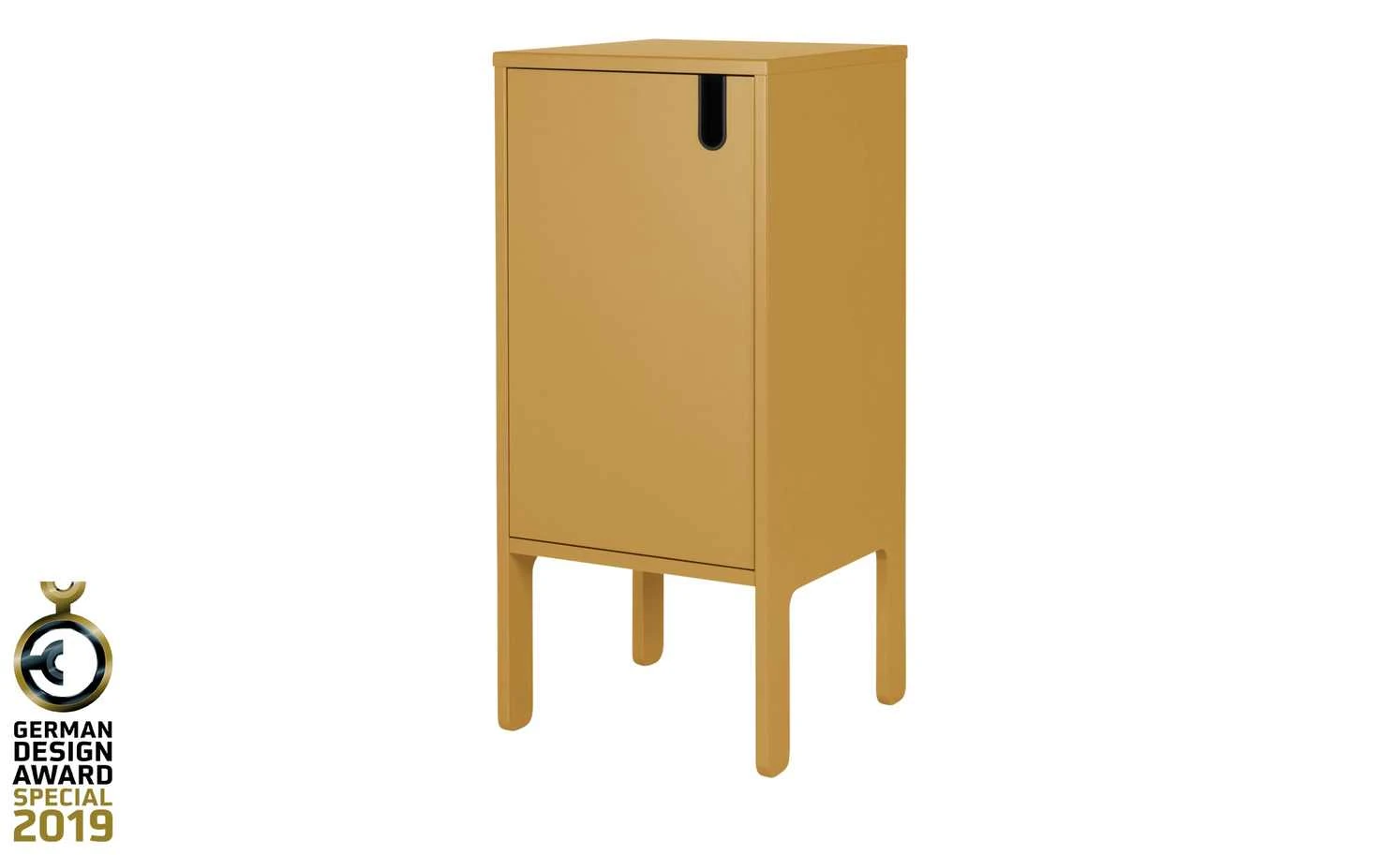 Mit ihrem jungen, frischen Design fällt die Kommode Uno sofort ins Auge. Sie ist mit dem German Design Award Special 2019 ausgezeichnet worden. Die Oberflächen sind senfgelb lackiert. Das matte Finish lässt den Farbton noch edler und moderner wirken. Uno verfügt über zwei Fächer, die von einer Tür verschlossen werden. Letztere ist mit einer Soft-Close-Funktion ausgestattet, die für ein leises Schließen sorgt.