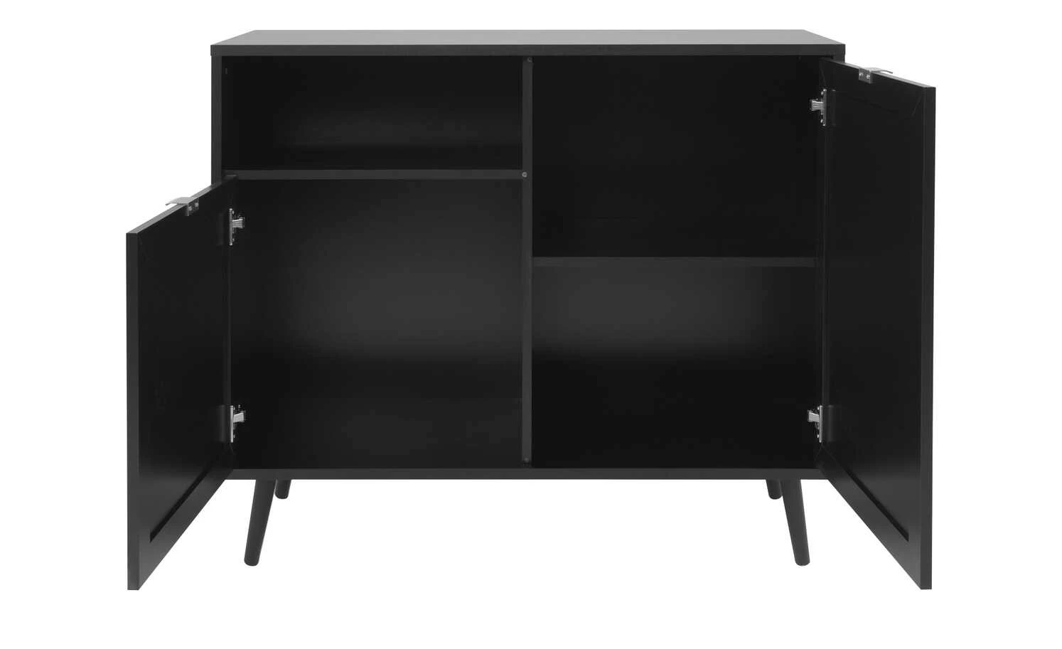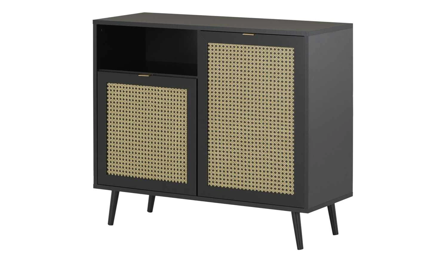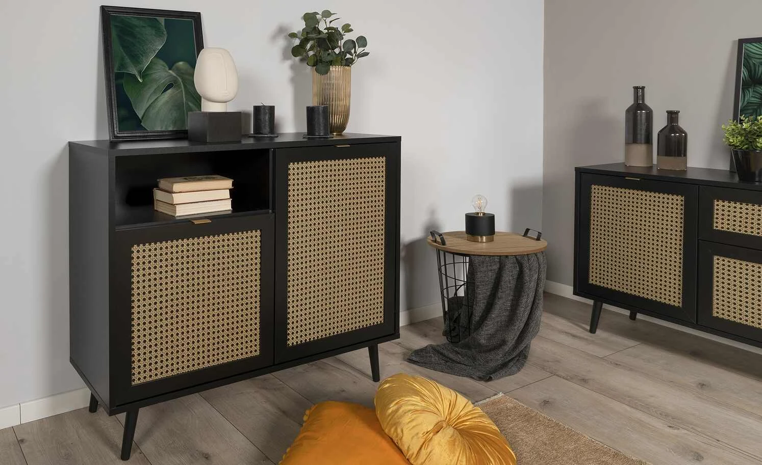 Der edle Hell-Dunkel-Kontrast und die Wiener-Geflecht-Optik machen die Kommode Vienna zum Hingucker im Wohn- oder Schlafzimmer. Der schwarze Schrank mit den schräg zulaufenden Buchenfüßen wird lediglich durch die pflegeleichte, helle Folierung an den Schranktüren akzentuiert. Dadurch entsteht ein charmantes Kaffeehaus-Flair, das an vergangene Zeiten erinnert. In dem offenen Fach können Sie zum Beispiel Zeitschriften verstauen, während in den insgesamt drei blickdichten Fächern Wohntextilien, Vasen oder Kleinkram Platz finden.
