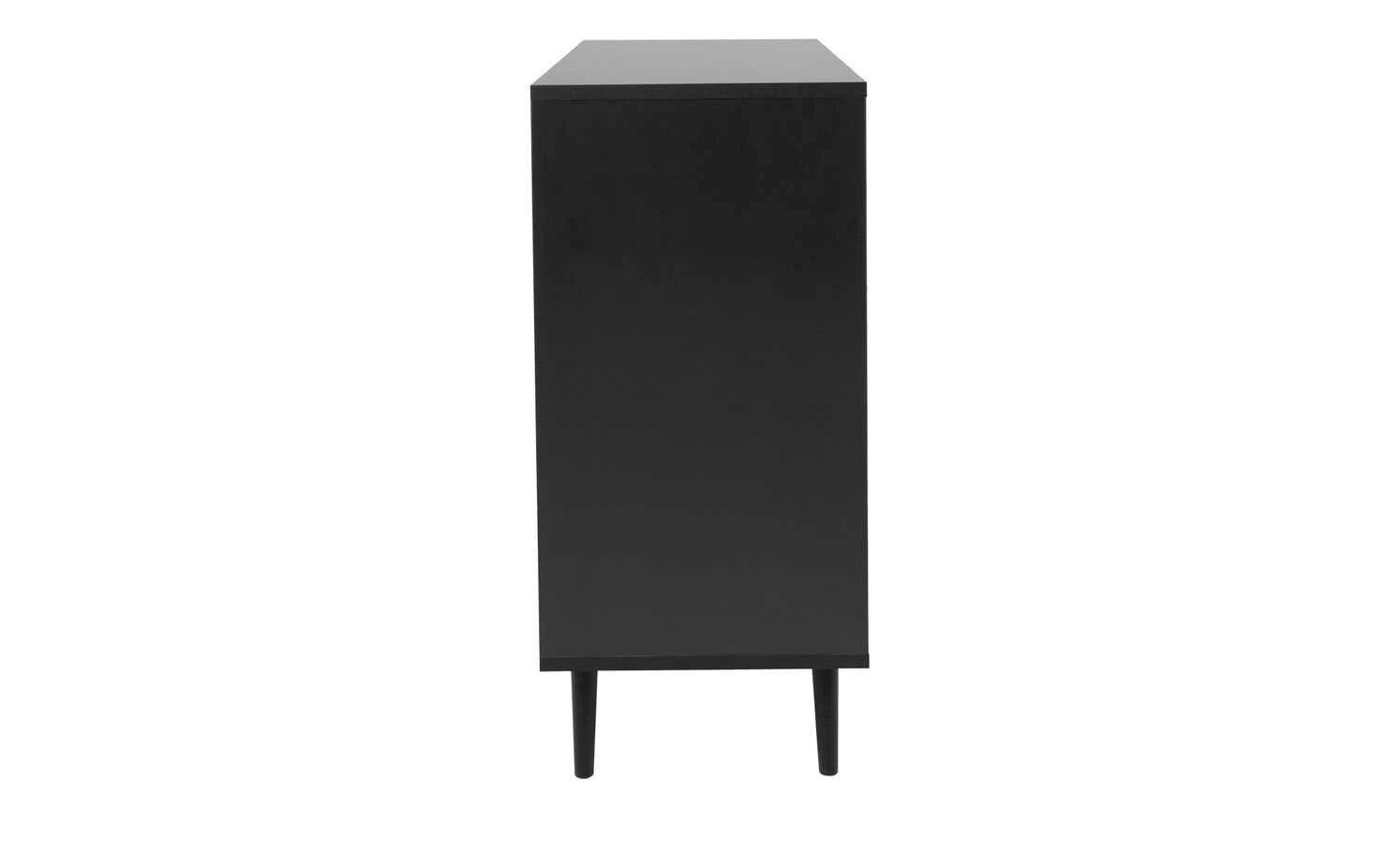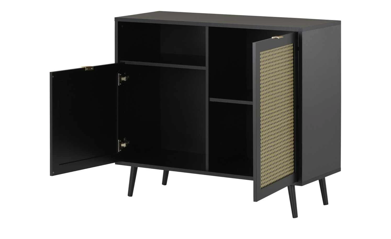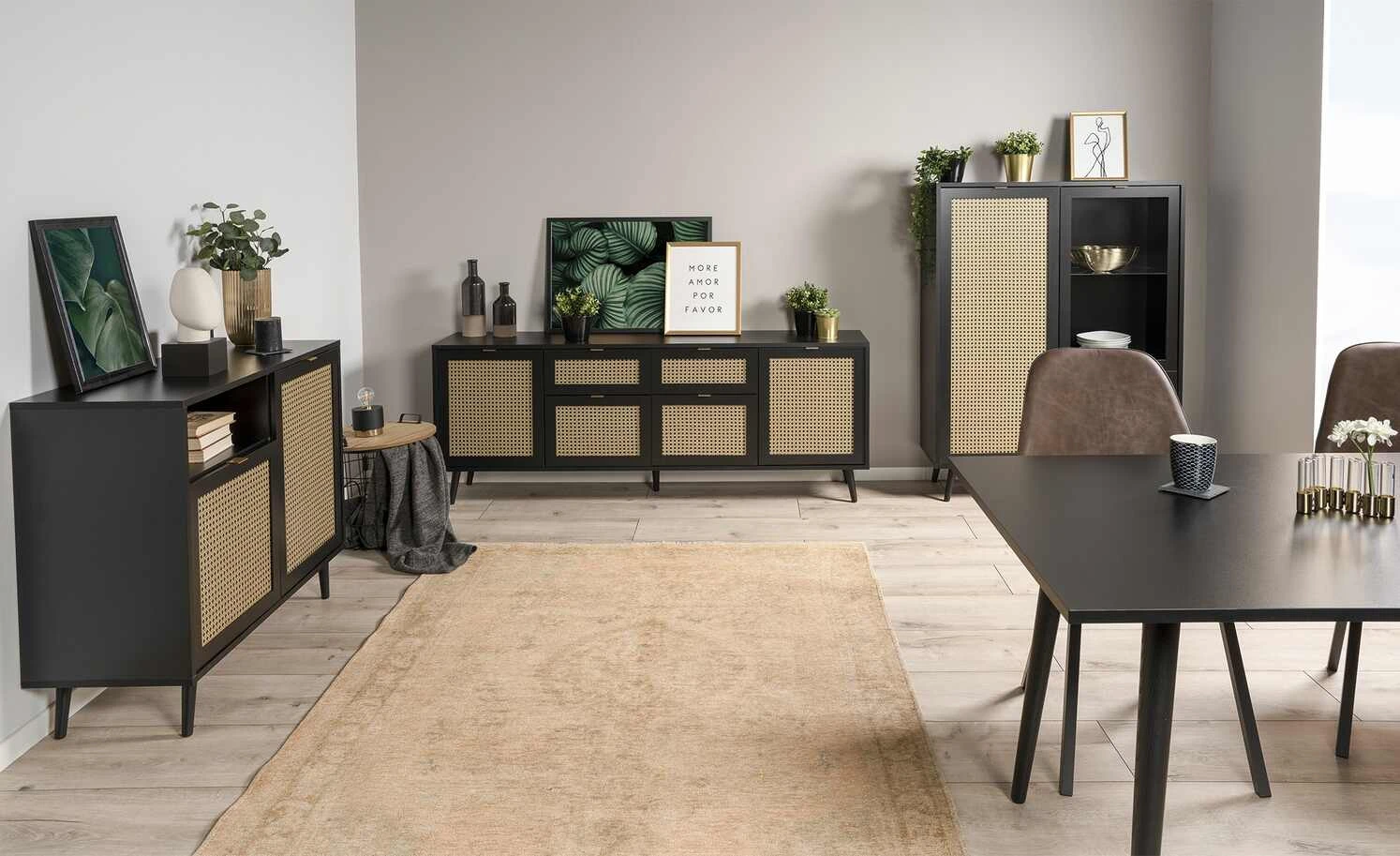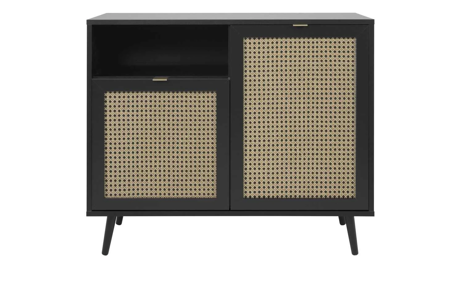 Der edle Hell-Dunkel-Kontrast und die Wiener-Geflecht-Optik machen die Kommode Vienna zum Hingucker im Wohn- oder Schlafzimmer. Der schwarze Schrank mit den schräg zulaufenden Buchenfüßen wird lediglich durch die pflegeleichte, helle Folierung an den Schranktüren akzentuiert. Dadurch entsteht ein charmantes Kaffeehaus-Flair, das an vergangene Zeiten erinnert. In dem offenen Fach können Sie zum Beispiel Zeitschriften verstauen, während in den insgesamt drei blickdichten Fächern Wohntextilien, Vasen oder Kleinkram Platz finden.