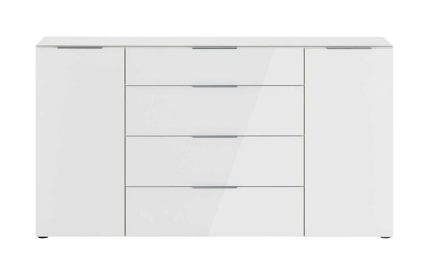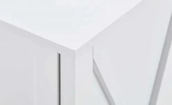 Mit ihrem modernen Look und praktischen Nutzen ist die Kommode Vitreo ein Highlight für jeden Raum. Die geradlinige Linienführung wird mit einem puren und leuchtenden Weiß kombiniert. Die Front hat eine Oberfläche aus ESG-Sicherheitsglas. Es ist besonders hart und widerstandsfähig – und gibt der Front ein glänzendes Finish. Zusätzliche Akzente werden durch die verchromten Griffleisten gesetzt. Der Korpus der Kommode ist melaminbeschichtet und somit kratzerunempfindlich und leicht zu pflegen. Vitreo ist mit vier großen Schubladen ausgestattet, die übereinander angeordnet sind. Links und rechts davon befindet sich jeweils eine Tür mit drei Fächern dahinter. Alle vier Schubkästen und die beiden Türen haben eine integrierte Soft-Close-Funktion für leises Schließen.
