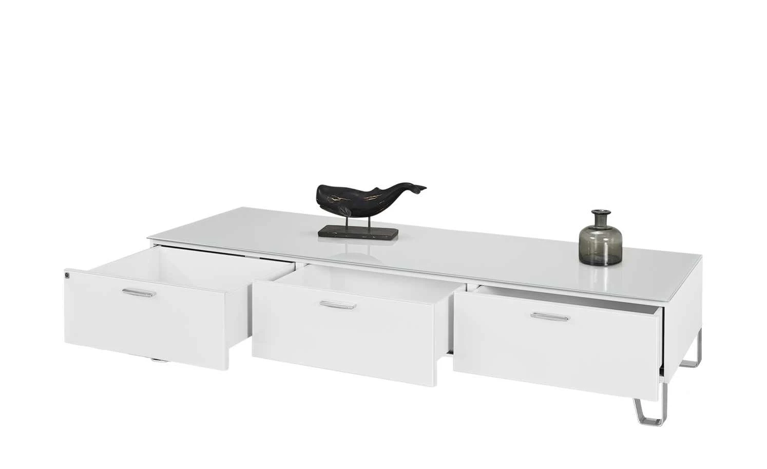 Stilvoll-edles Design, praktischer Nutzen und erstklassige Qualität vereinen sich beim TV-Unterteil Cube von LEONARDO. Front und Korpus haben eine Oberfläche aus lackiertem ESG-Sicherheitsglas. Es ist besonders stabil und zudem pflegeleicht. Dank der glänzenden Glasoberfläche kommt die weiße Farbe von Cube besonders schön zur Geltung. Das TV-Unterteil ist mit bis zu 30 Kilogramm belastbar und kann für TV-Geräte bis zu 75 Zoll Größe verwendet werden. Stauraum befindet sich in drei Schubladen. Alle drei haben einen Vollauszug und sind mit einem Selbsteinzug für langsames und leises Schließen ausgestattet.