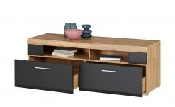 Dieses moderne Lowboard bringt Ihren Raum zum Strahlen. Überwiegend in mattem Weiß gehalten, wirkt das Lowboard frisch und elegant. In den beiden Schubladen mit Metallgriffen kann so einiges verstaut werden. Auf der oberen Fläche in Eichen-Altholz-Optik findet Ihr TV-Gerät ausgiebigen Platz. Darunter gibt es noch zwei Fächer, z. B. für andere Elektro-Geräte. Praktisch ist auch der Kabelkanal, so dass Kabelsalat gar nicht erst aufkommen kann.