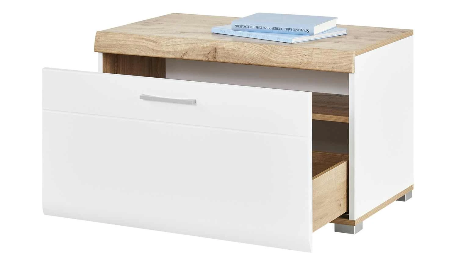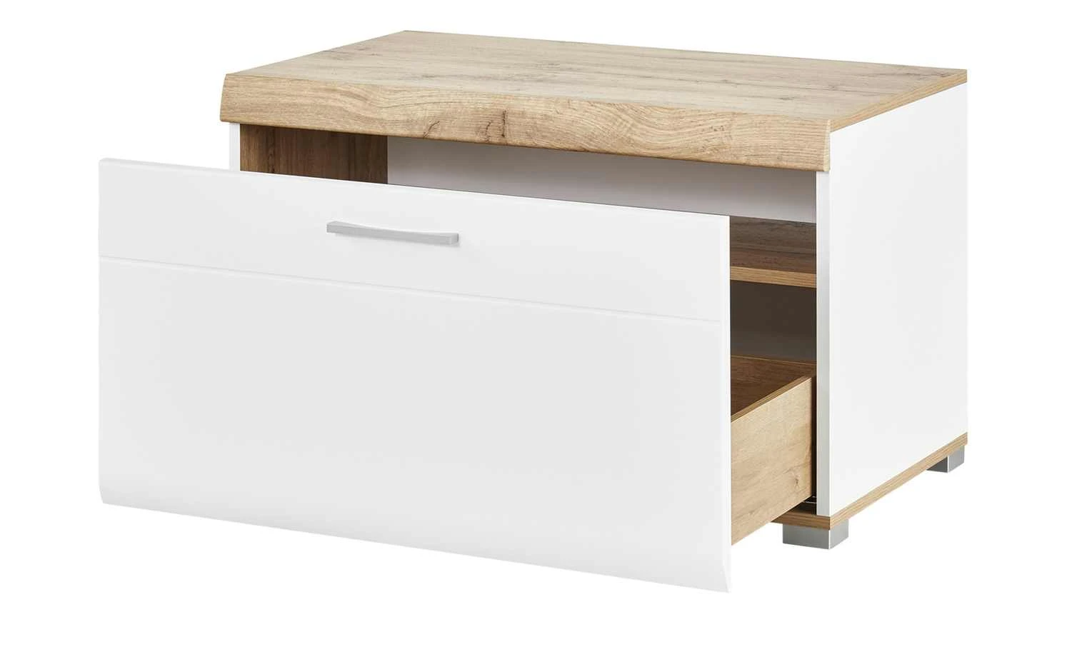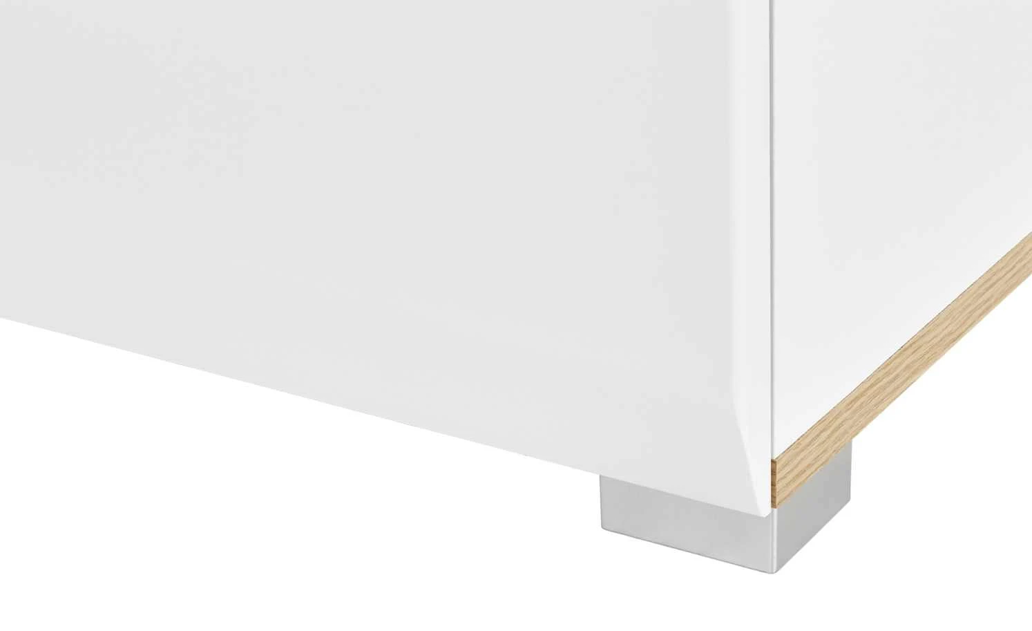 Das Lowboard Cortina kann einzeln oder in Kombination mit den anderen Lowboards der Serie genutzt werden. Cortina verfügt über eine große Schublade, die sich über die gesamte Breite des Lowboards erstreckt. Front und Korpus sind in mattem Weiß designt. Abdeckplatte und Boden setzen sich in Eiche Altholz (Nachbildung) ab.