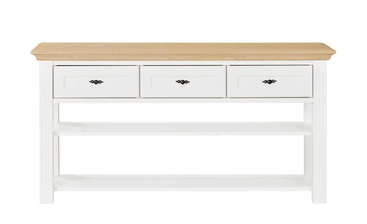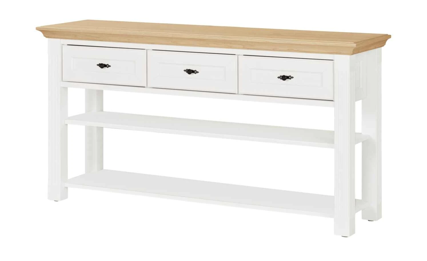 - Mehr zum Material: Korpus und Front aus Holzwerkstoff Weiß lackiert, Absetzung aus Asteiche furniert