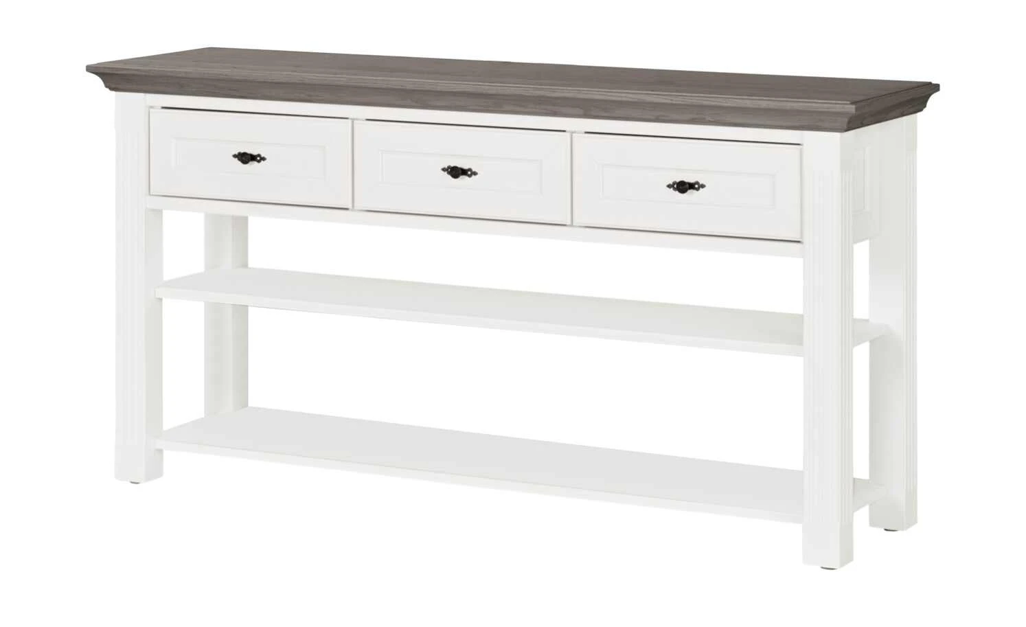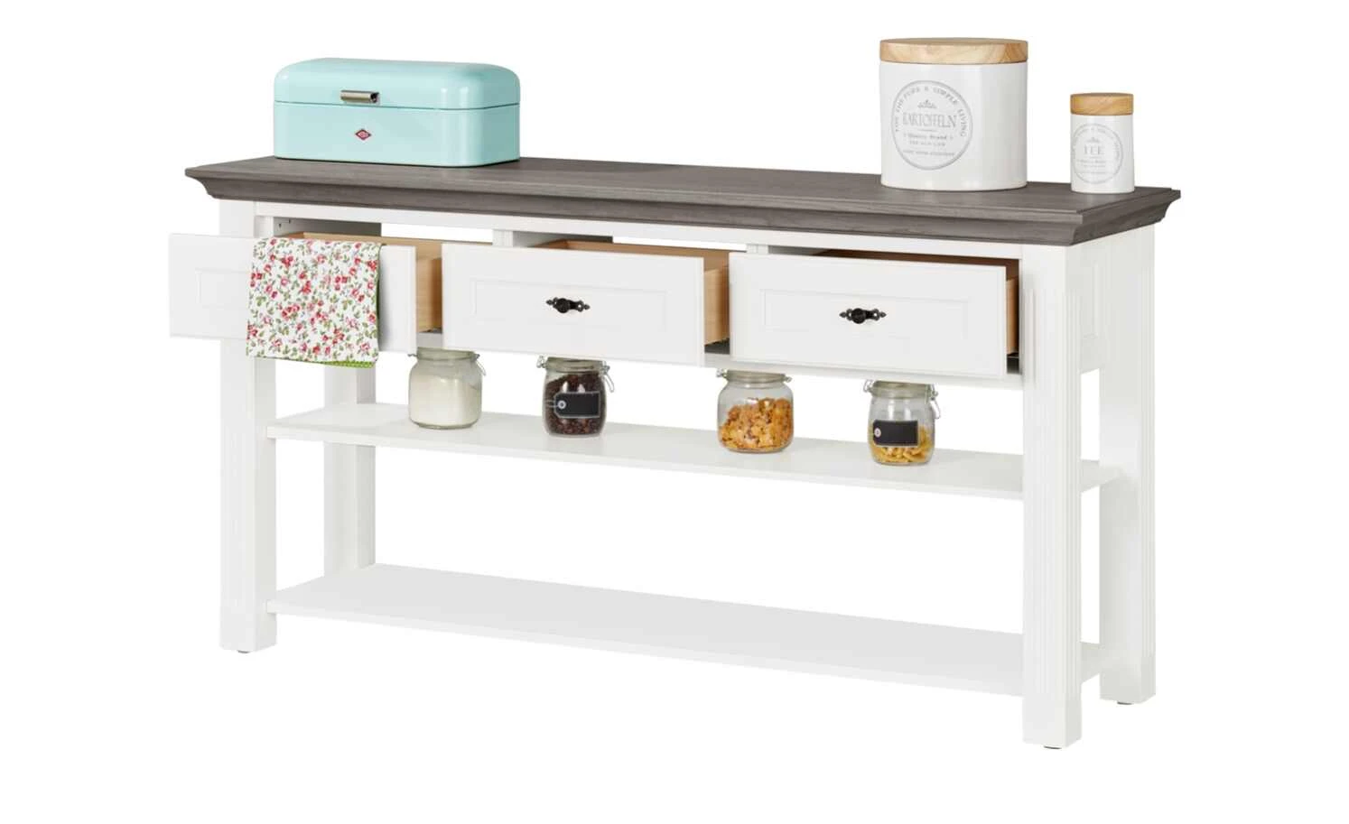 - Mehr zum Material: Absetzung aus Holzwerkstoff Graphit (Grau) lackiert, Korpus und Front aus Holzwerkstoff Weiß lackiert