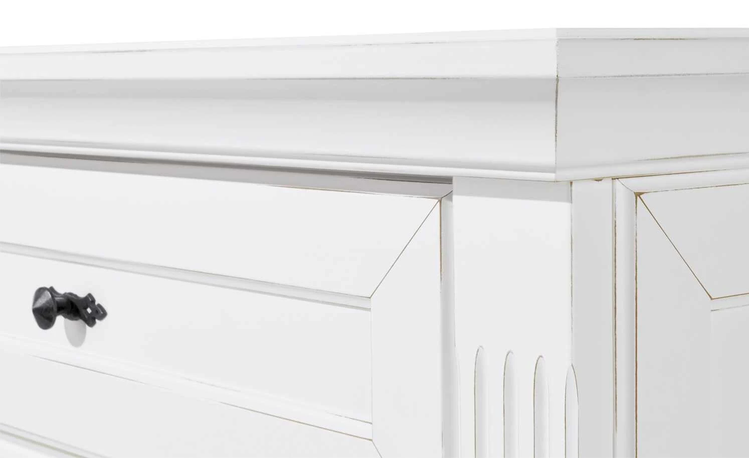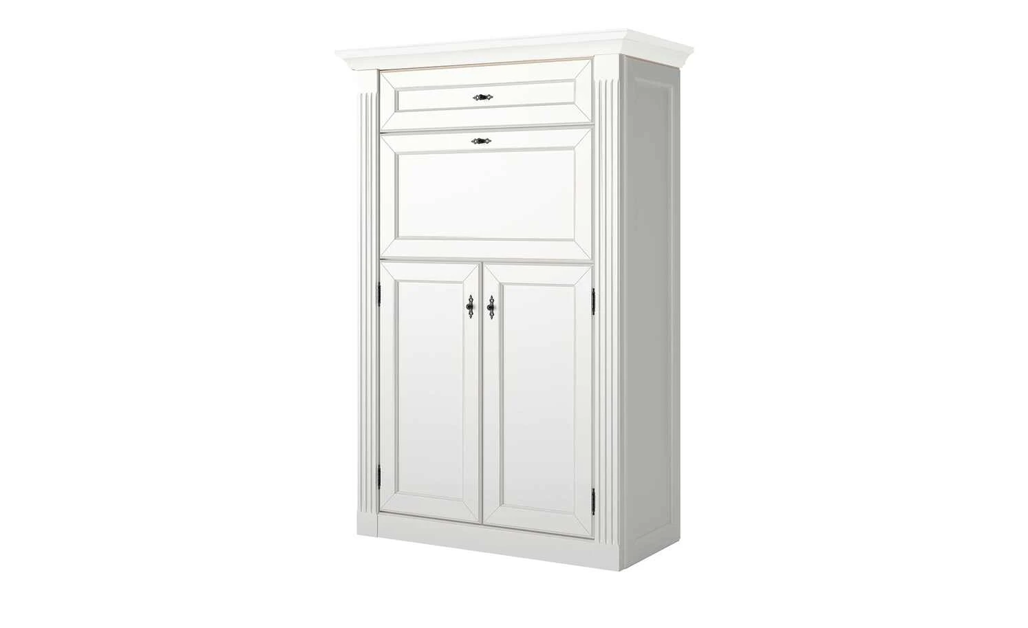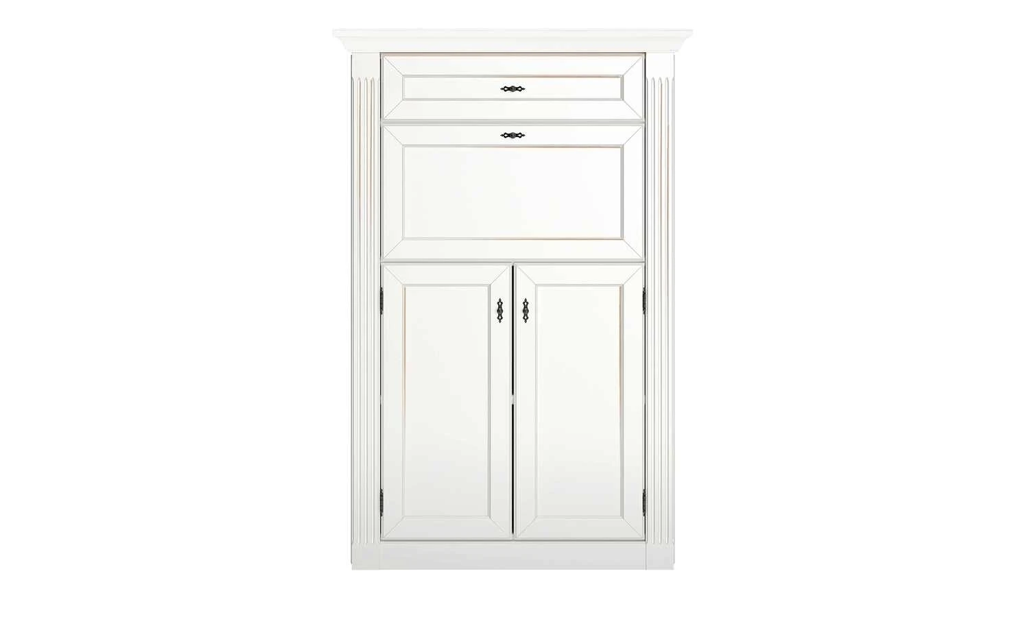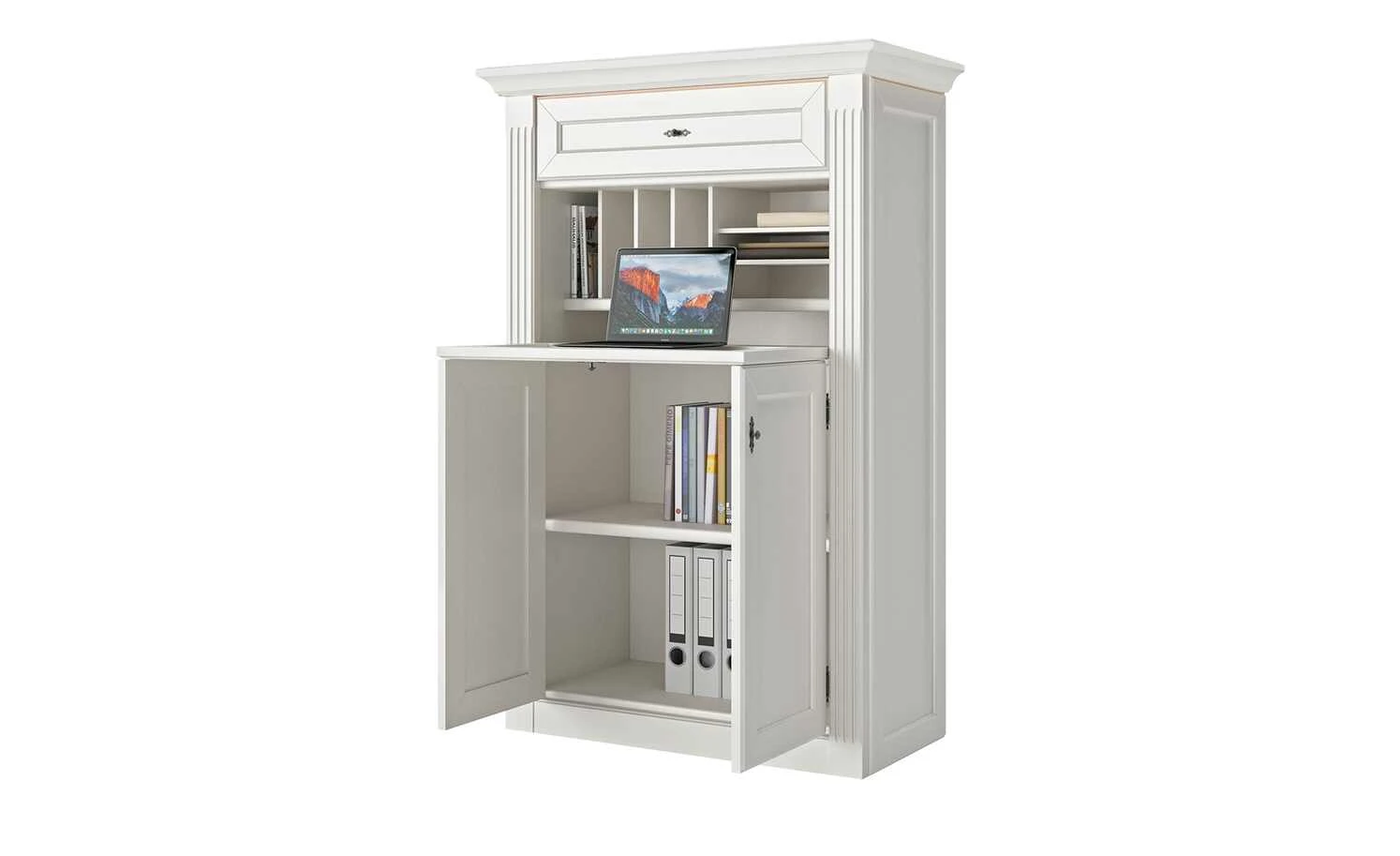 Eine dekorative Alternative zum Schreibtisch ist der Sekretär Petit Chalet. Er fügt sich mit seinem charmanten Landhausstil nahtlos in Wohnraum oder Schlafzimmer ein. Petit Chalet verfügt über eine Schublade, eine Klappe und zwei Türen. Heruntergeklappt wird die Klappe zur Ablage zum Schreiben und Arbeiten. Das große Fach hinter der Klappe ist praktisch unterteilt. Es stehen Ihnen vier vertikale und vier horizontale Fächer zur Verfügung. Ideal für Briefpapier, Umschläge und Schreibutensilien. Hinter den beiden Türen hat der Sekretär zwei Fächer für Ordner und mehr.