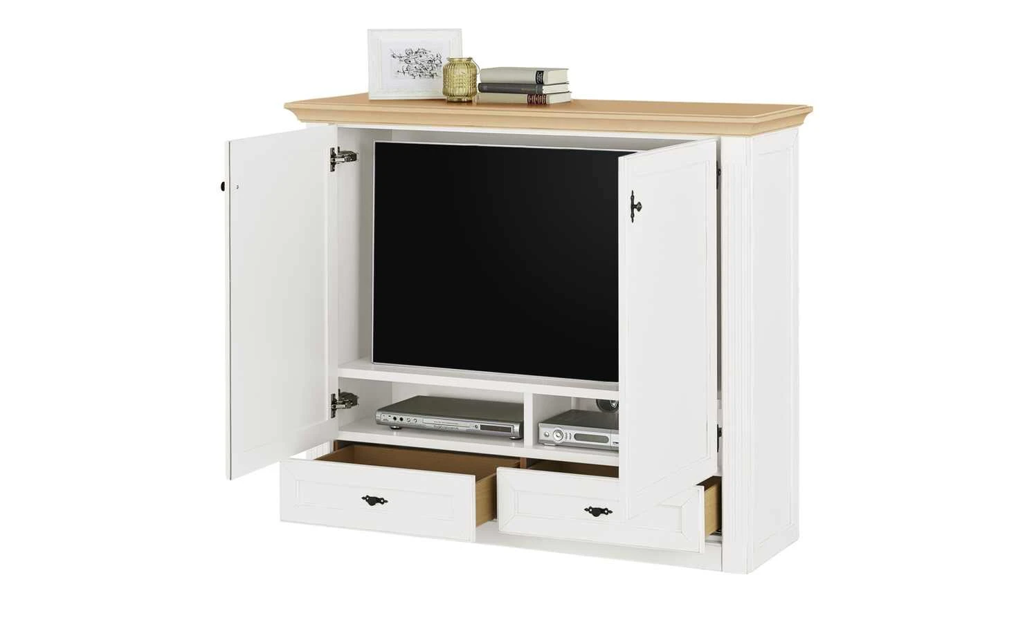 - Mehr zu Maßen: Maße des TV-Faches: ca. 115×67 cm (BH), Maße der Geräte-Fächer: 2x ca. 56×12 cm (BH)