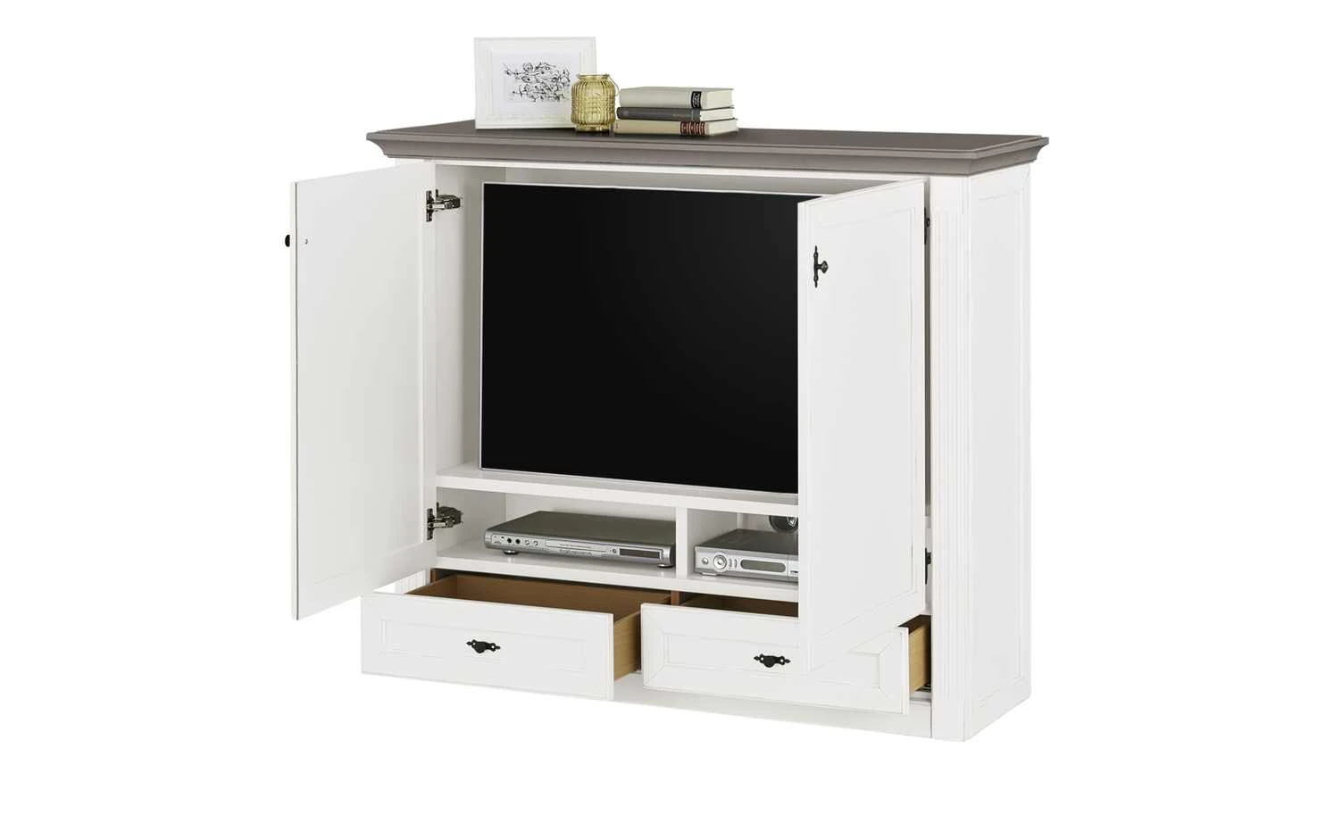 Im TV-Schrank Petit Chalet können Sie problemlos Ihren Fernseher verstauen. Dieser findet im großen Fach hinter den beiden Türen seinen Platz. Unterhalb des großen Faches finden Sie zwei kleinere Fächer. Sie eigenen sich optimal für DVD-Player oder Festplattenrecorder. Zusätzlich hat Petit Chalet zwei Schubladen, in denen Sie die verschiedensten Kleinigkeiten verstauen können.