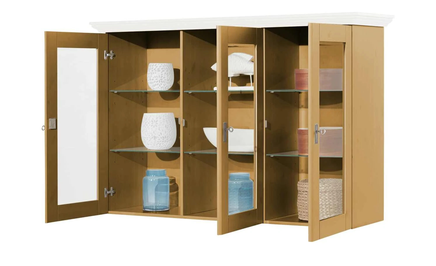 Vitrinen sind gleich doppelt praktisch. Sie bieten Stauraum – und zeitgleich können Sie darin Ihr Geschirr oder Porzellan in Szene setzen. Der Vitrinenaufsatz Florian von maison bleue ist eine Ergänzung für das gleichnamige Sideboard. Er wird einfach auf das Sideboard gesetzt. Der Aufsatz im Landhausstil verfügt über drei Türen mit Glaseinsatz. Für einen freien Blick in die Fächer dahinter. Innen können Sie gleich neun Vitrinenfächer nutzen. Florian besteht aus massiver Kiefer und ist weiß gebeizt und lackiert. Der Kranz setzt sich farblich ab.