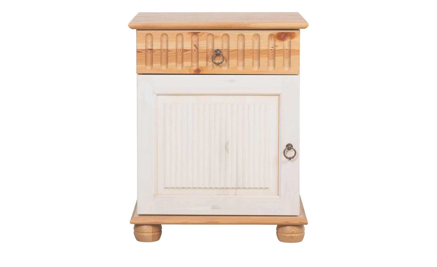 Diese optisch ansprechende Nachtkommode ist nicht nur praktisch, sondern bereichert Ihr Schlafzimmer auch dekorativ. Durch das rustikale Landhaus-Design und die Farbgestaltung in Weiß und Kiefer passt der Nachtschrank ideal zum gleichnamigen Bettgestell der Serie Bornholm. Die Nachkommode besteht aus massivem Kiefernholz – die Oberfläche ist lackiert. Im Inneren bietet die praktische Nachtkommode ausreichend Platz für alles, was Sie neben Ihrem Bett aufbewahren möchten. Oberhalb des geräumigen Faches mit Drehtür befindet sich eine Schublade. Die Zug-Griffe in Ringform aus Metall sind im Used-Look gehalten und sorgen neben ihrer Funktion auch für optische Highlights.