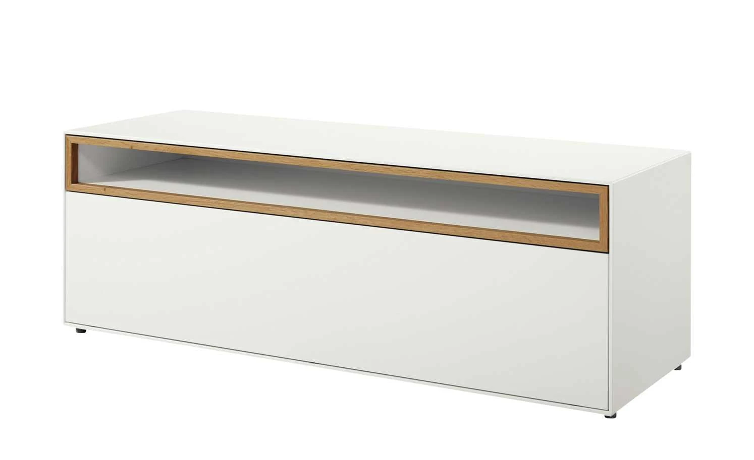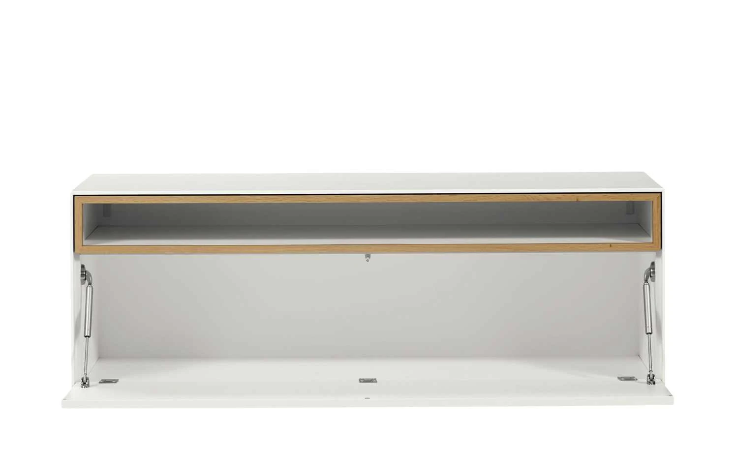 Kombinieren Sie das Lowboard now! easy by hülsta mit den anderen Modul-Elementen der gleichnamigen Serie oder lassen Sie es für sich wirken. Das Lowboard hat ein großes Fach, welches mit einer Klappe geschlossen werden kann. Die Klappe öffnet sich mithilfe der Push-to-Open-Funktion. Dabei müssen Sie nur auf die obere Vorderseite der Klappe drücken und schon geht sie auf. Oben hat now! easy außerdem ein längliches, offenes Fach. Die Umrandung des Faches ist in Natureiche furniert.