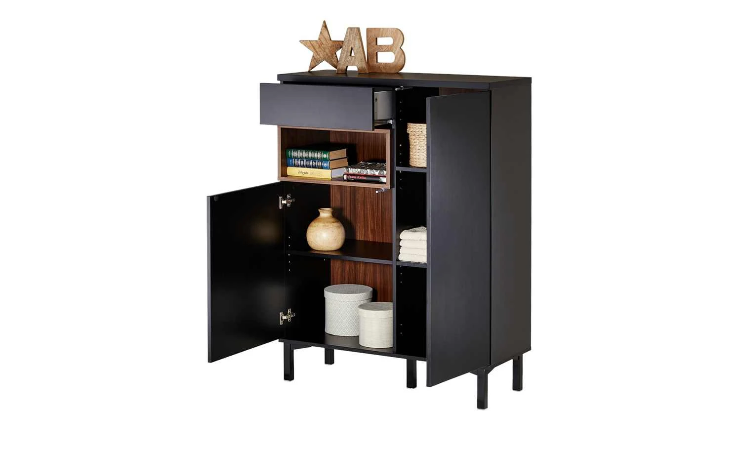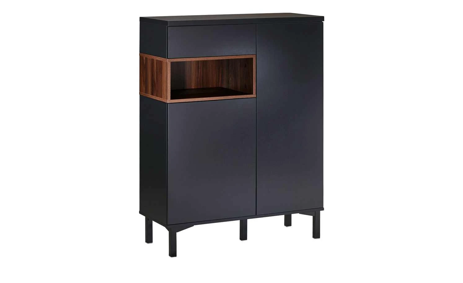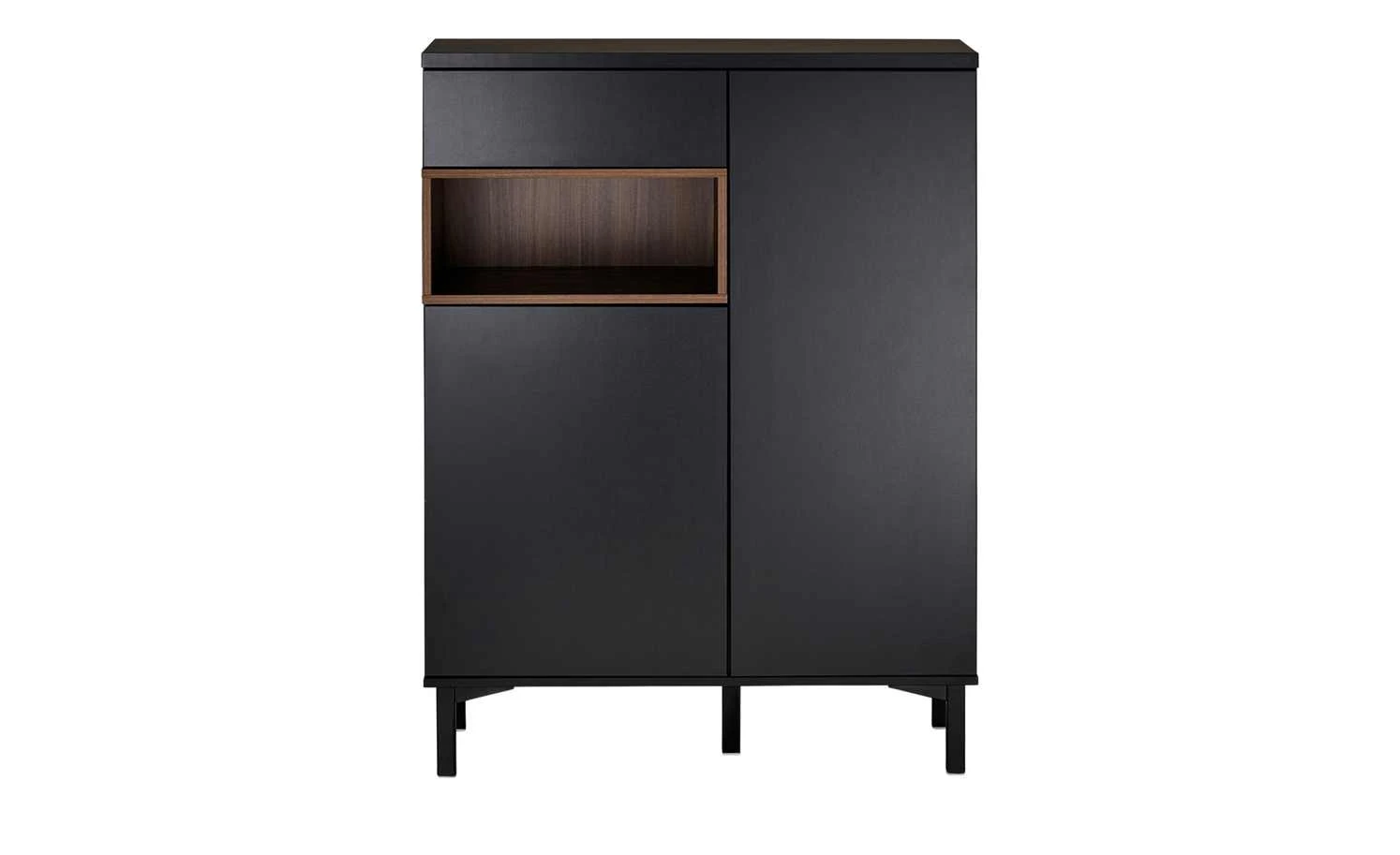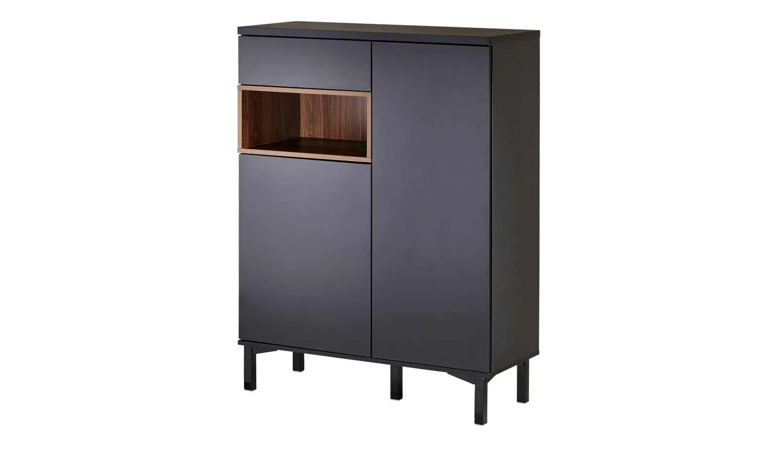 Gradliniges, cleanes Design und eine edle Farbgebung machen das Highboard Case aus. Das offene Fach auf der linken Seite ist farblich abgesetzt in einer Walnuss-Nachbildung. Oberhalb des offenen Faches bietet Ihnen eine Schublade Platz für Kleinigkeiten. Links stehen des Weiteren zwei Fächer mit Tür zu Ihrer Verfügung. Rechts hat Case eine große Tür, die sich über die gesamte Höhe des Highboards erstreckt. Hinter ihr sind drei Fächer. Türen und Schub öffnen Sie mithilfe der Push-to-Open-Funktion. So konnte auf Griffe verzichtet werden.