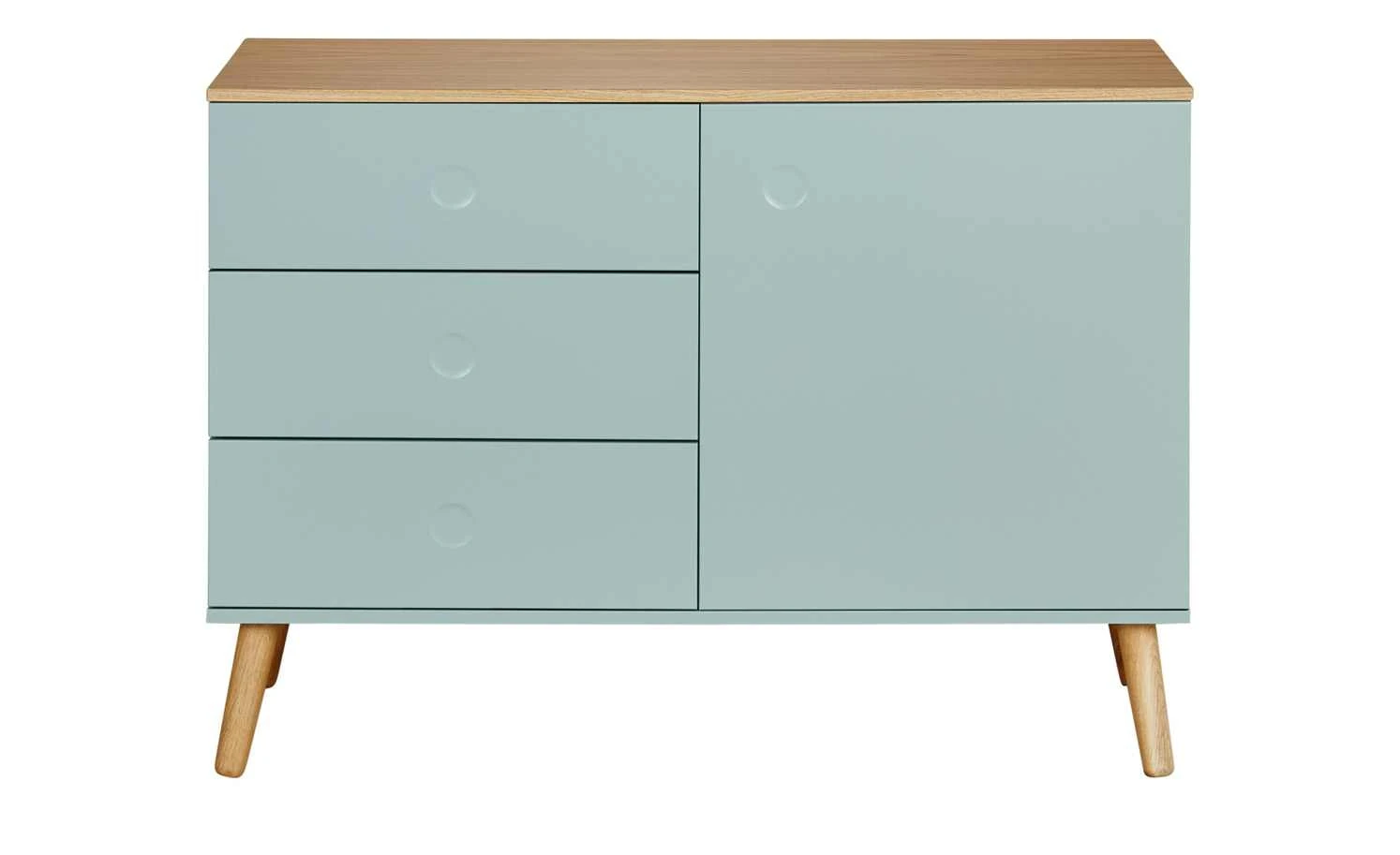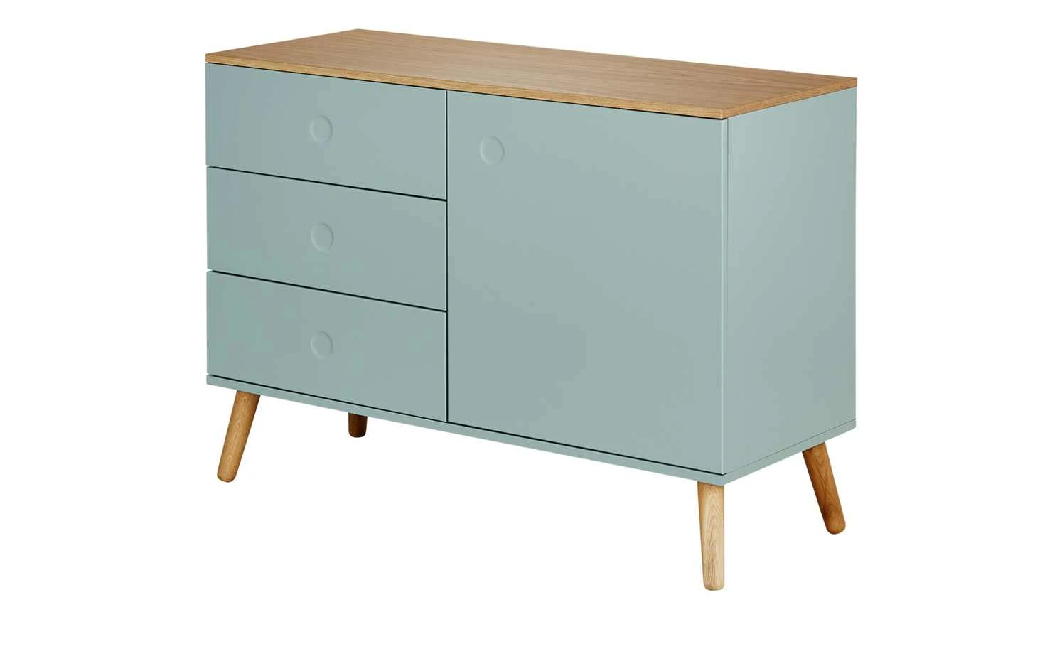 Retrostil und skandinavisches Design vereinen sich im Sideboard Scan. Der zarte Pastellton in Salbeigrün und die abgespreizten Retrofüße erinnern an den Stil der 50er-Jahre. Die Beine sind aus massiver Eiche und die Abdeckplatte ist mit dem gleichen Holz furniert worden. So setzen sich beide schön von der farbig lackierten Oberfläche ab. Auf Griffe wurde bewusst verzichtet. An der Stelle, an der die Griffe sein könnten, wurde die Oberfläche leicht eingedellt. Hier brauchen Sie einfach nur leicht zu drücken, schon gehen Schubfächer und die Tür auf. Möglich macht das die sogenannte Push-to-Open-Funktion. Scan bietet Platz in zwei Fächern mit Tür und drei Schubladen.