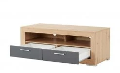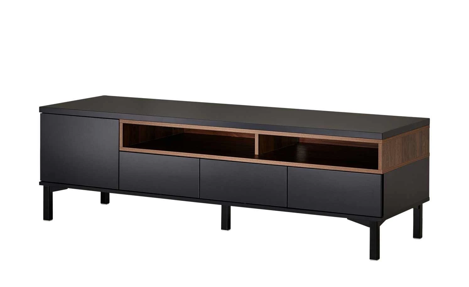 Geben Sie Ihrem Fernseher einen neuen Stellplatz im exklusiven Design. Das TV-Lowboard Case ist hochwertig gearbeitet und hat eine stilvolle Optik. Der schwarzbraune Farbton wirkt sehr edel und passt zum gradlinigen Design. Direkt unter der Abdeckplatte befinden sich zwei voneinander getrennte Fächer für Festplattenrecorder und Musikanlage. Diese sind in Walnuss (Nachbildung) abgesetzt. Weiterer Stauraum befindet sich in einem Fach mit Tür und drei Schubfächern. Diese lassen sich mit der Push-to-Open-Funktion durch einen leichten Druck auf die Front öffnen.