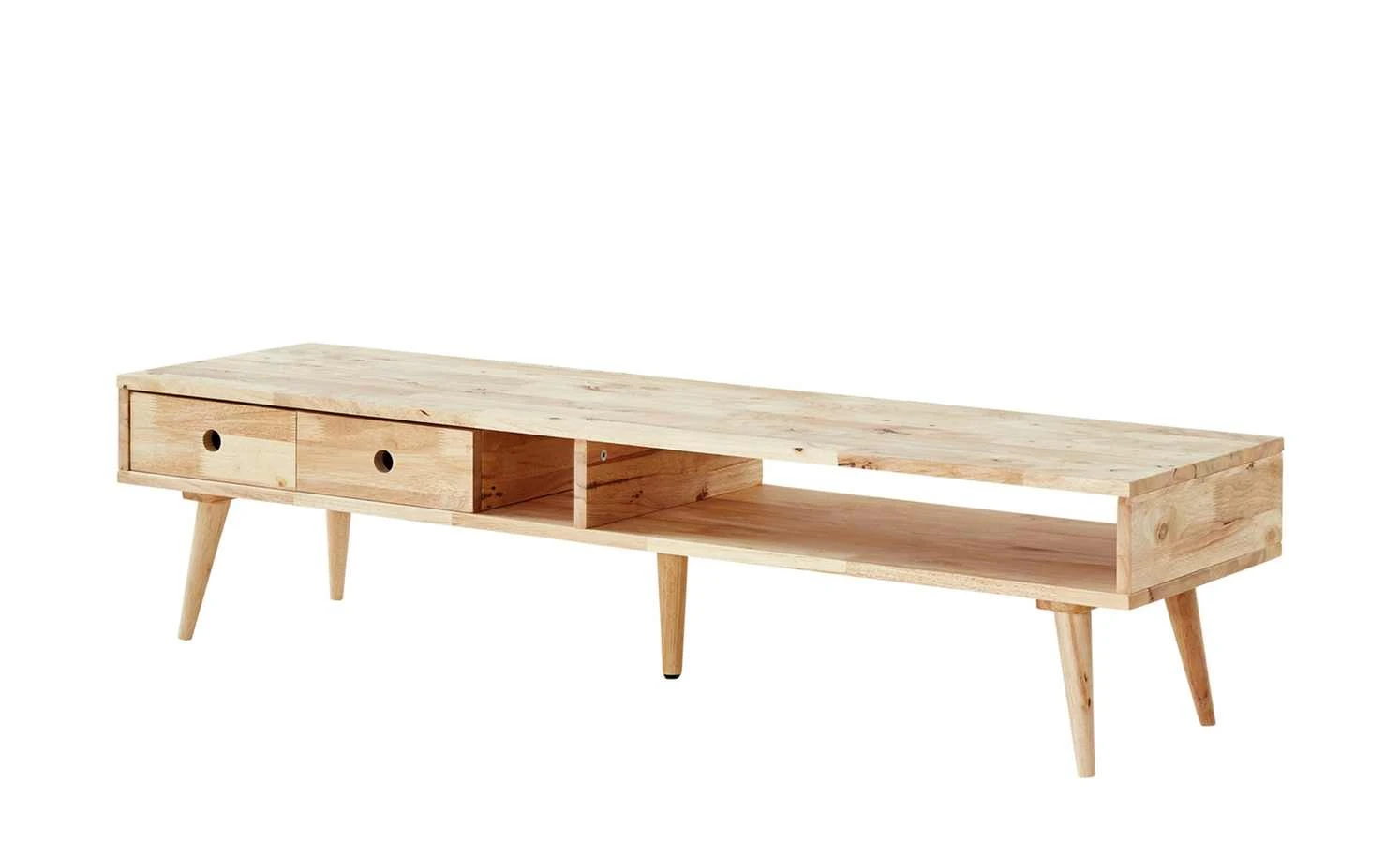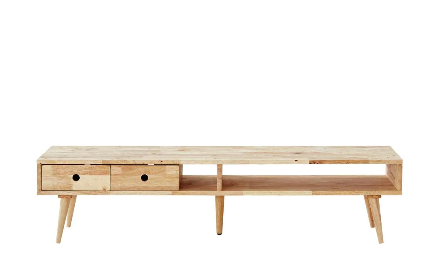 Nate ist das passende TV-Lowboard für Ihren Fernseher. Da es aus massivem Gummibaum gefertigt wurde, bietet es genügend Stabilität, um auch große TV-Geräte tragen zu können. Dennoch wirkt Nate durch seine offene Bauweise leicht und luftig. Die Beine sind leicht abgespreizt und nach unten spitz zulaufend. Damit greifen Sie den Stil der 50er- und 60er-Jahre auf. Die Oberfläche ist unbehandelt und lässt die natürliche, skandinavische Holzoptik für sich sprechen. Nate hat zwei große, offene Fächer. Ebenfalls im Lieferumfang enthalten sind zwei Schubladen, die individuell in den Fächern platziert werden können.