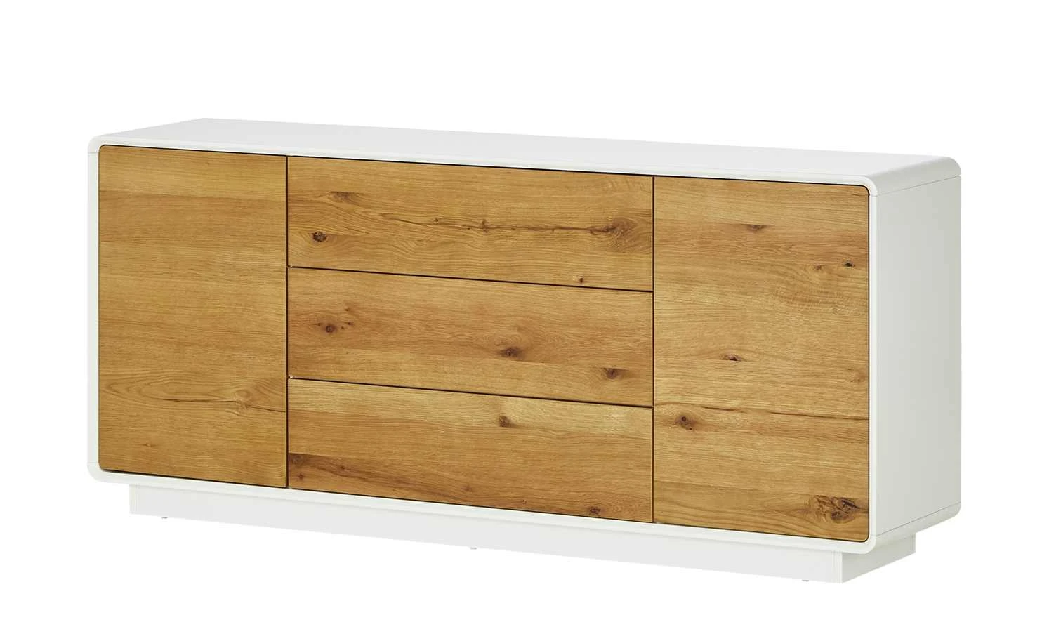 Das Sideboard Bruneck setzt auf Kontraste. Es hat eine natürlich-charmante Front, die mit Asteiche furniert ist. Das Holz verfügt über eine stark ausgeprägte Maserung mit diversen Farbnuancen und Asteinschlüssen. Damit das Naturmaterial besonders schön zur Geltung kommt, wurde auf Griffe verzichtet. Türen und Schubladen sind mit einer Push-to-Open-Funktion ausgestattet, bei der Sie auf die Front der beiden Türen und drei Schübe drücken, um sie zu öffnen. Für den Korpus ist ein schlichtes Weiß mit mattem Finish verwendet worden.