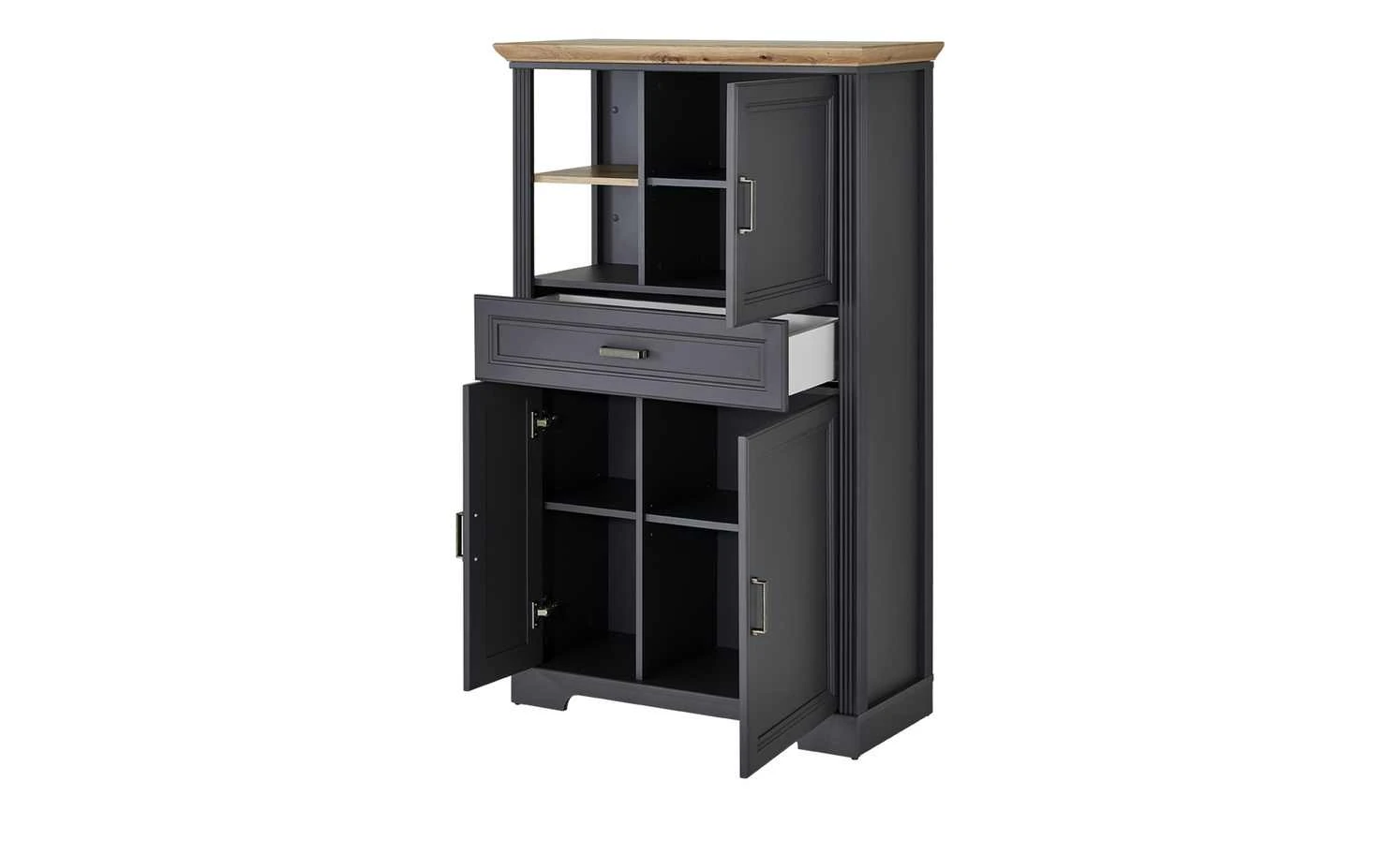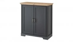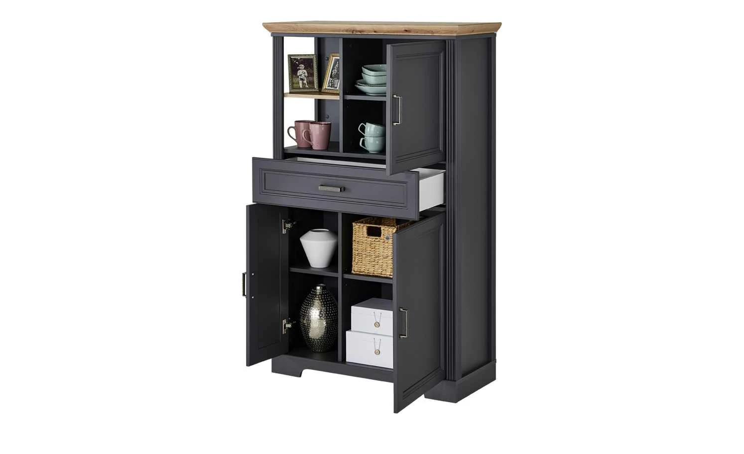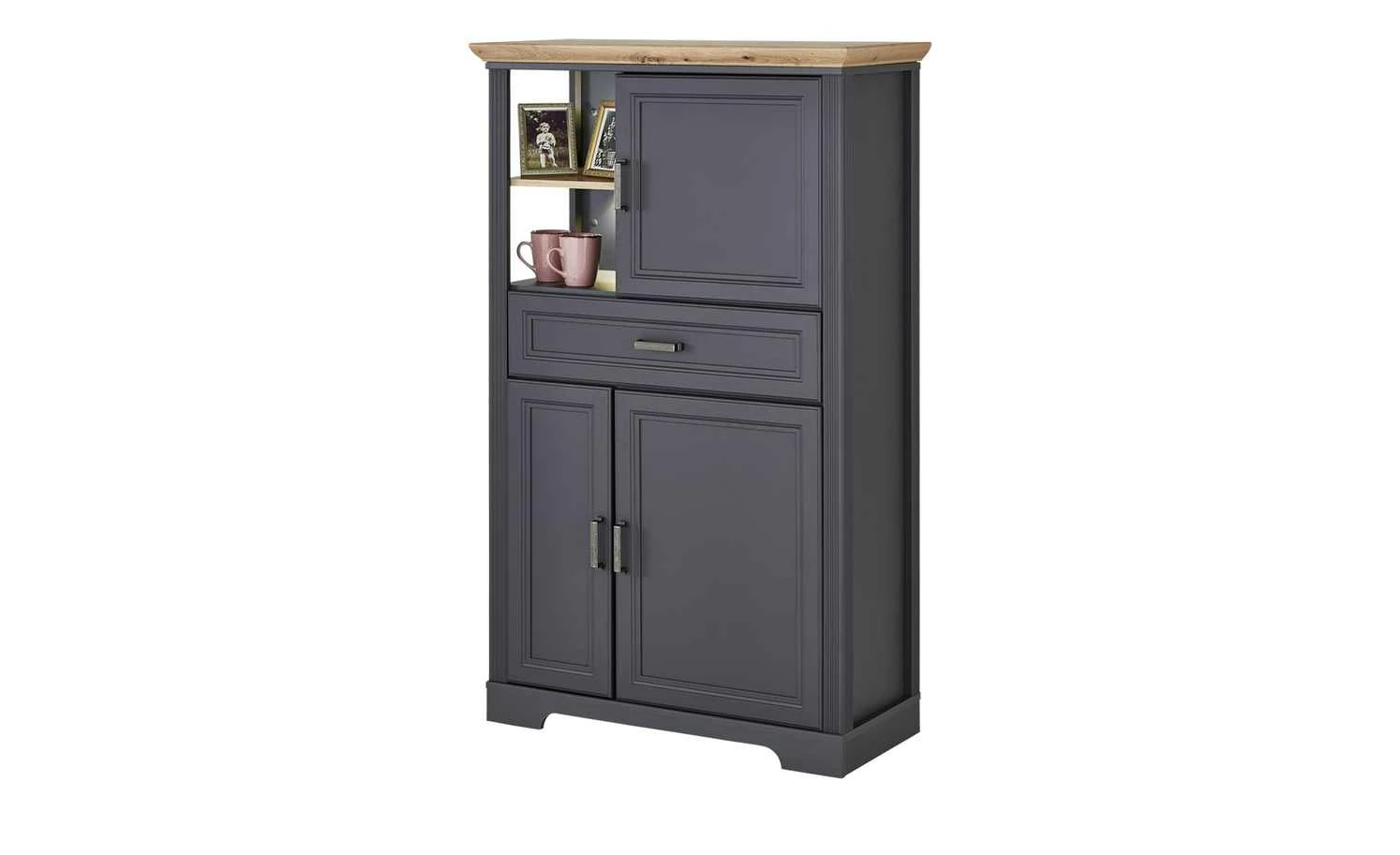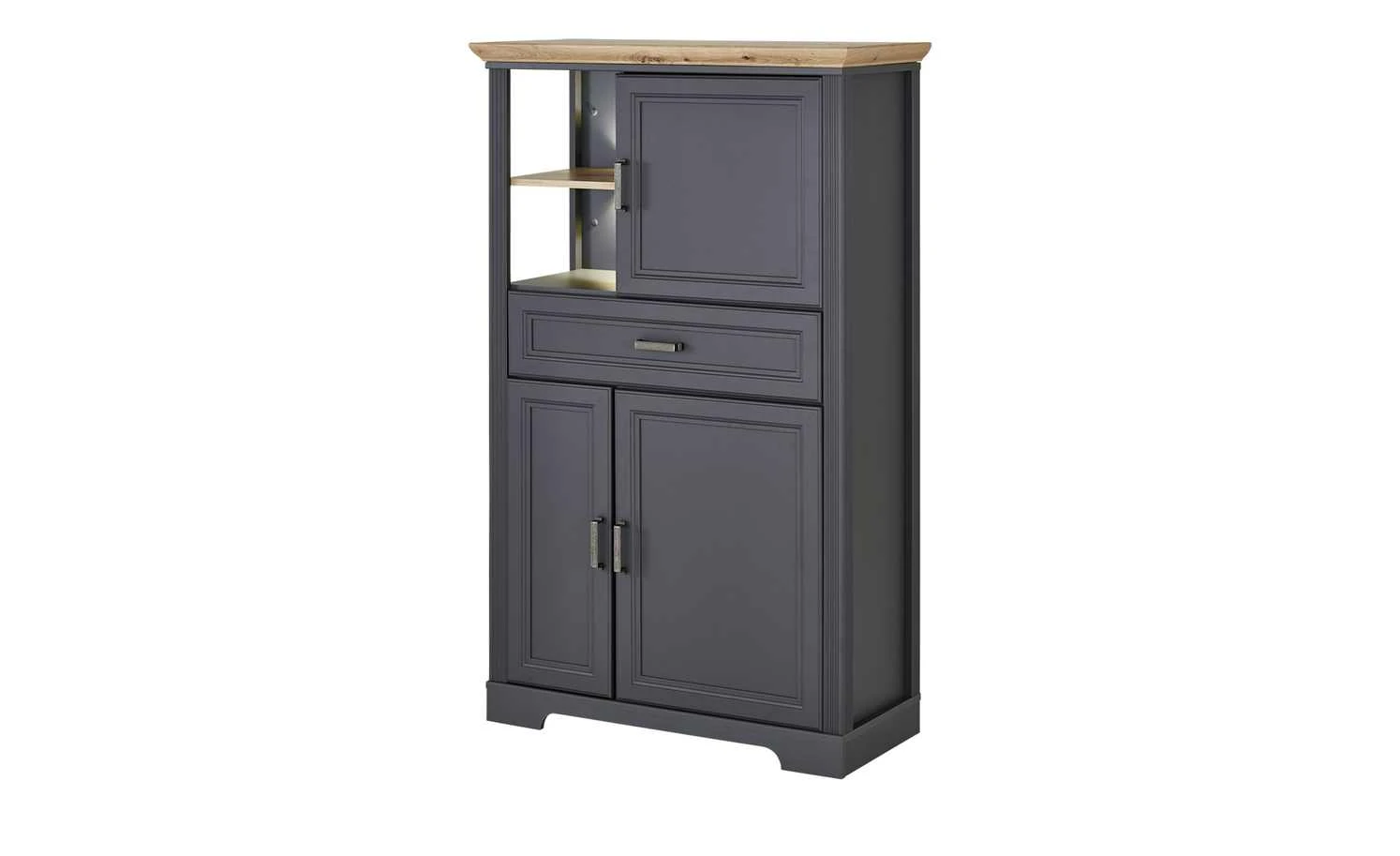 Wie der Name verrät, bietet das Stauraumelement Varese richtig viel Stauraum. Hinter den drei Türen stehen Ihnen beispielsweise sechs große Fächer zur Verfügung, deren Böden Sie in der Höhe verstellen können. Mittig befindet sich eine Schublade. Türen und Schublade haben eine Soft-Close-Ausstattung, die ein geräuscharmes Schließen ermöglicht. Zusätzlich können Sie zwei offene Regalfächer nutzen. Neben dem praktischen Nutzen sieht Varese auch gut aus: Front und Korpus sind im Landhausstil verziert und haben eine elegante graphitgraue Farbe. Die Abdeckplatte und der Regalboden setzen sich in Asteiche (Nachbildung) ab.