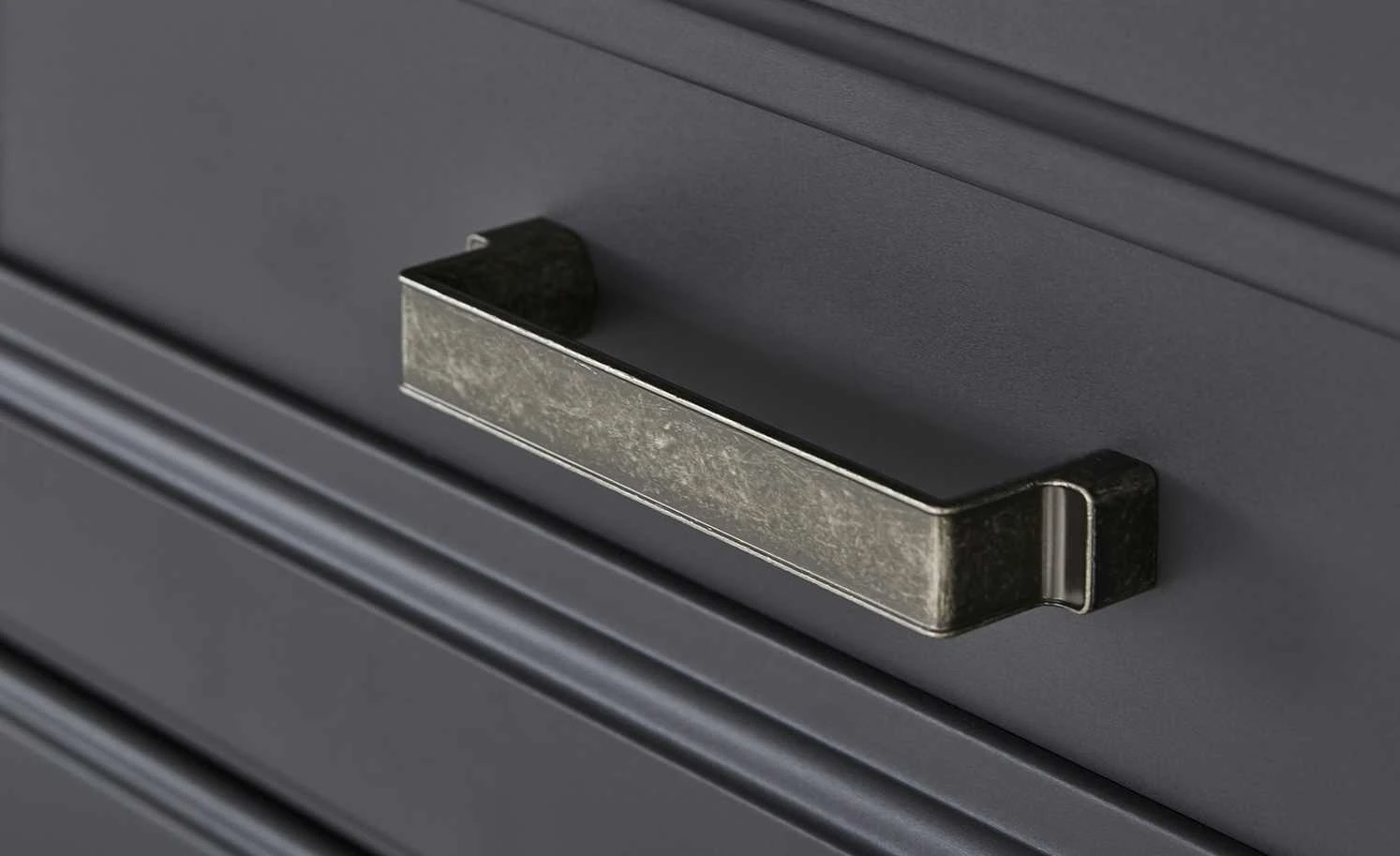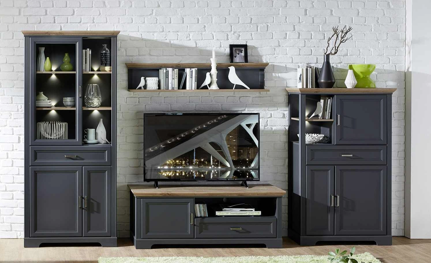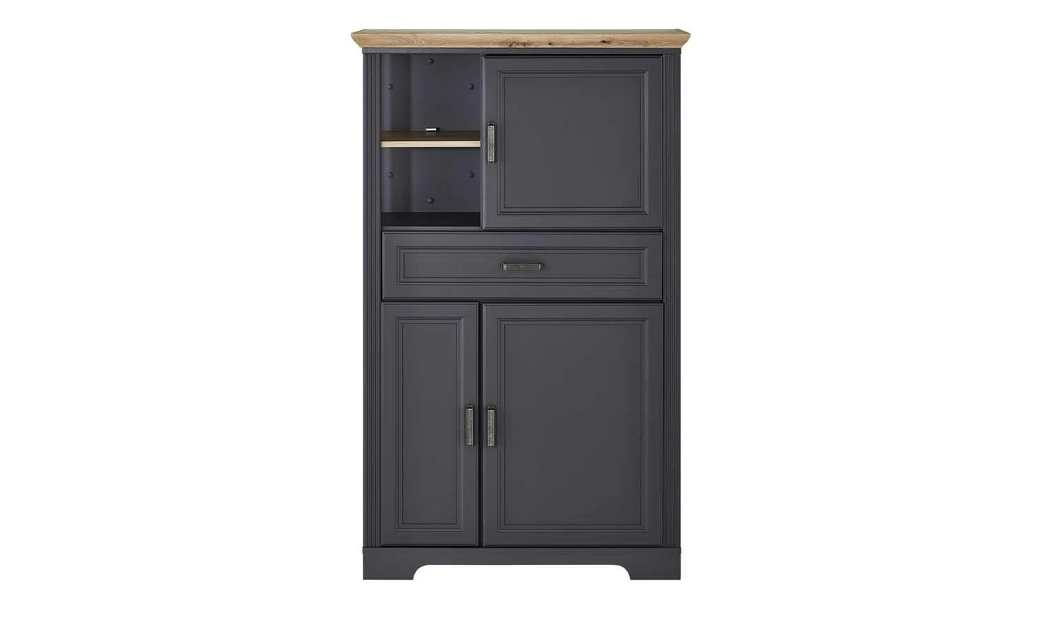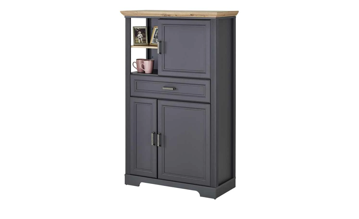 Wie der Name verrät, bietet das Stauraumelement Varese richtig viel Stauraum. Hinter den drei Türen stehen Ihnen beispielsweise sechs große Fächer zur Verfügung, deren Böden Sie in der Höhe verstellen können. Mittig befindet sich eine Schublade. Türen und Schublade haben eine Soft-Close-Ausstattung, die ein geräuscharmes Schließen ermöglicht. Zusätzlich können Sie zwei offene Regalfächer nutzen. Neben dem praktischen Nutzen sieht Varese auch gut aus: Front und Korpus sind im Landhausstil verziert und haben eine elegante graphitgraue Farbe. Die Abdeckplatte und der Regalboden setzen sich in Asteiche (Nachbildung) ab.