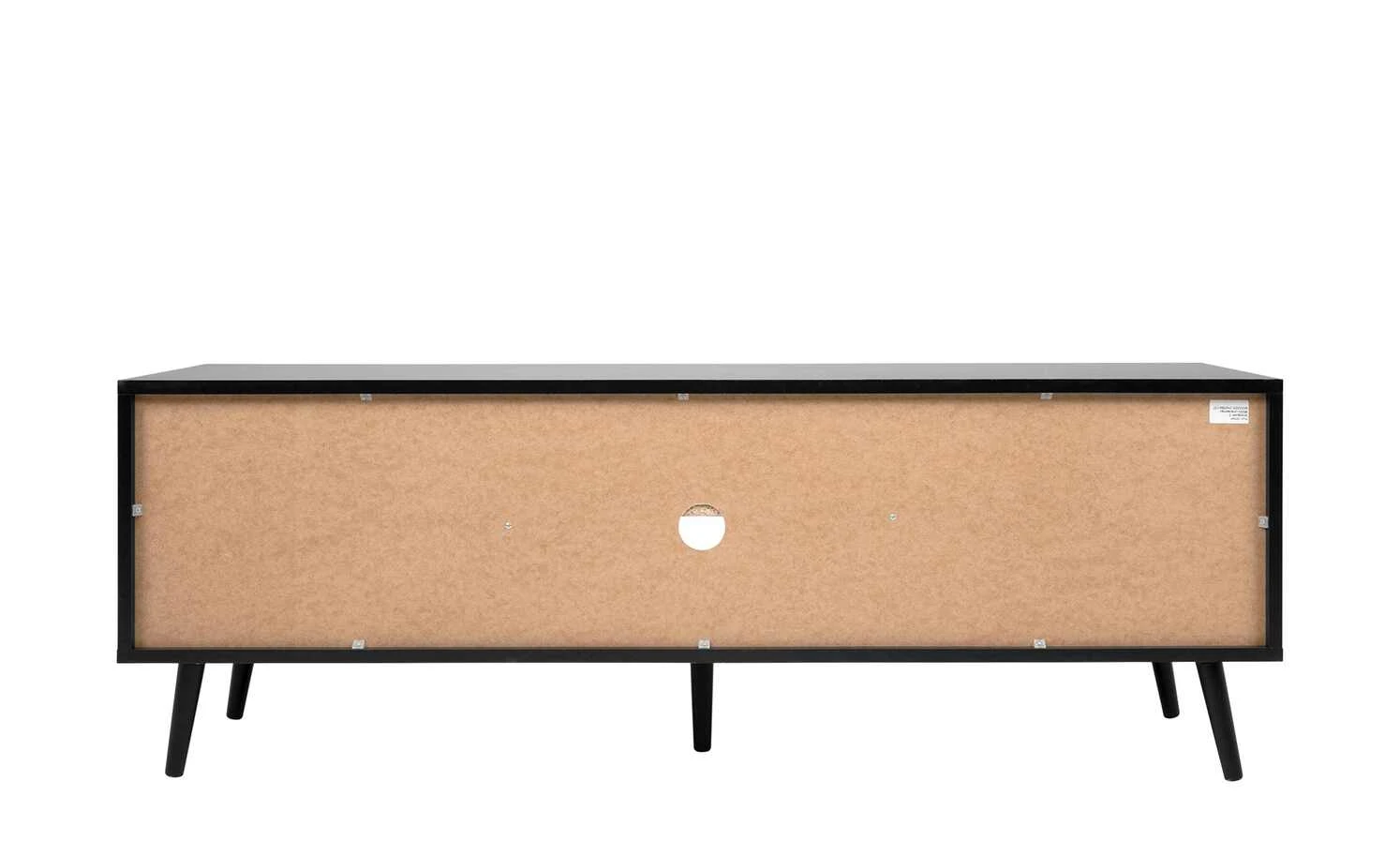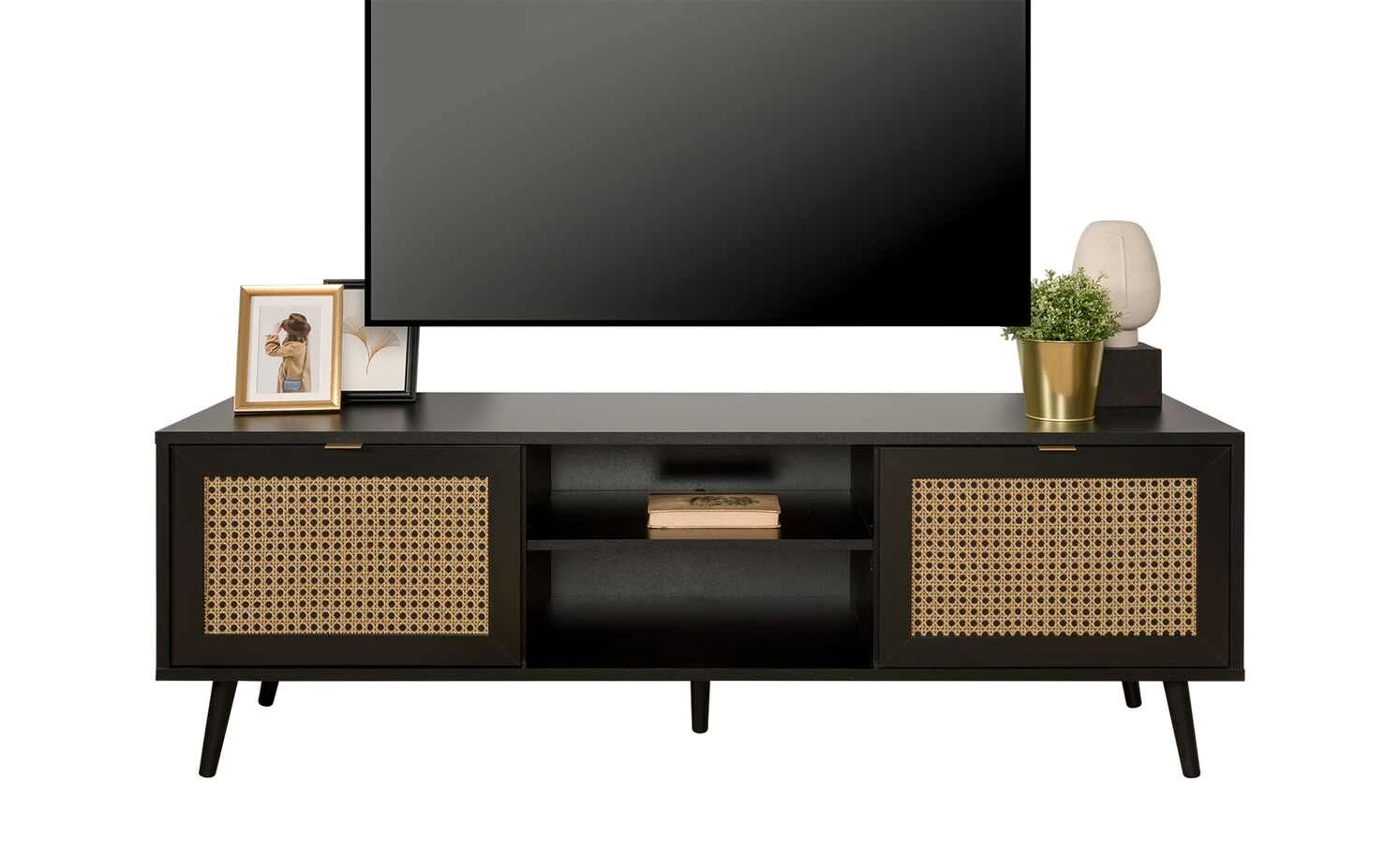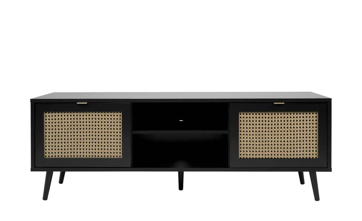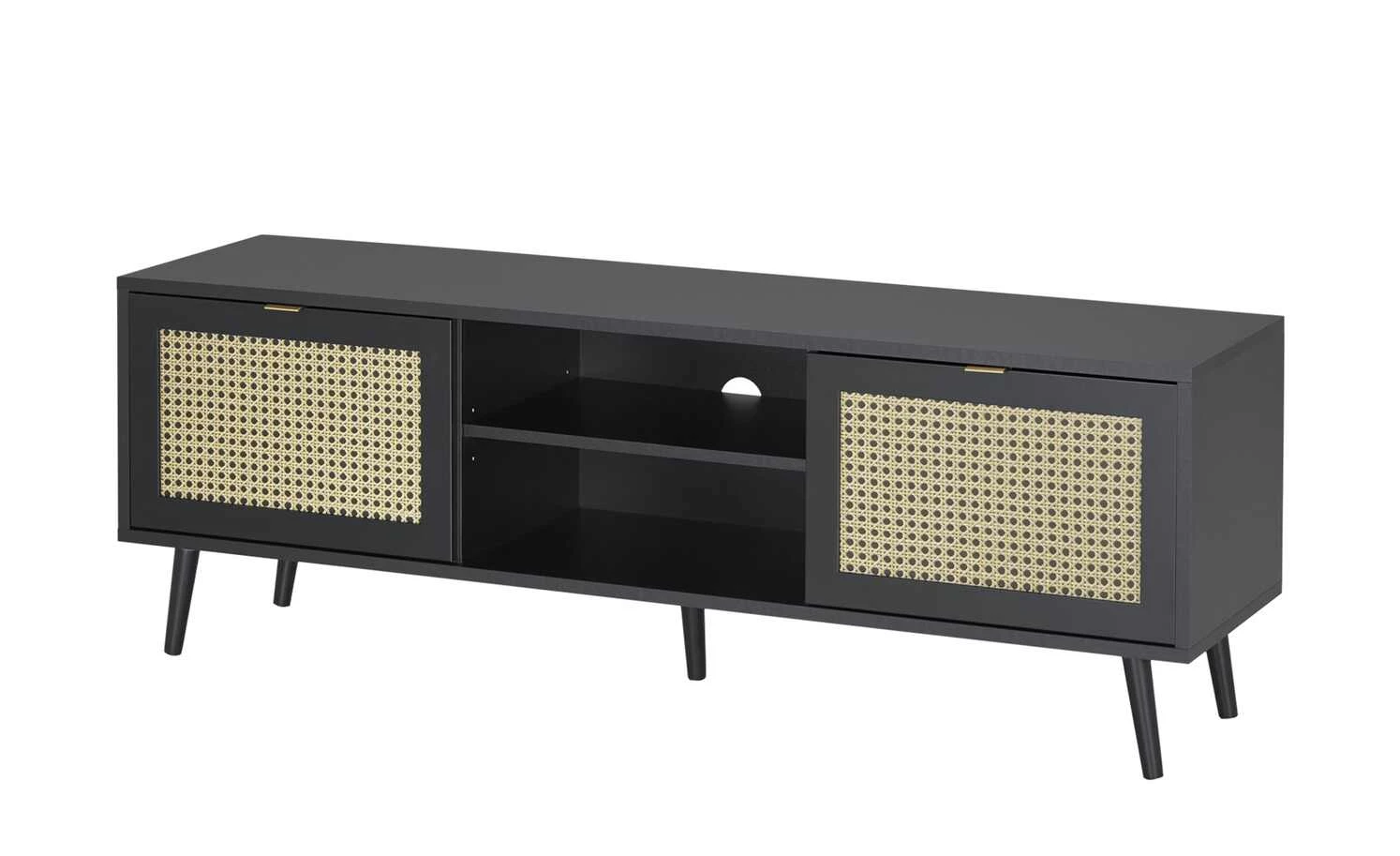 Das TV-Lowboard Vienna fällt durch die serientypischen Fronten in Wiener-Geflecht-Optik sofort ins Auge. Der ansonsten schwarze Fernsehschrank wird durch die helle Foto-Folie an den beiden Türen gekonnt akzentuiert. Platzieren Sie auf dem TV-Board Fernseher bis zu 65 Zoll auf der pflegeleichten Oberfläche und verstauen Sie Fernsehzubehör ganz einfach hinter den beiden Türen oder in den zwei offenen Fächern. Zwei messingfarbene Griffe komplettieren das Design. Die fünf Buchen-Massivholzfüße sorgen für einen festen Stand.