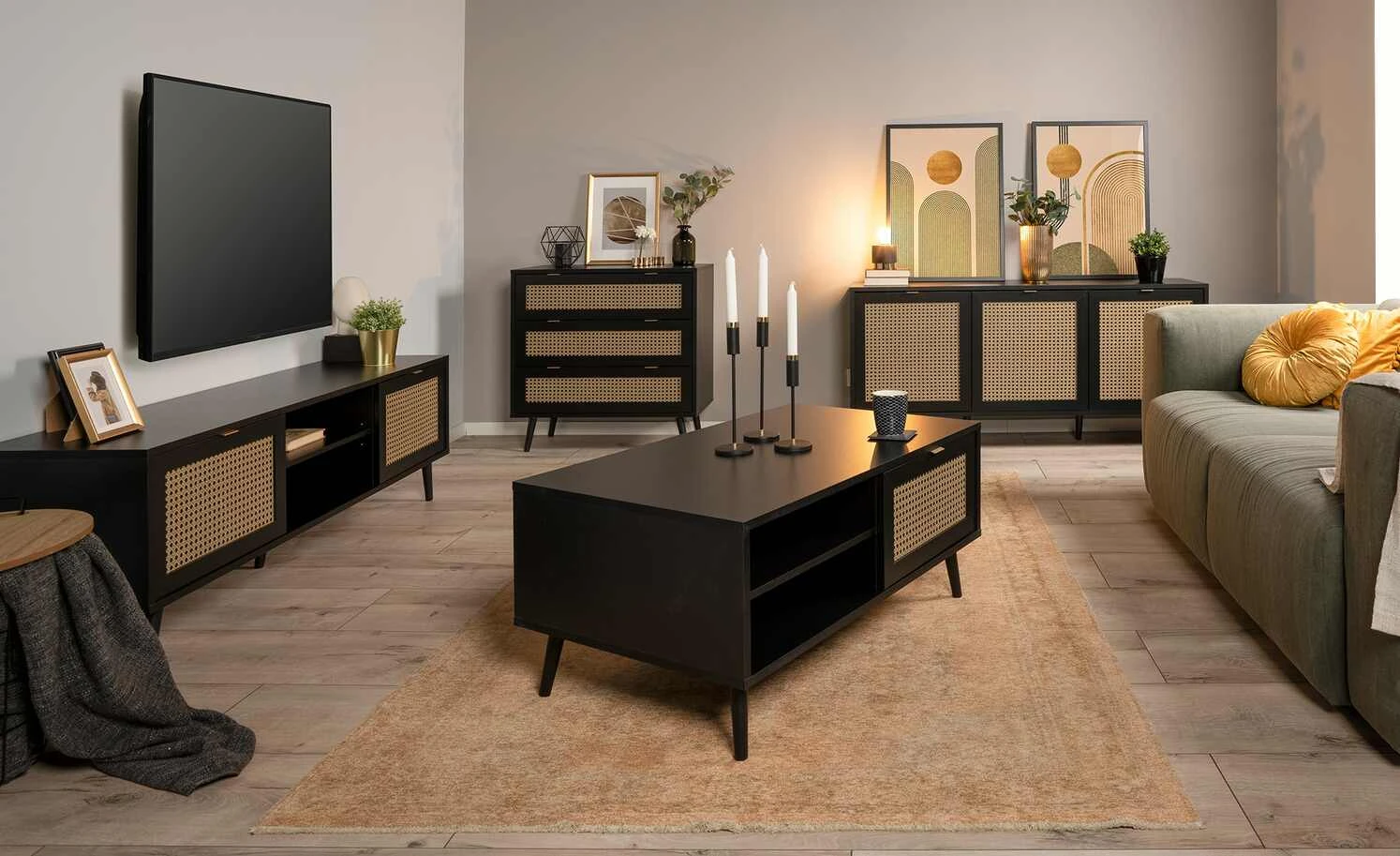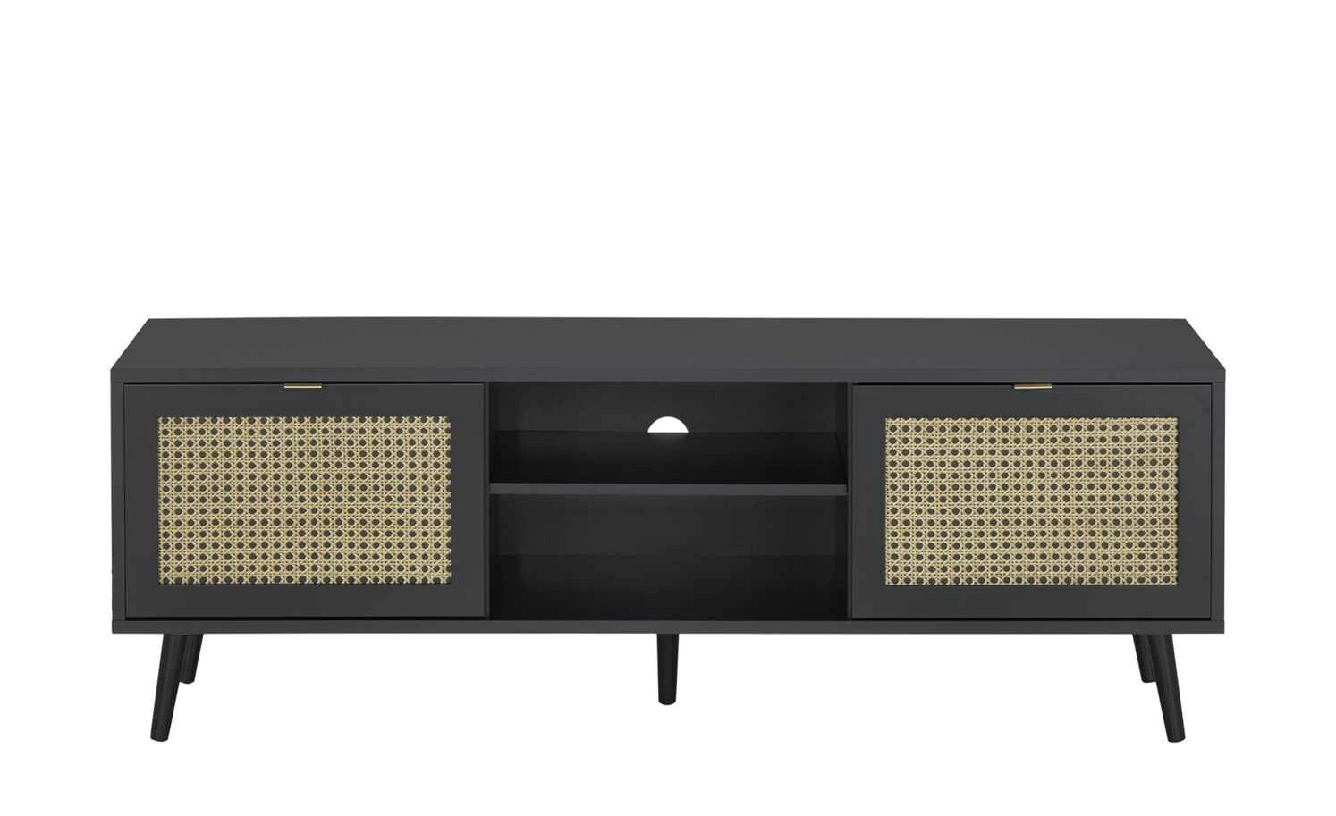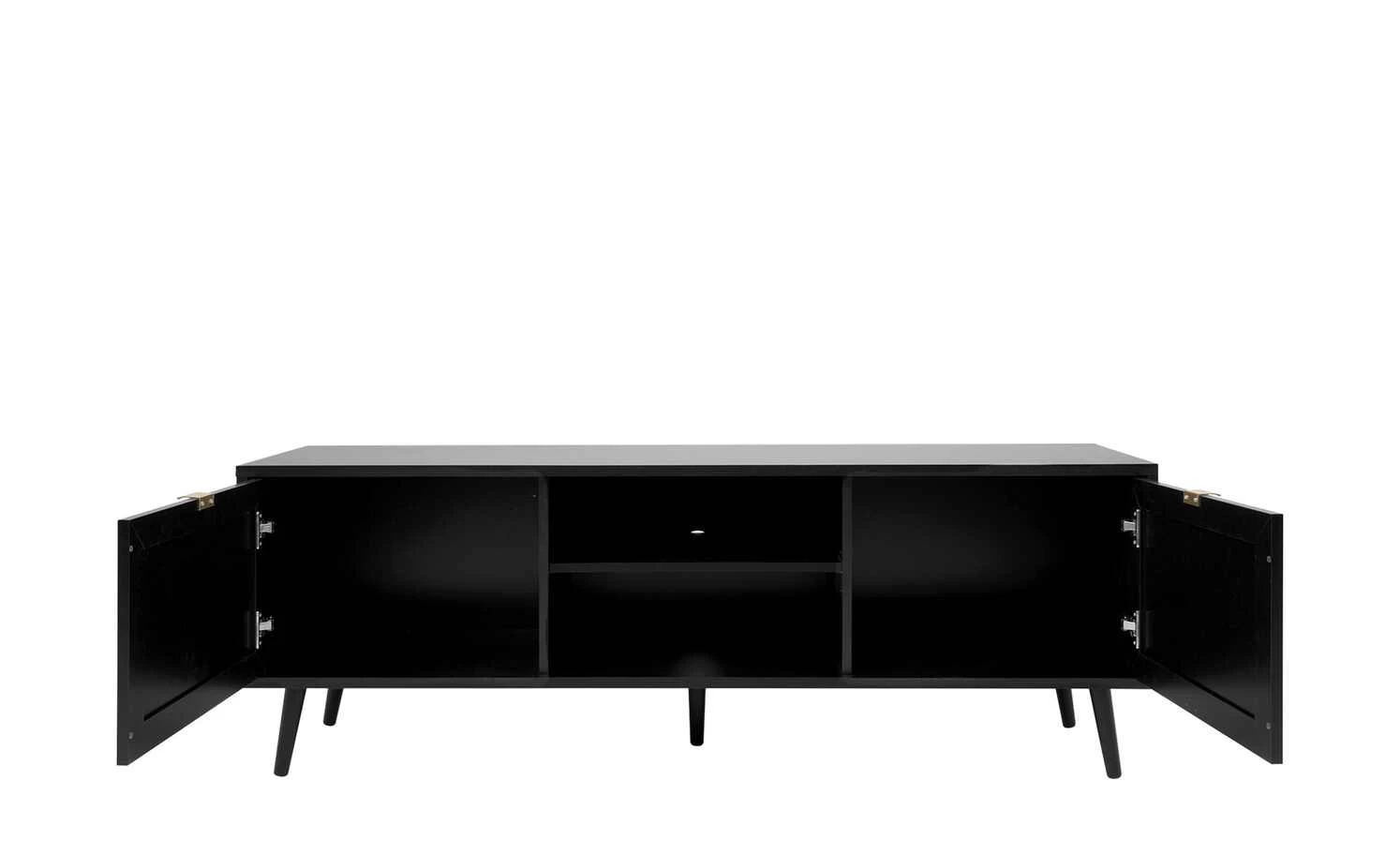 Das TV-Lowboard Vienna fällt durch die serientypischen Fronten in Wiener-Geflecht-Optik sofort ins Auge. Der ansonsten schwarze Fernsehschrank wird durch die helle Foto-Folie an den beiden Türen gekonnt akzentuiert. Platzieren Sie auf dem TV-Board Fernseher bis zu 65 Zoll auf der pflegeleichten Oberfläche und verstauen Sie Fernsehzubehör ganz einfach hinter den beiden Türen oder in den zwei offenen Fächern. Zwei messingfarbene Griffe komplettieren das Design. Die fünf Buchen-Massivholzfüße sorgen für einen festen Stand.