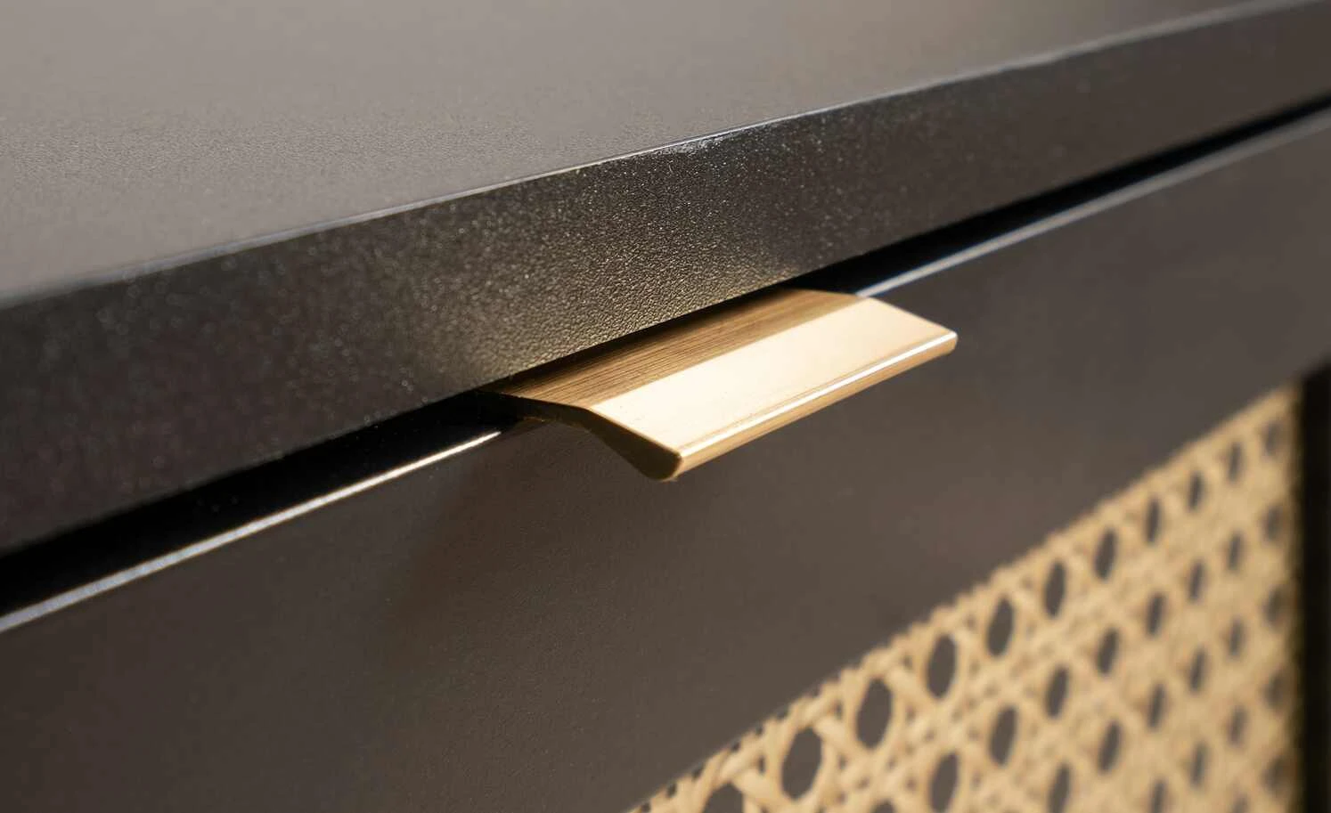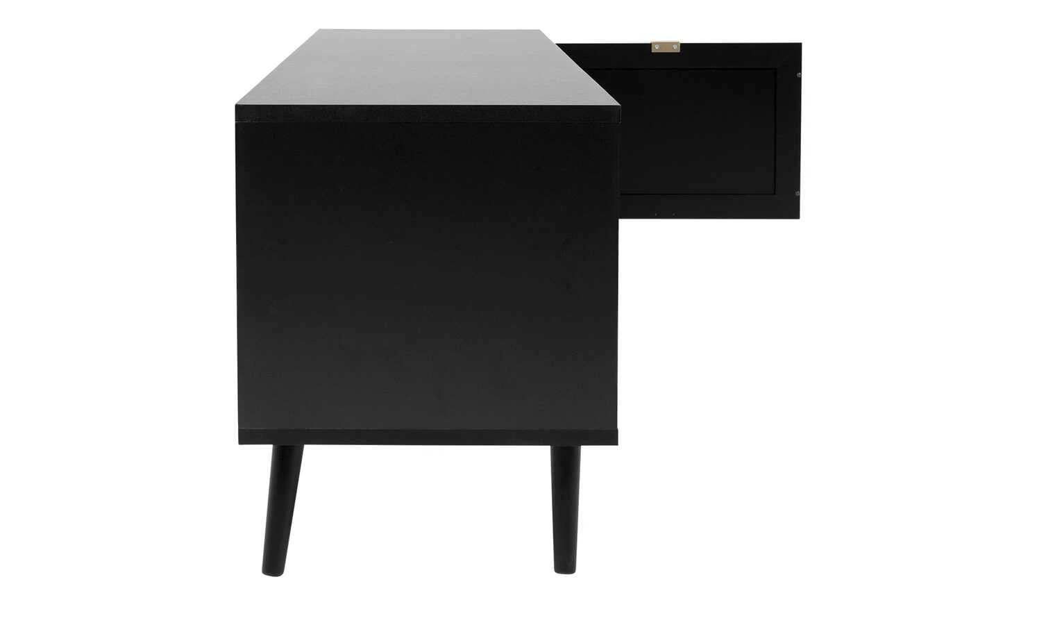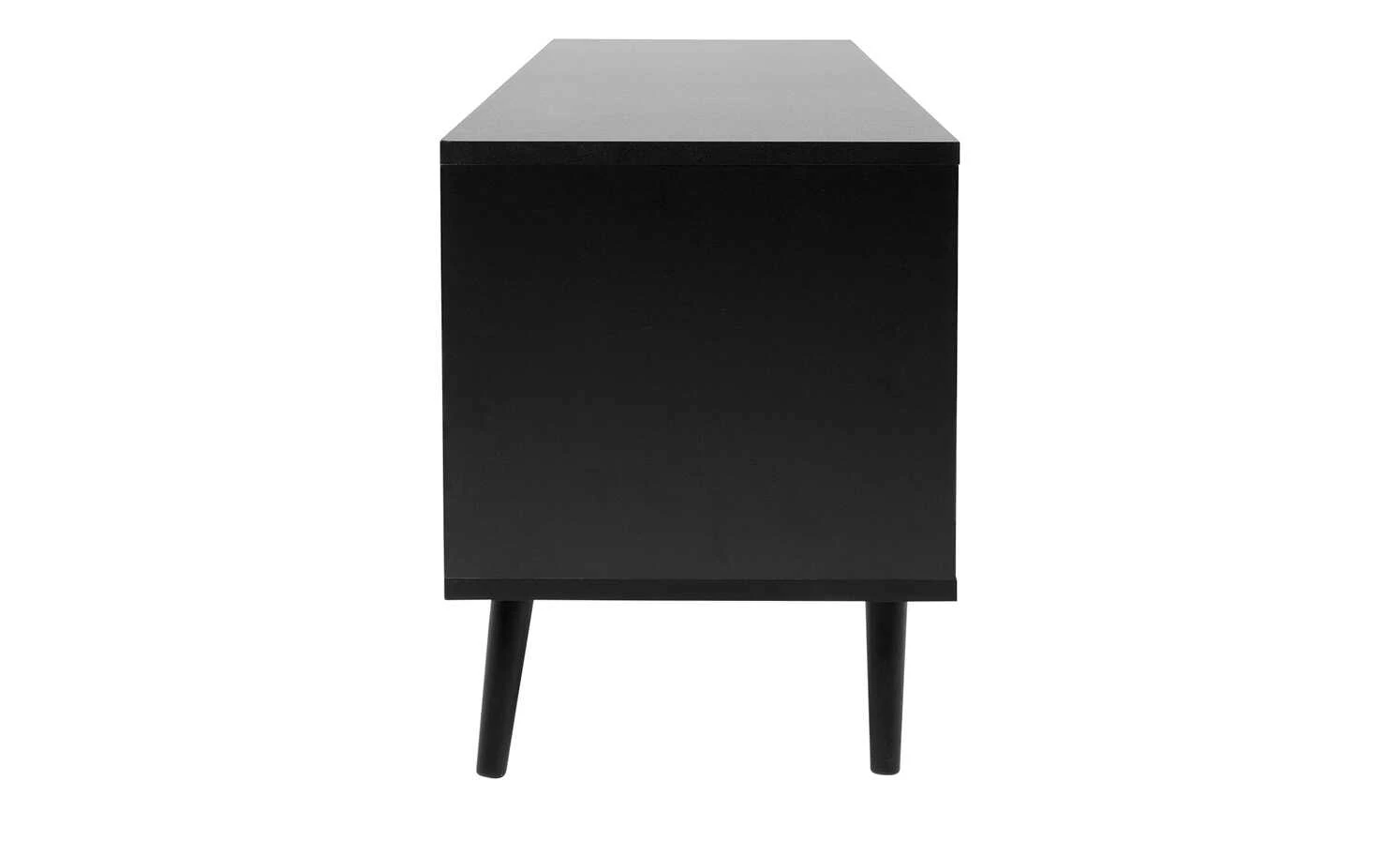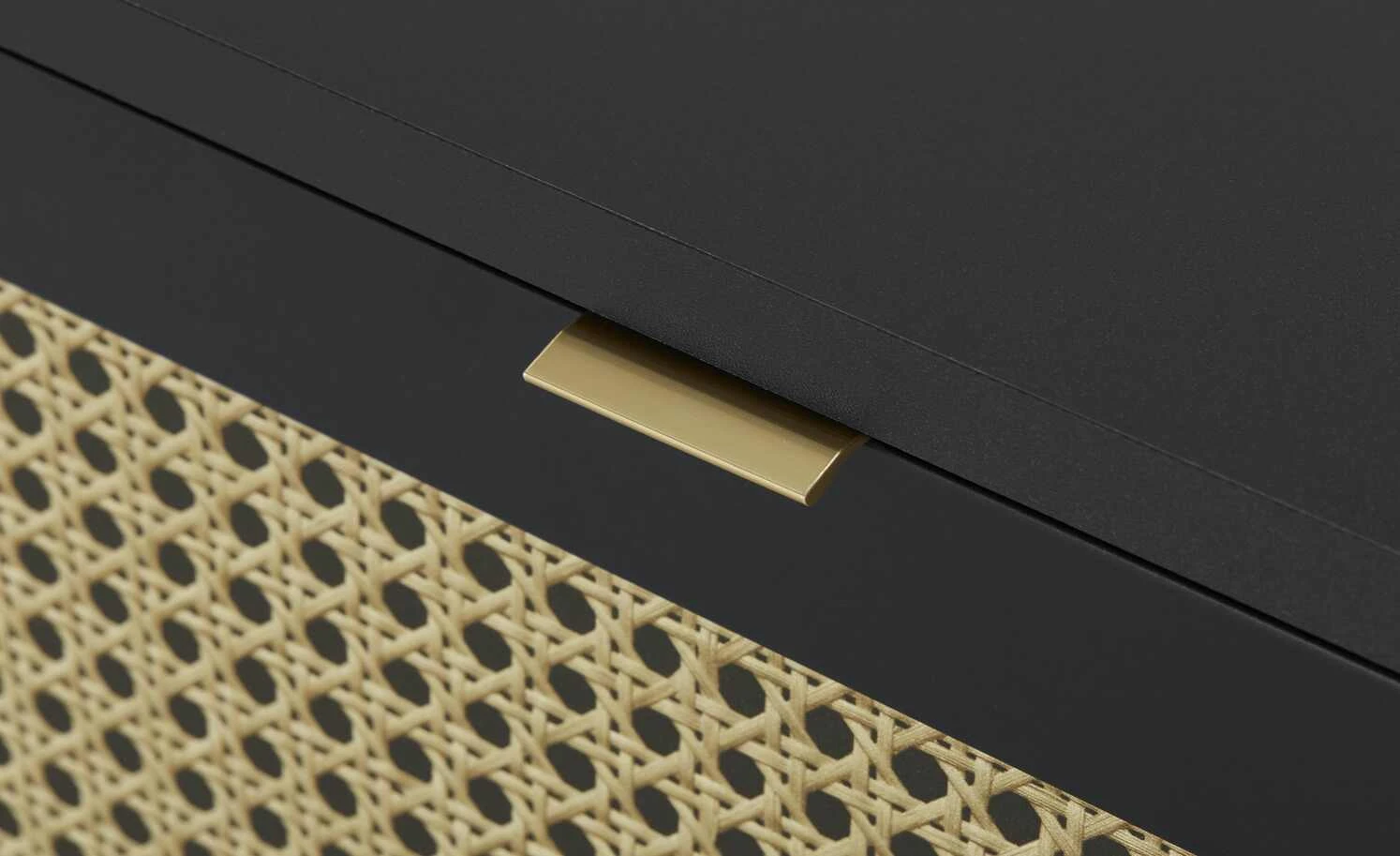 Das TV-Lowboard Vienna fällt durch die serientypischen Fronten in Wiener-Geflecht-Optik sofort ins Auge. Der ansonsten schwarze Fernsehschrank wird durch die helle Foto-Folie an den beiden Türen gekonnt akzentuiert. Platzieren Sie auf dem TV-Board Fernseher bis zu 65 Zoll auf der pflegeleichten Oberfläche und verstauen Sie Fernsehzubehör ganz einfach hinter den beiden Türen oder in den zwei offenen Fächern. Zwei messingfarbene Griffe komplettieren das Design. Die fünf Buchen-Massivholzfüße sorgen für einen festen Stand.