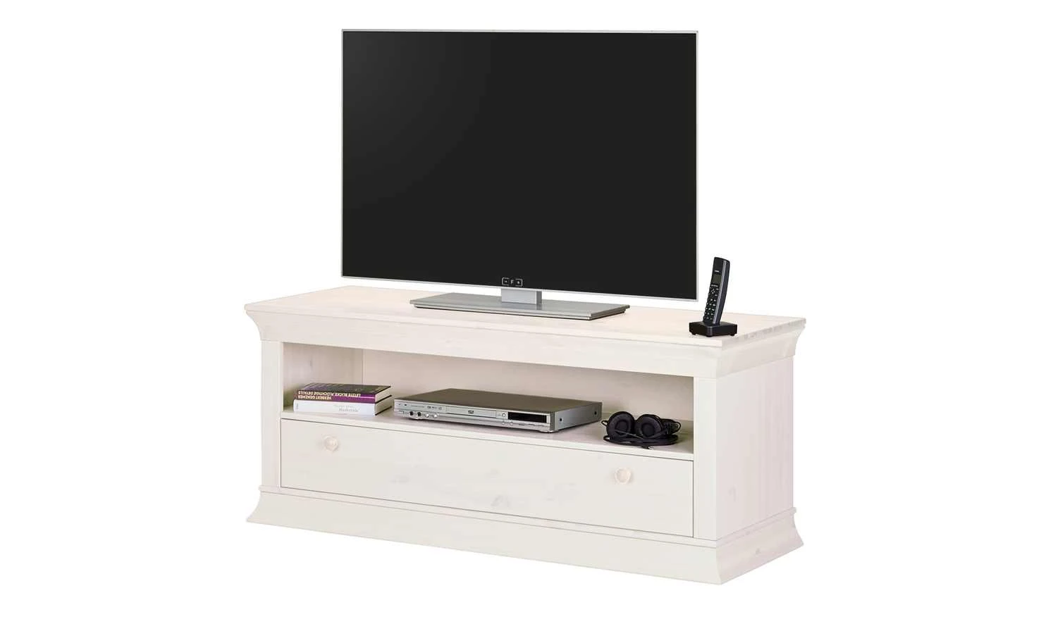 Geben Sie ihrem Fernseher ein passendes Plätzchen, zum Beispiel auf dem TV-Board Bornholm. Wie alle Möbel der Serie, fällt auch dieses Modell durch seinen Landhausstil auf. Korpus und Front sind weiß gewachst, eine leichte Holzmaserung schimmert durch. Diese kommt von dem Kiefernholz aus dem Bornholm gefertigt wurde. Bornholm hat ein offenes Fach und ein Fach mit Klappe.