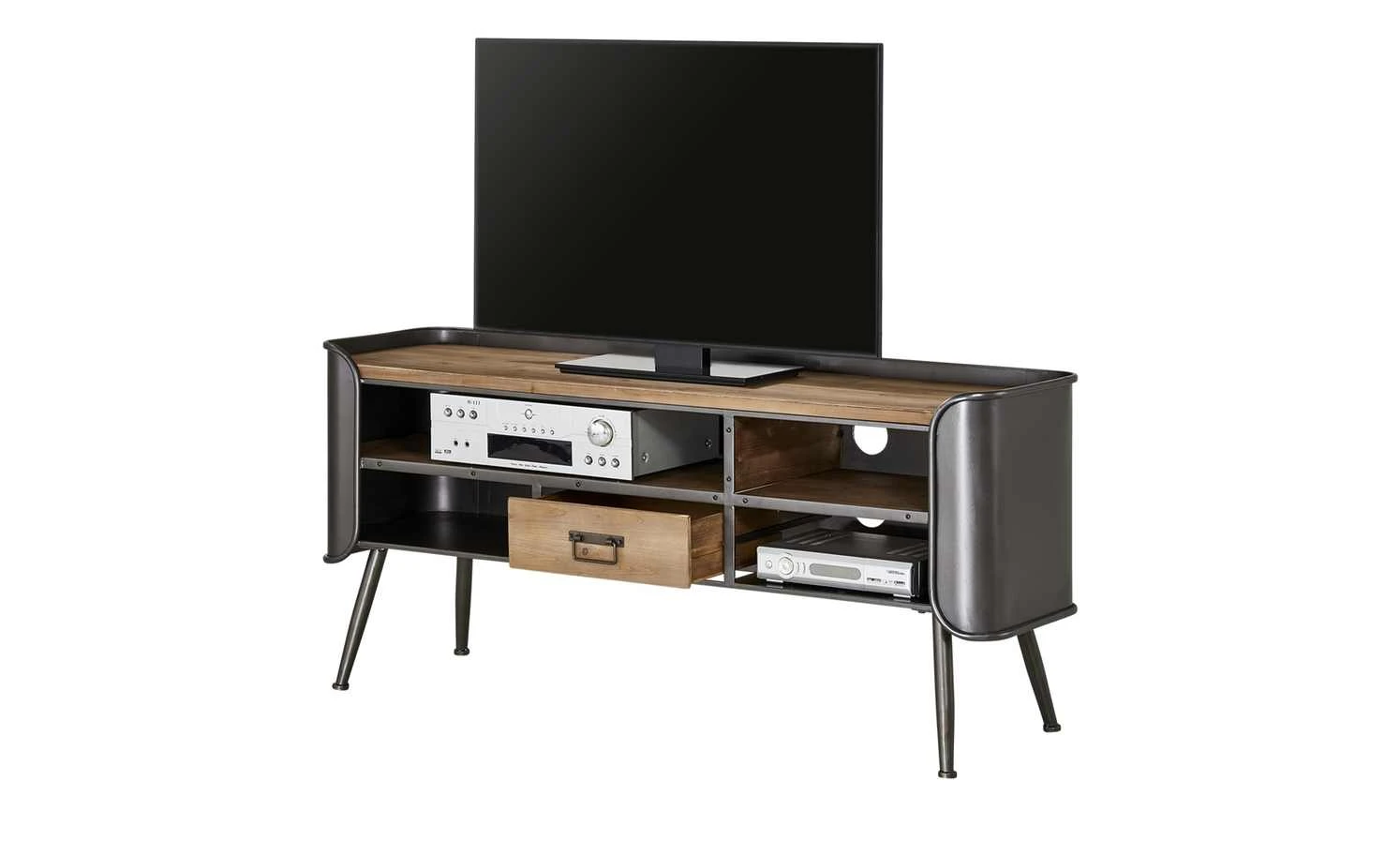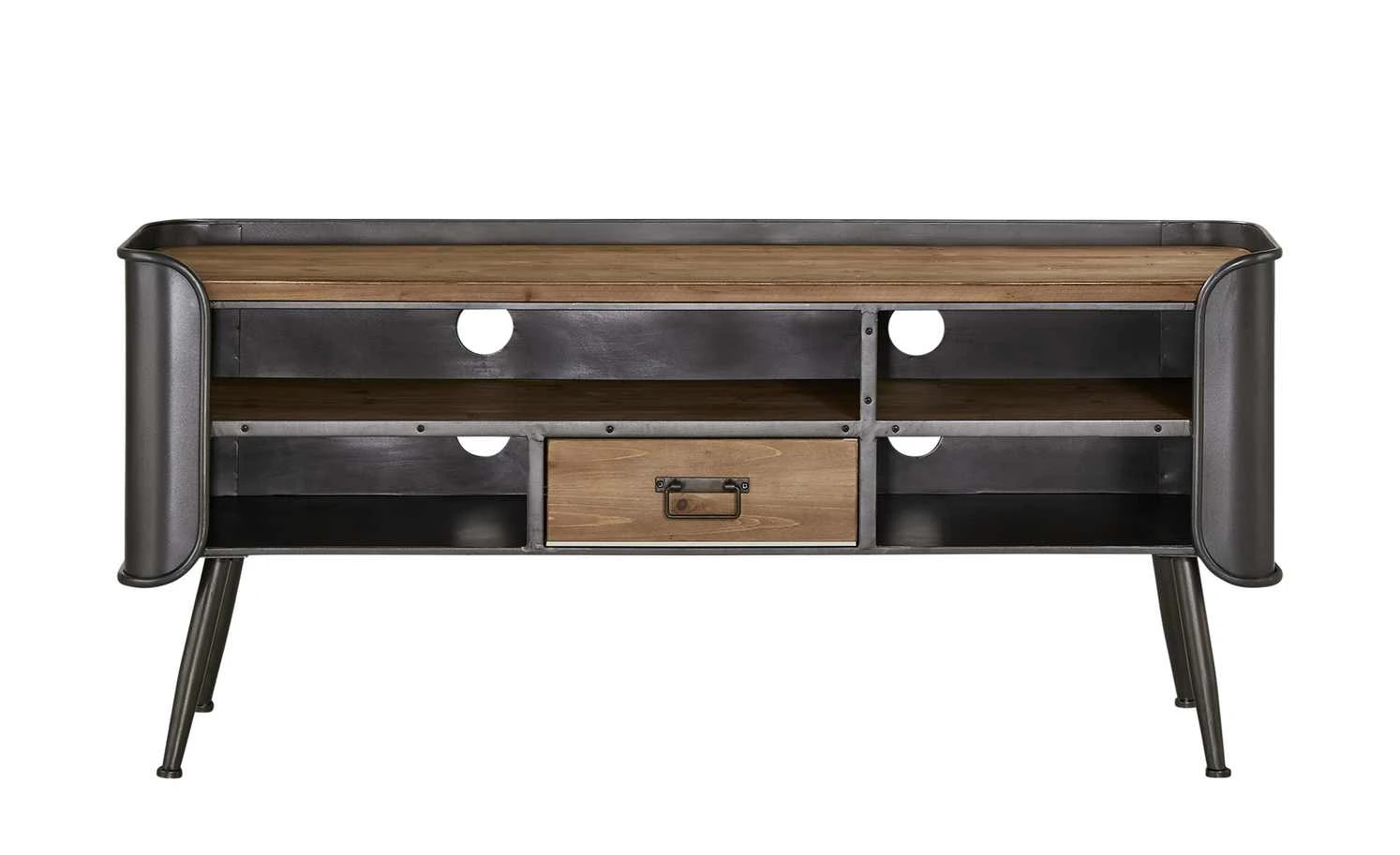 Beim TV-Lowboard Imola harmonieren rostfarbenes Metall und gemasertes Kiefernholz gekonnt miteinander. Die beiden Materialien werden durch bewusst gesetzte Used-Effekte akzentuiert, sodass ein ganz besonderer Industrial-Charme entsteht. Unter der 140 Zentimeter langen Holzfläche für Ihren Fernsehbildschirm befinden sich vier offene Fächer und ein Schubfach mit Massivholz-Front. Jedes der offenen Fächer ist mit einem Kabeldurchlass versehen, damit Sie Receiver und Co. ganz nach Ihren Wünschen platzieren können.