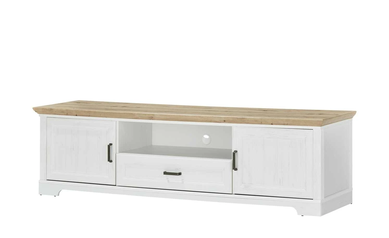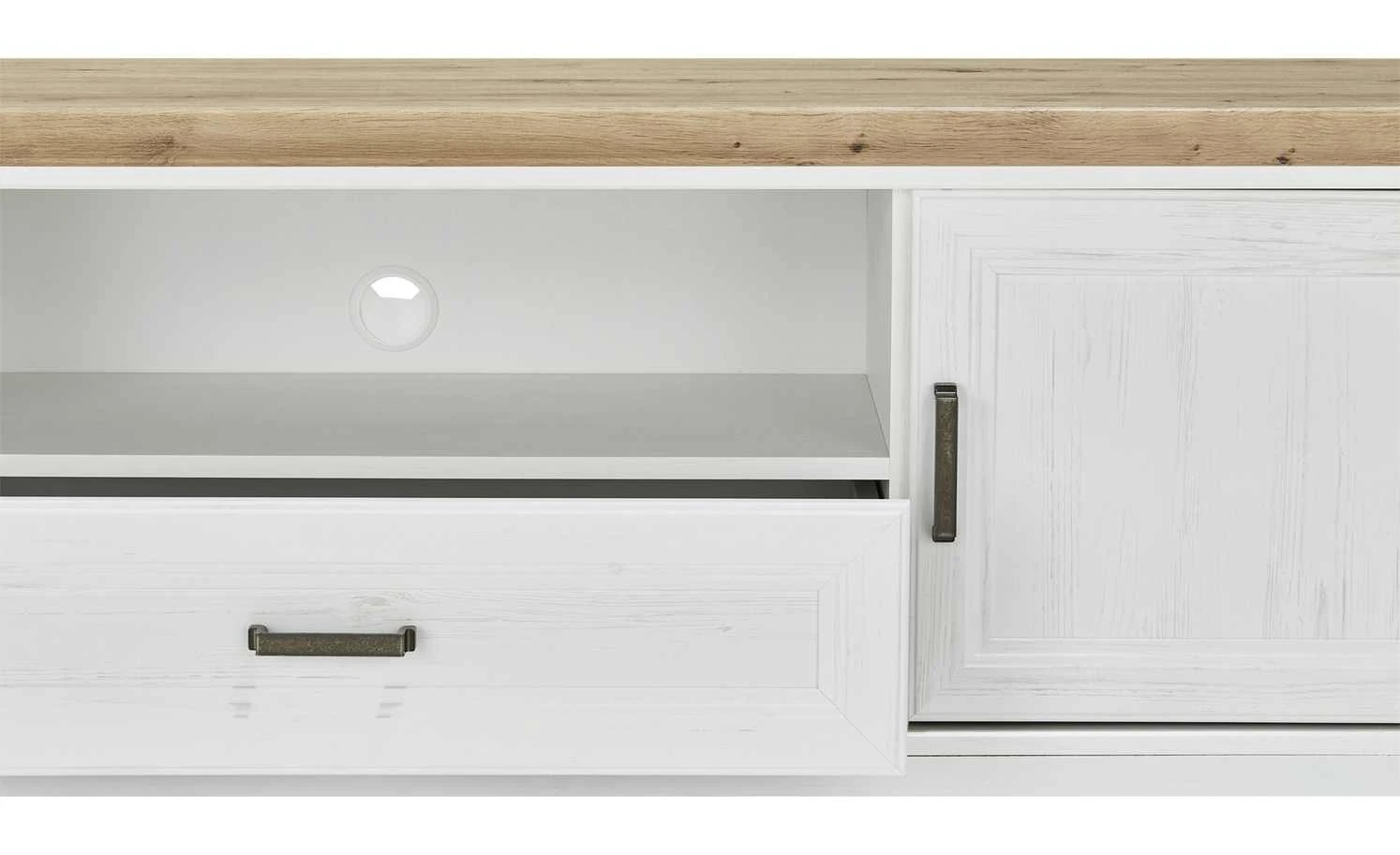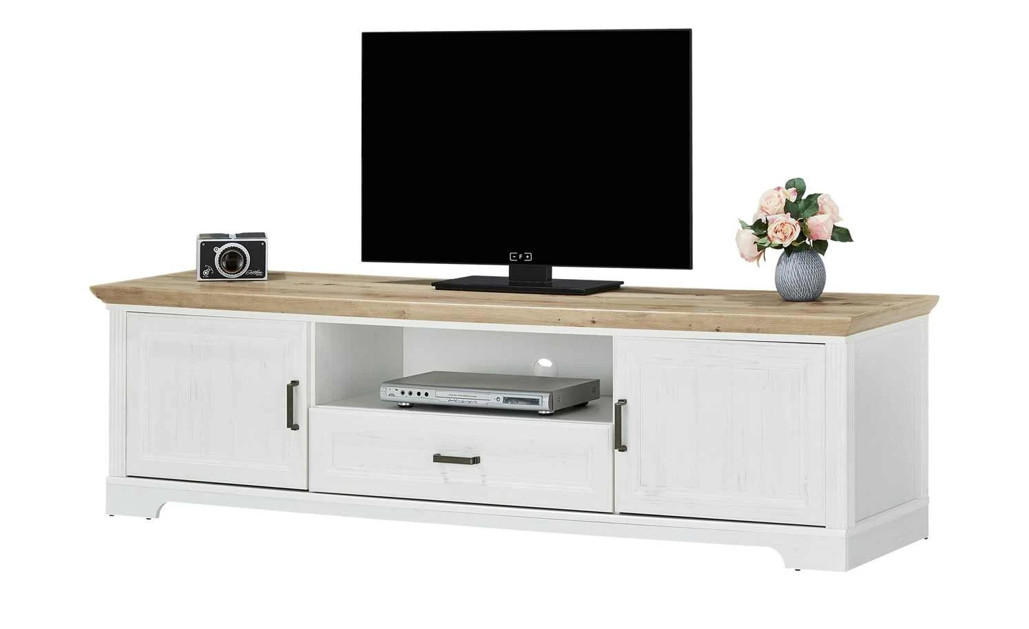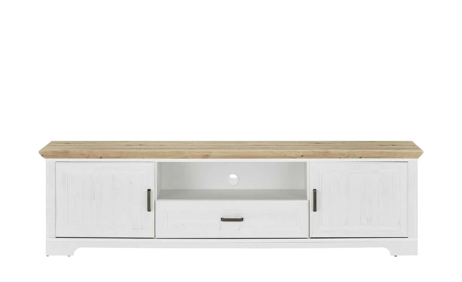 Im Wohnzimmer zaubert der Landhausstil der Serie Varese eine angenehme Behaglichkeit. Teil der Serie ist dieses TV-Lowboard. Es hat eine Stellfläche von 193 Zentimetern Breite und ist mit bis zu 40 Kilogramm belastbar. Dadurch können Sie auch TV-Geräte bis 75 Zoll auf dem Lowboard platzieren. Mittig ist ein Gerätefach zu finden. Dank des Kabeldurchlasses in der Rückwand wird Kabelsalat verhindert. Damit Sie Blurays oder anderes Zubehör unterbringen können, ist Varese mit innen mit vier Fächern und einer Schublade ausgestattet. Türen und Schublade schließen dank Soft-Close leise.