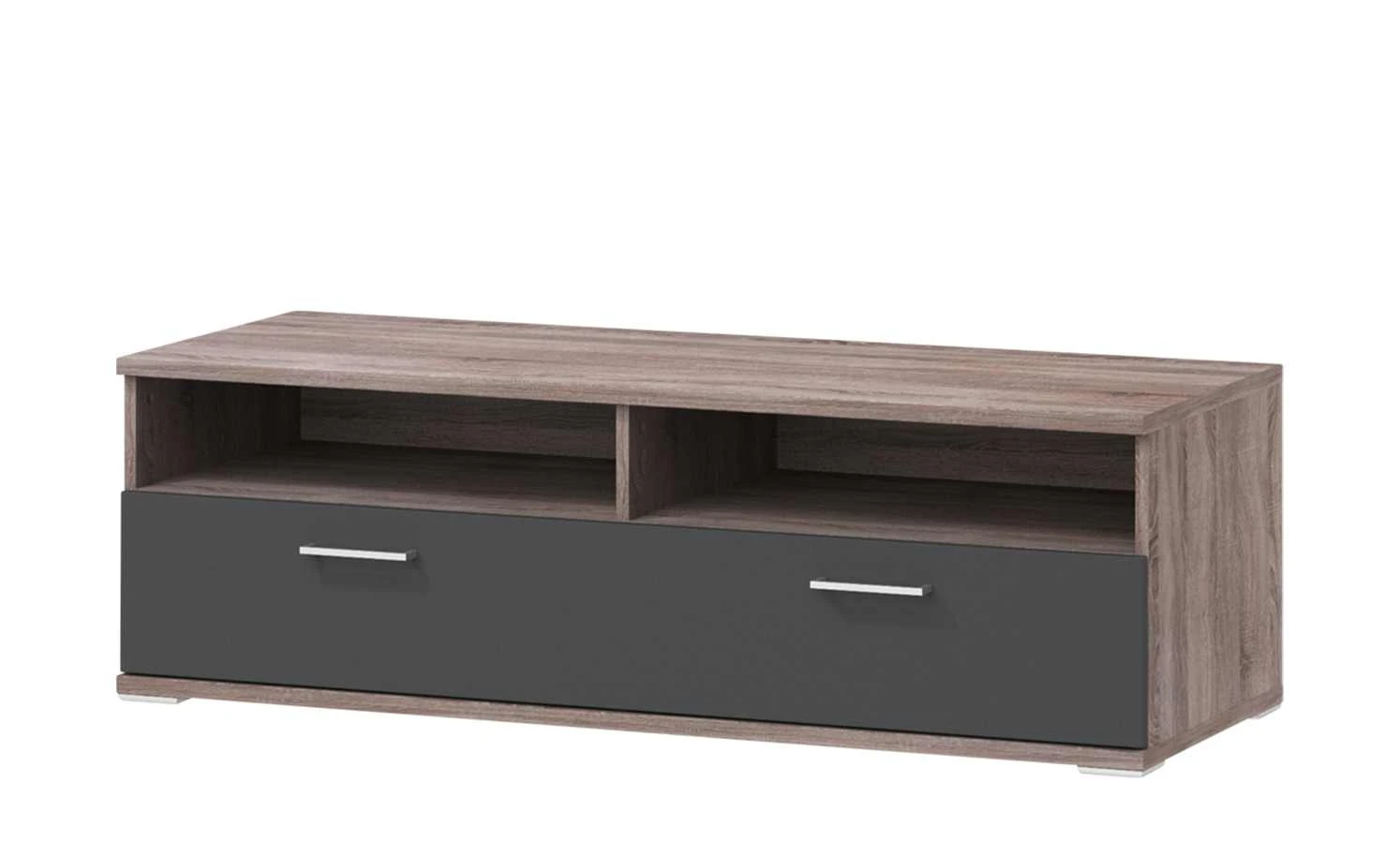 Das Lowboard Onyx von uno bietet Stauraum und Stellfläche im Wohnraum. Sie können darauf zum Beispiel Ihren Fernseher platzieren. In den beiden offenen Fächern direkt darunter finden zum Beispiel Festplattenrecorder und Co. einen Platz. Onyx ist mit zwei Schubkästen ausgestattet. Das Besondere daran: Beide teilen sich eine Front, so dass ein ebenmäßiges Designt entsteht. Die Schubkästen sind mit einem Selbsteinzug und Soft-Close ausgestattet, wodurch sie sanft und leise schließen. Das Lowboard verfügt über einen melaminbeschichteten Korpus in Holzoptik. Die hochglänzende Front in Graphitgrau setzt sich davon ab.
