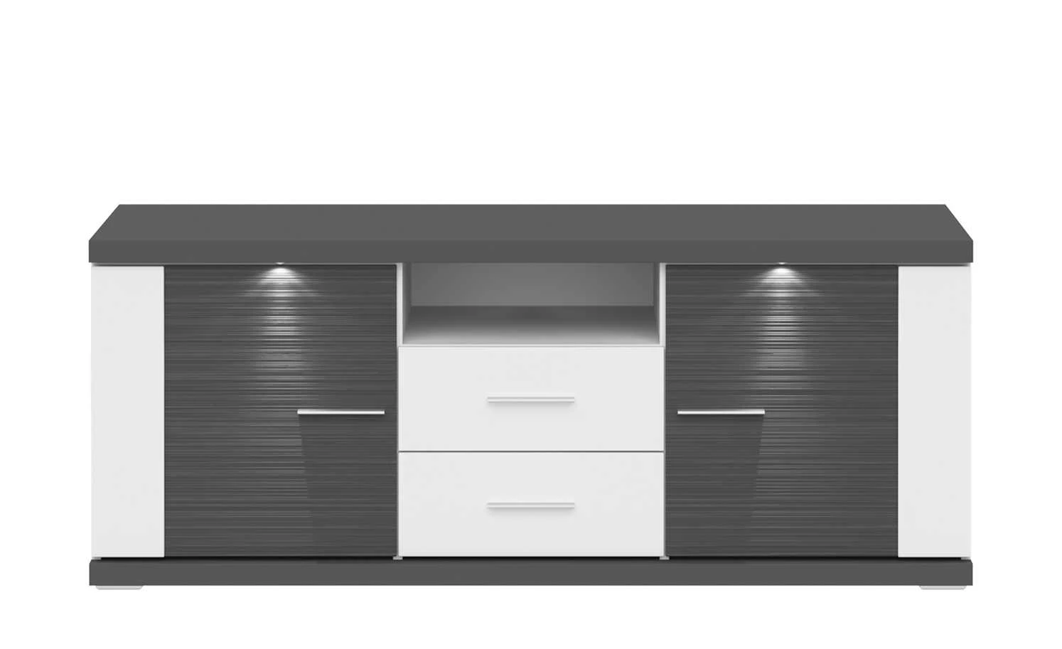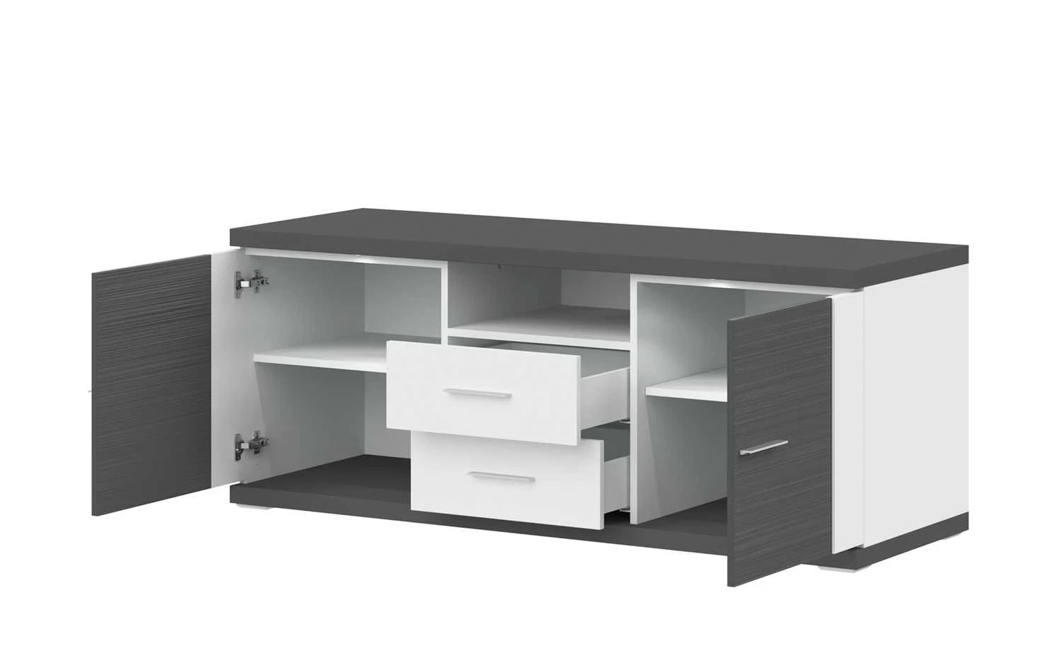 Bringen Sie noch mehr Stauraum in Ihr Wohnzimmer – und zwar mit dem Lowboard Titan von uno. Links und rechts ist jeweils eine Tür mit je zwei Fächern zu finden. Mittig können Sie ein offenes Fach und zwei Schubladen nutzen. Titan ist zweifarbig gestaltet: Ein schönes Weiß wird mit Graphit (Nachbildung) kombiniert. An den Türfronten wird das dunkle Dekor durch eine geriffelte Optik akzentuiert. Die weißen Frontflächen haben ein edles Hochglanzfinish. Durch die LED-Spots an der Front wird Titan perfekt ausgeleuchtet.