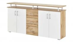 Erweitern Sie den Stauraum im Wohn- oder Esszimmer mit dem Sideboard Katt von uno. Im oberen Bereich stehen Ihnen drei Schubladen zur Verfügung. Praktisch: Sie sind mit einem Selbsteinzug und einer Soft-Close-Funktion ausgestattet und schließen so langsam und geräuscharm. Im unteren Bereich sind drei Türen zu finden. Hinter jeder der Türen stehen Ihnen zwei Fächer zur Verfügung. Neben seiner praktischen Seite ist Katt auch attraktiv designt. Hauptaugenmerk ist der Kontrast zwischen Front und Korpus. Die Front fällt durch ihr rustikales Dekor in Eiche San Remo (Nachbildung) auf. Seitliche LEDs bringen die Front noch besser zur Geltung. Sie sind im Lieferumfang enthalten.