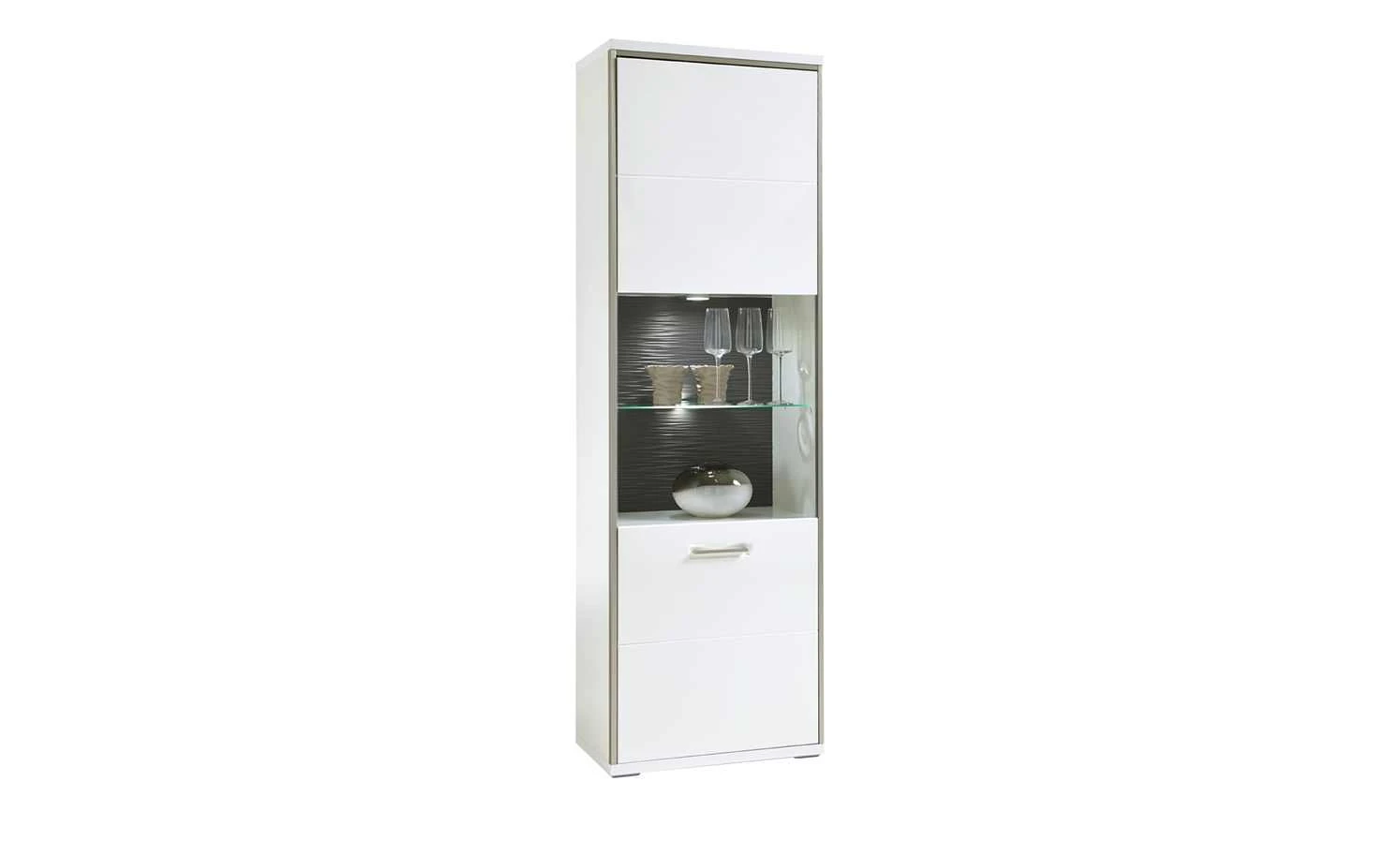 Die modern designte Vitrine Setto passt gleichermaßen in Wohnraum und Esszimmer. Das strahlende Weiß fällt sofort ins Auge. Durch den edlen Hochglanz wird der dezente Farbton in Szene gesetzt. Die sichtbare Vitrinenrückwand setzt sich durch das elegante Grau ab. Ein zusätzlicher Akzent wird durch die geriffelte Oberfläche gesetzt. So wird der Inhalt der beiden Vitrinenfächer besonders gut zur Geltung gebracht. Ober- und unterhalb der Vitrinenfächer stehen Ihnen jeweils zwei geräumige Fächer zur Verfügung. Ideal für Geschirr, Tischwäsche und andere Dinge.