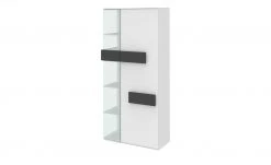 - Mehr zum Material: Korpus und Front aus Spanplatte, melaminbeschichtet; Front z.T. aus Glas, satiniert