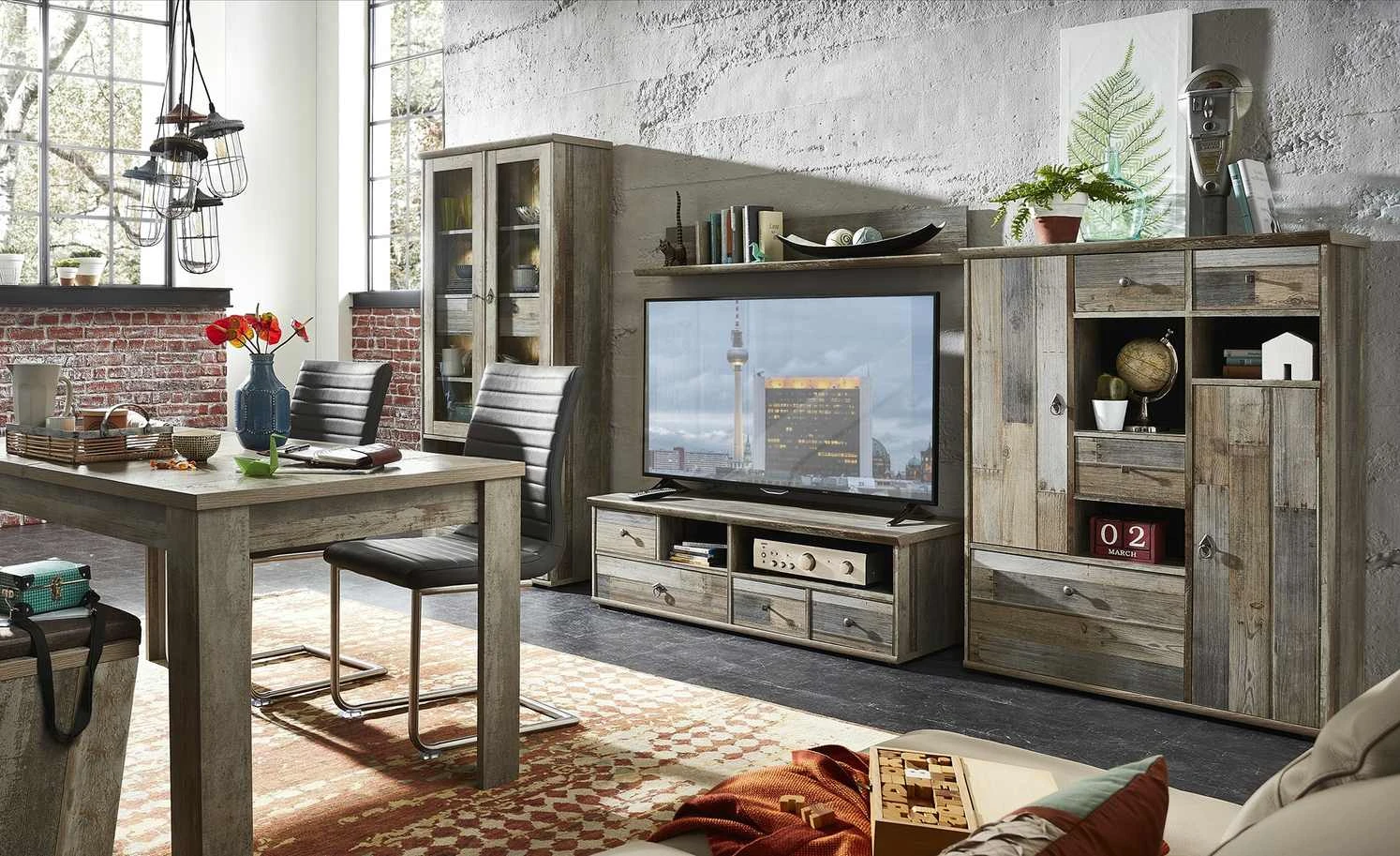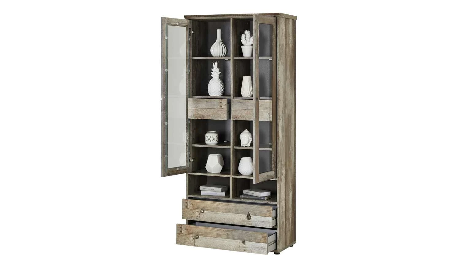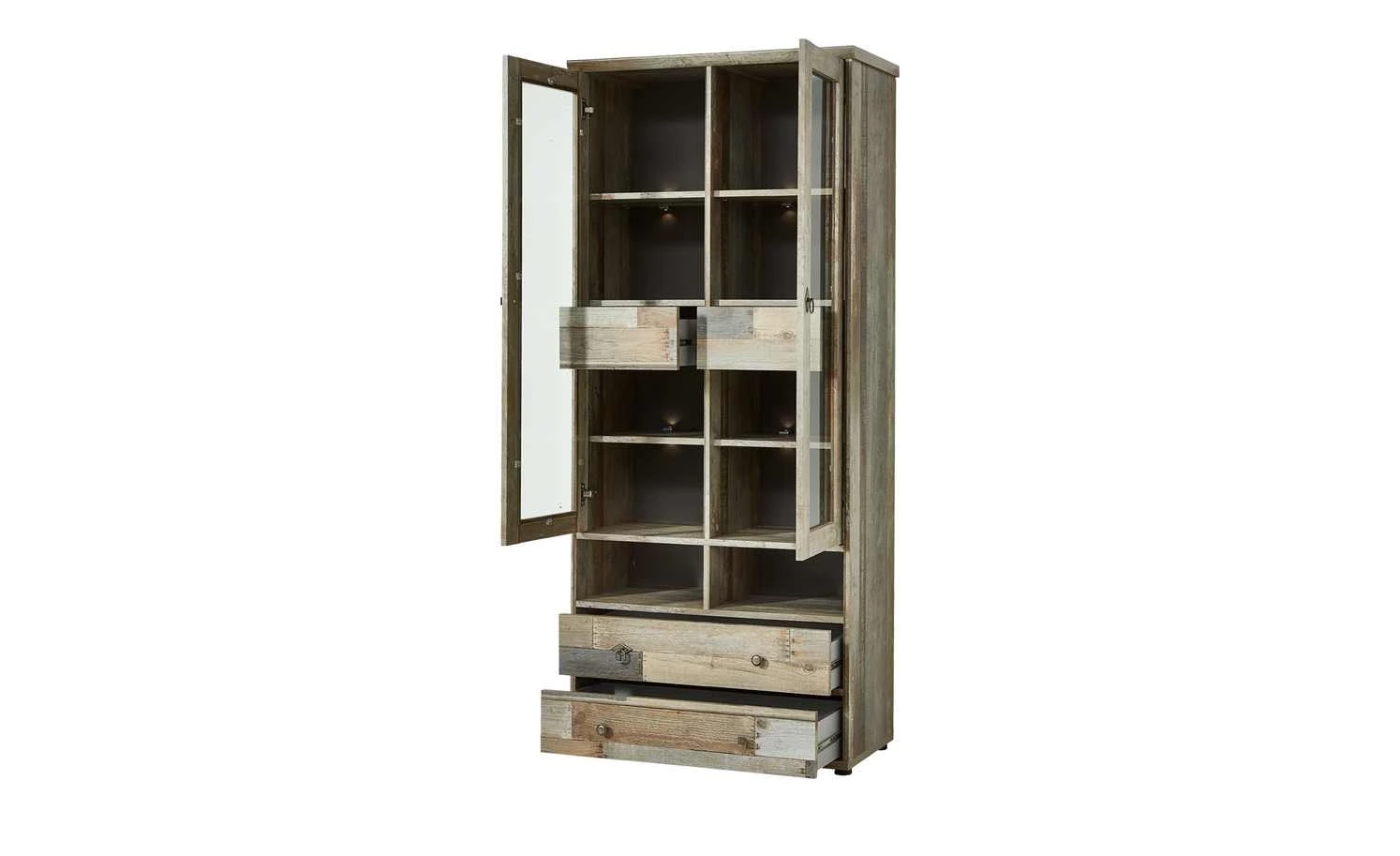 Mit ihrer interessanten Treibholz-Optik ist die Vitrine Sedona ein Eyecatcher. Front und Korpus wirken, als würden sie aus diversen Hölzern bestehen. Eine Holzbodenbeleuchtung ist im Lieferumfang und lässt die Vitrinenfächer und deren Inhalt erstrahlen. Zusätzlich hat Sedona vier Schubkästen und zwei offene Fächer.