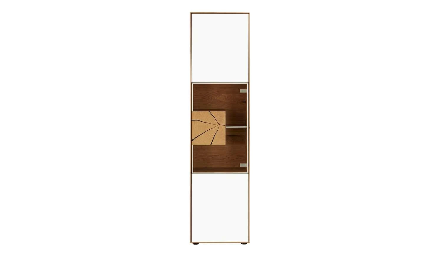 - Mehr zur Ausführung: oben und unten je eine Mattglastür und mittig eine Glastür mit Hirnholzblock als Fach