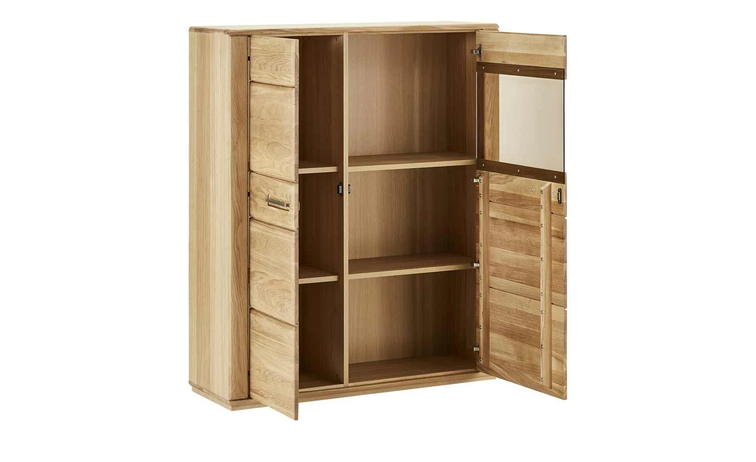 Viel Platz für Geschirr, Gläser und Tischwäsche bietet Ihnen das Kombi-Highboard Dio. Hinter den beiden Drehtüren stehen Ihnen insgesamt acht Fächer zur Verfügung. Durch den Glasausschnitt in der Tür haben Sie einen freien Blick in eines der Fächer. Ideal um dort besonders edle Lieblingsstücke in Szene zu setzen. Die Front des Kombi-Highboards besteht aus stabilem Massivholz. Der Korpus ist hochwertig furniert.