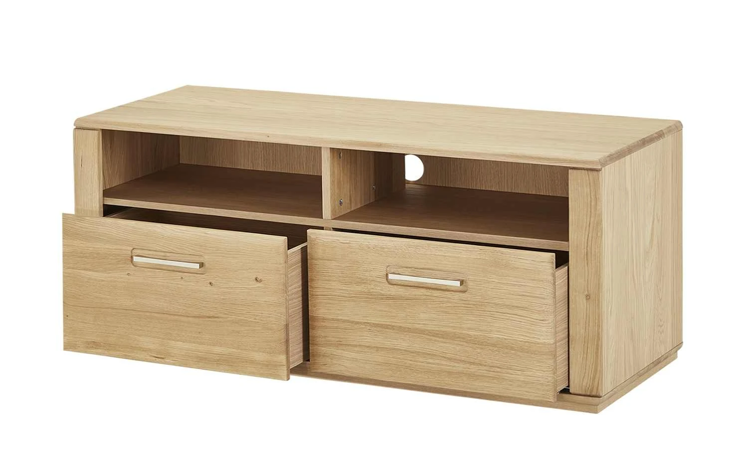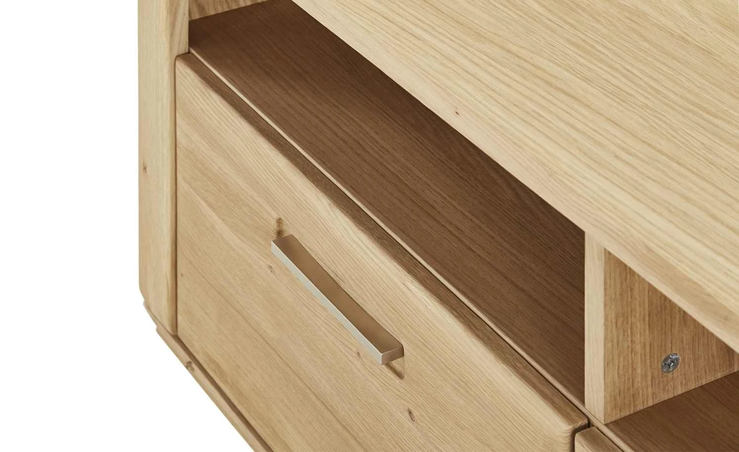 Fernseher, Blu-Ray-Player und Festplattenrecorder sind auf und im TV-Element Dio gut aufgehoben. Die beiden offenen Gerätefächer sind mit Kabelöffnungen in der Rückwand ausgestattet. Direkt unter den offenen Fächern ist Dio außerdem mit zwei Schubladen ausgestattet. Während der Korpus hochwertig furniert ist, besteht die Front aus edlem Massivholz. Die Oberfläche ist zum Schutz des Holzes geölt worden.