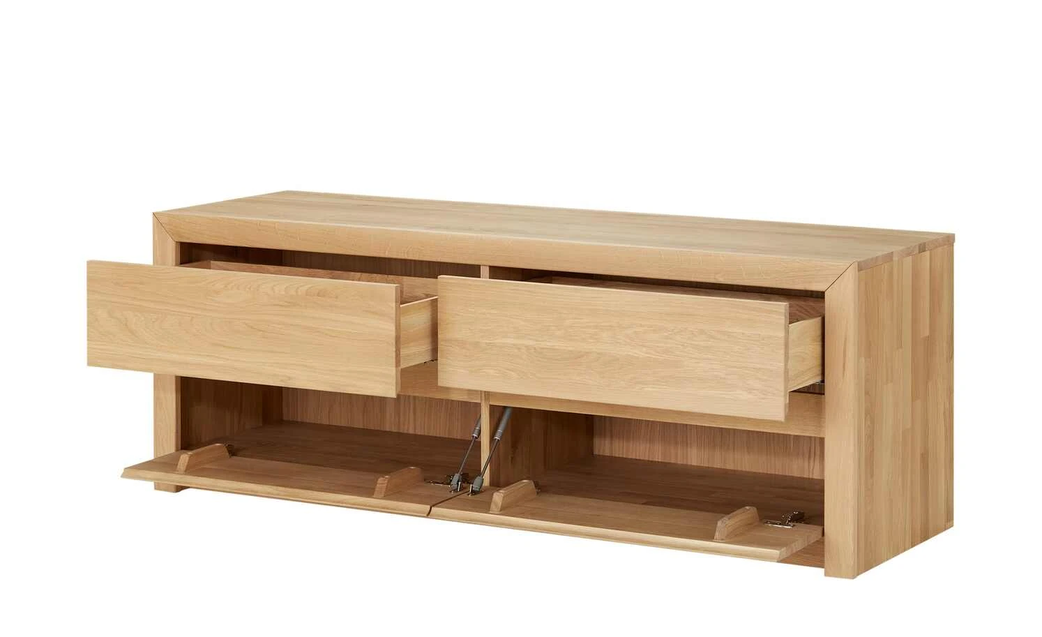 Helles, freundliches Massivholz zeichnet dieses TV-Lowboard aus. Das schön gemaserte Holz aus Eiche Bianco sorgt für natürliches Flair und kann auch zu vorhandenen Möbeln kombiniert werden. Neben der Stellfläche von 51 x 163 Zentimetern bietet das Lowboard auch Stauraum in vier Fächern. Nutzen Sie die oberen beiden Schubfächer für Fernbedienungen und Zubehör und lagern Sie Snacks für den nächsten Filme-Abend ganz einfach hinter den unteren beiden Klappen.