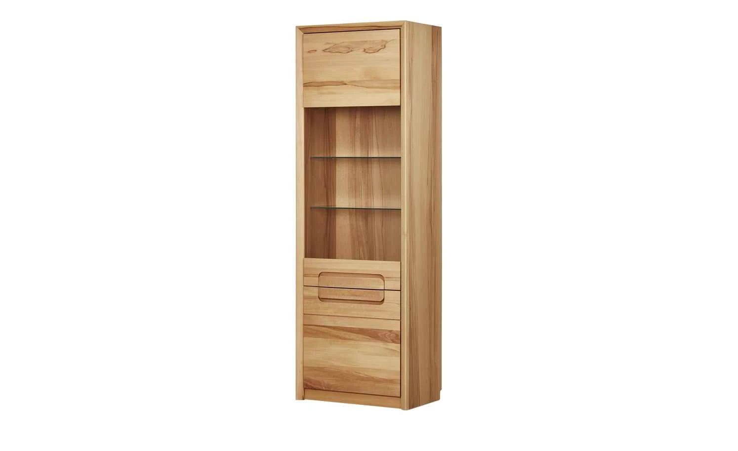 Präsentieren Sie schöne Gläser oder Porzellan in der Vitrine Solo. Die Vitrine hat drei Fächer mit Glasböden. Sie werden durch die mitgelieferte Beleuchtung ins rechte Licht gerückt. Die obere Tür ist in Höhe der Vitrinenfächer mit Glas abgesetzt. Für einen freien Blick ins Innere. Darüber hinaus gibt es drei Fächer, die bei geschlossenen Türen vor neugierigen Blicken versteckt werden. Solos Korpus ist mit Kerbuche furniert. Die Front besteht aus massiver Kernbuche.
